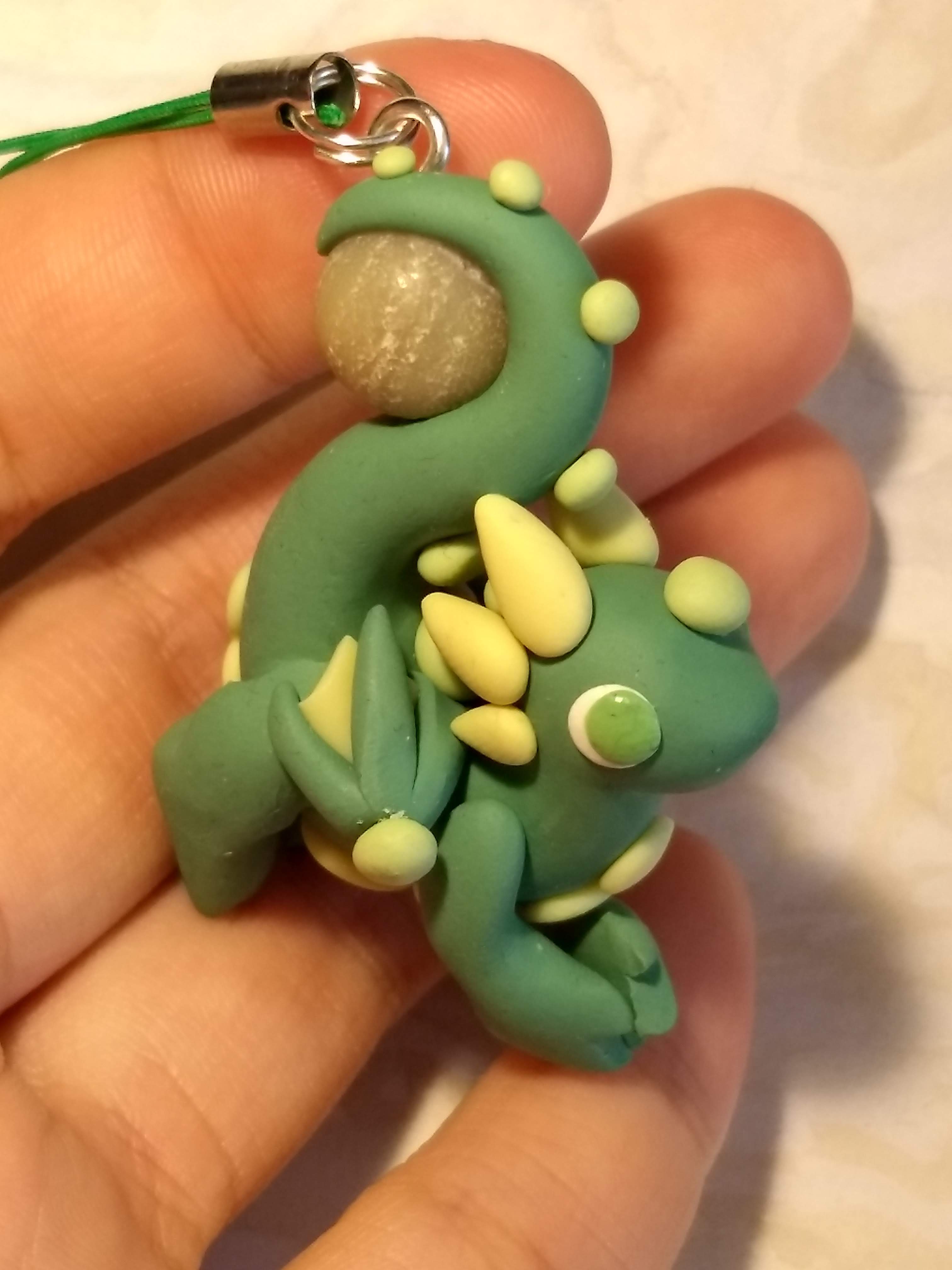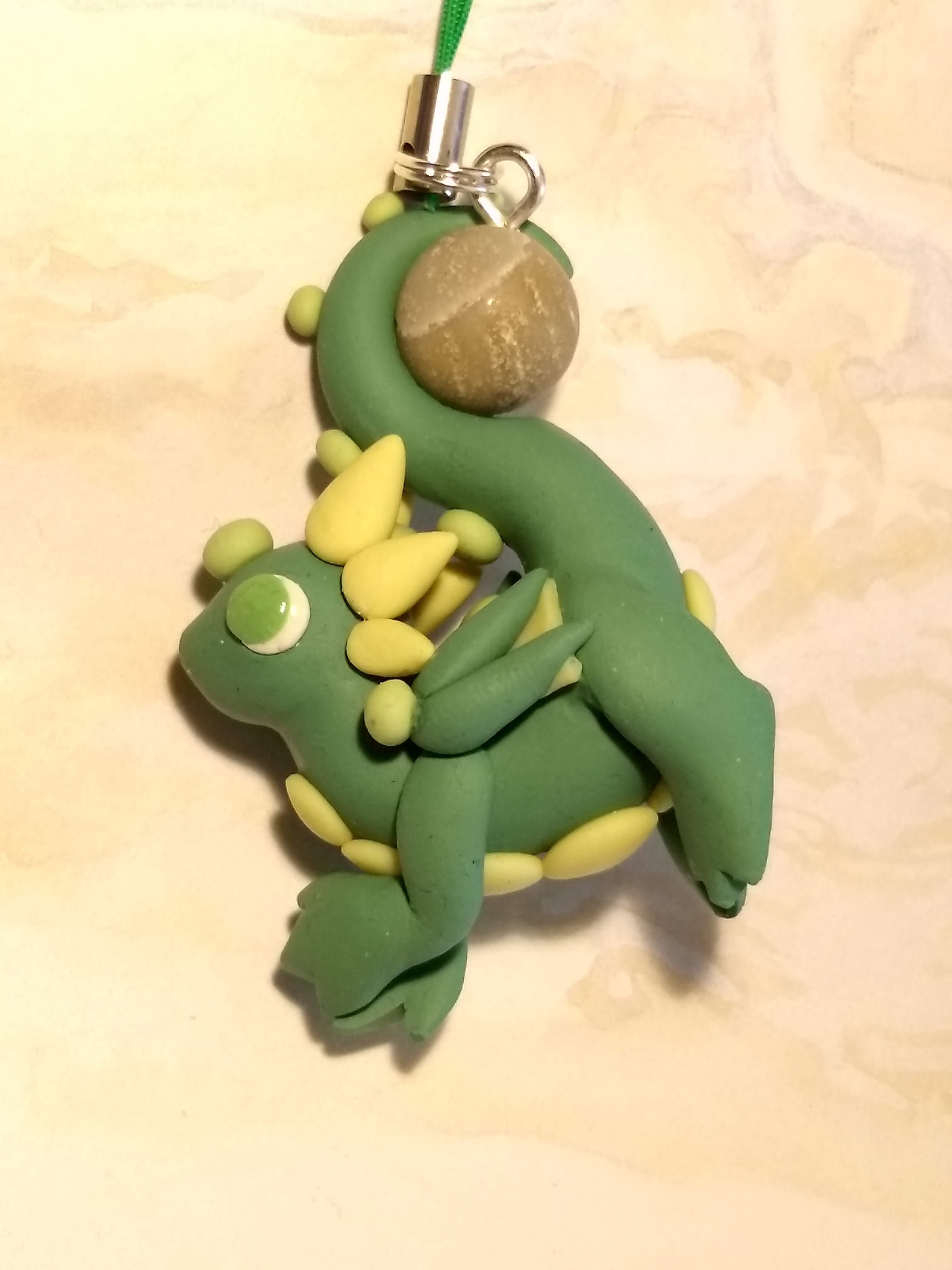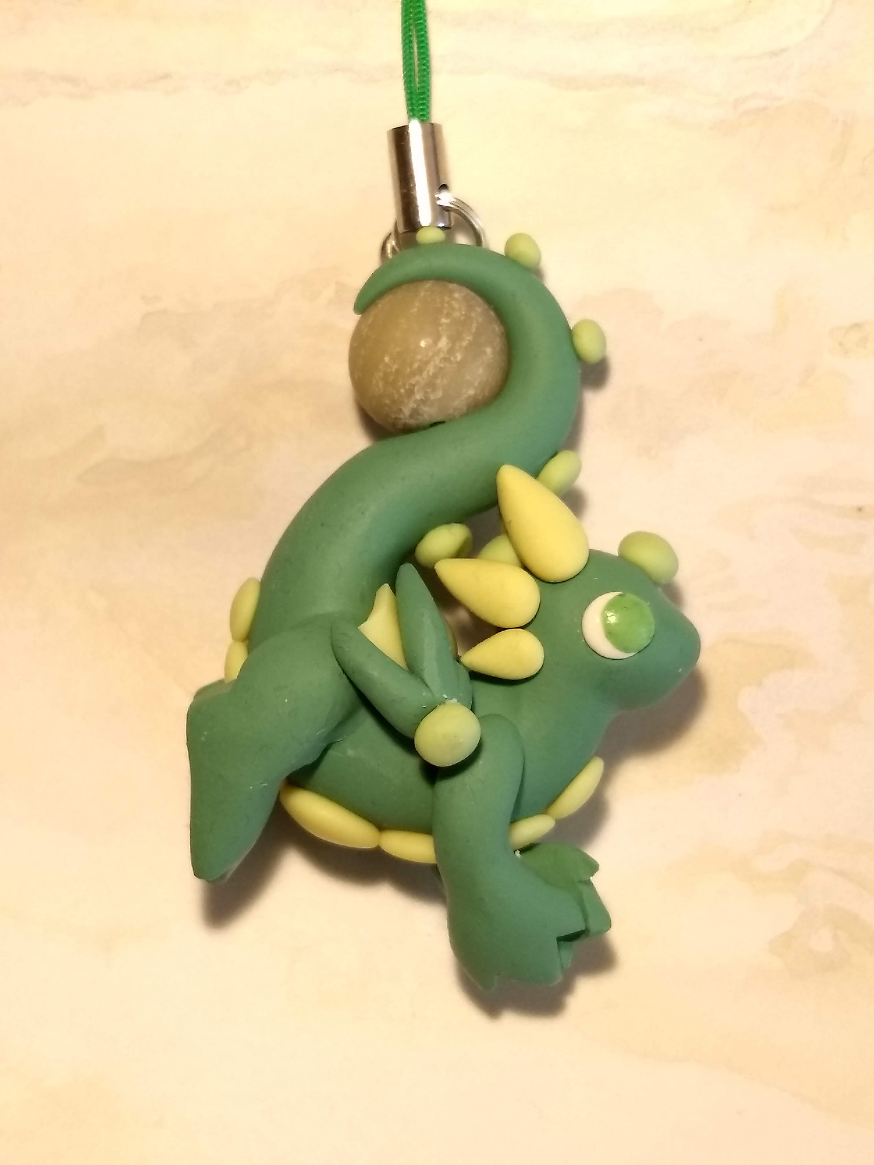 A handmade dragon charm created from polymer clay. This dragon hangs from a stone bead and looks outwards.