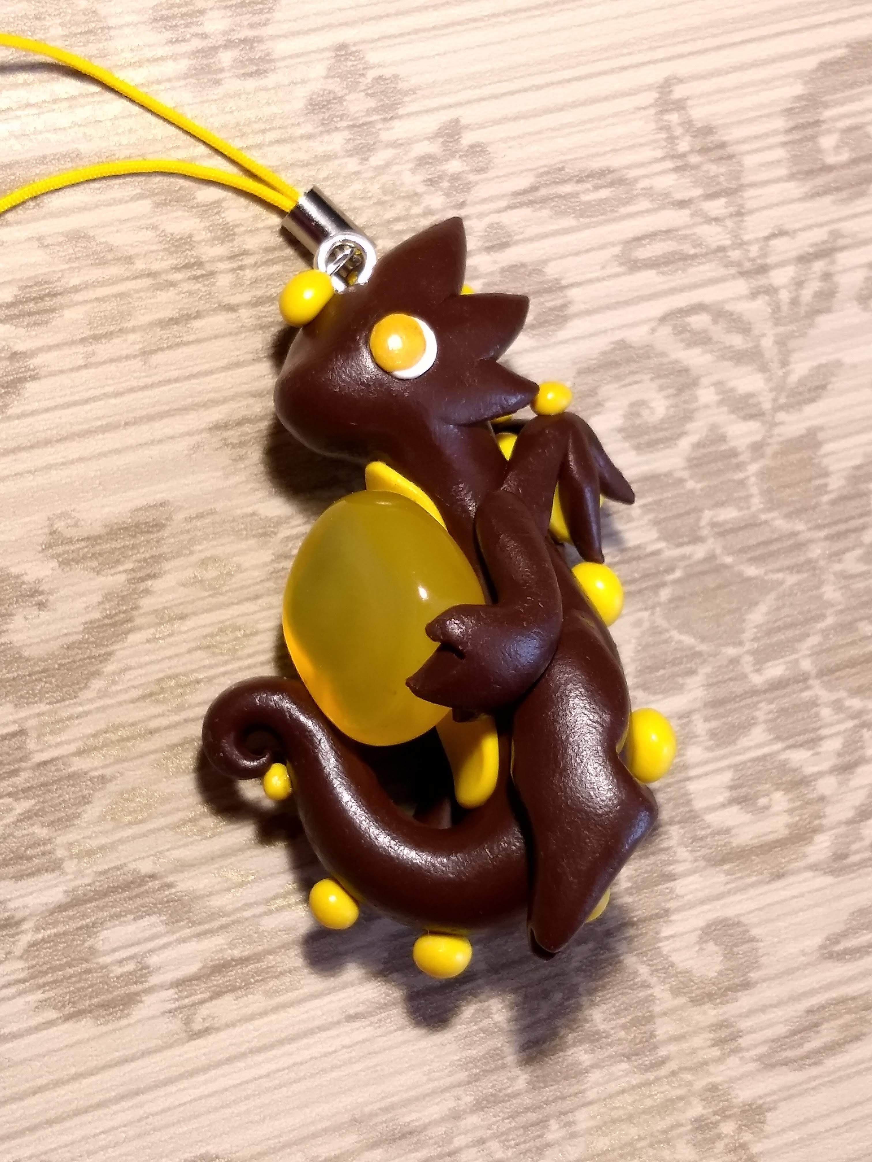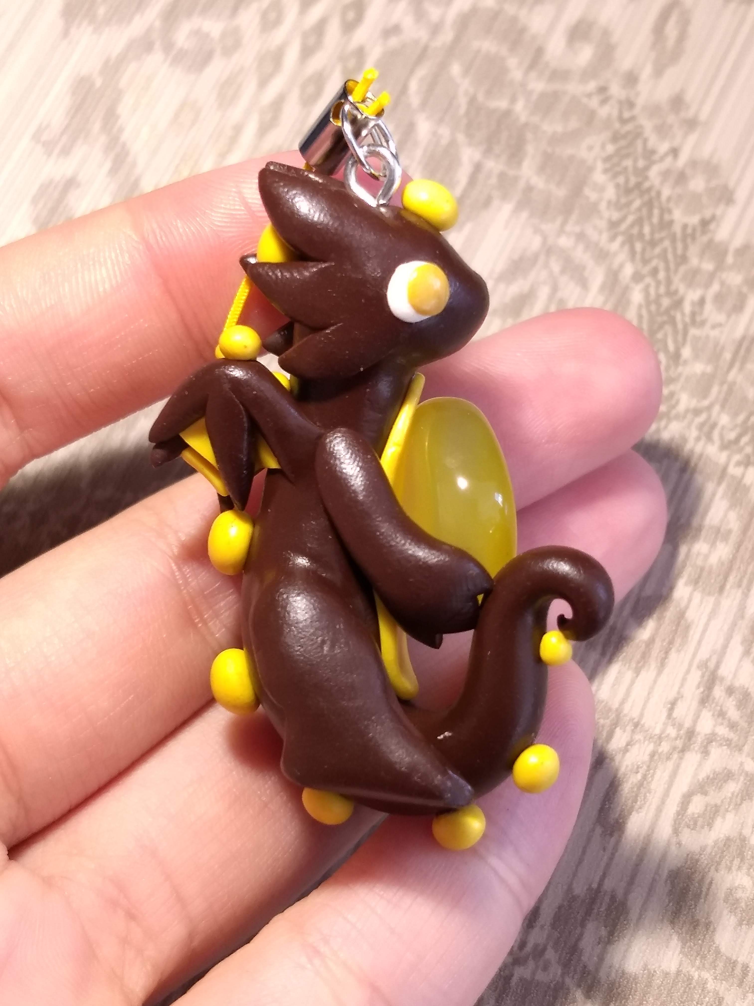 A dragon charm that's handmade from polymer clay. This one holds a translucent yellow stone.