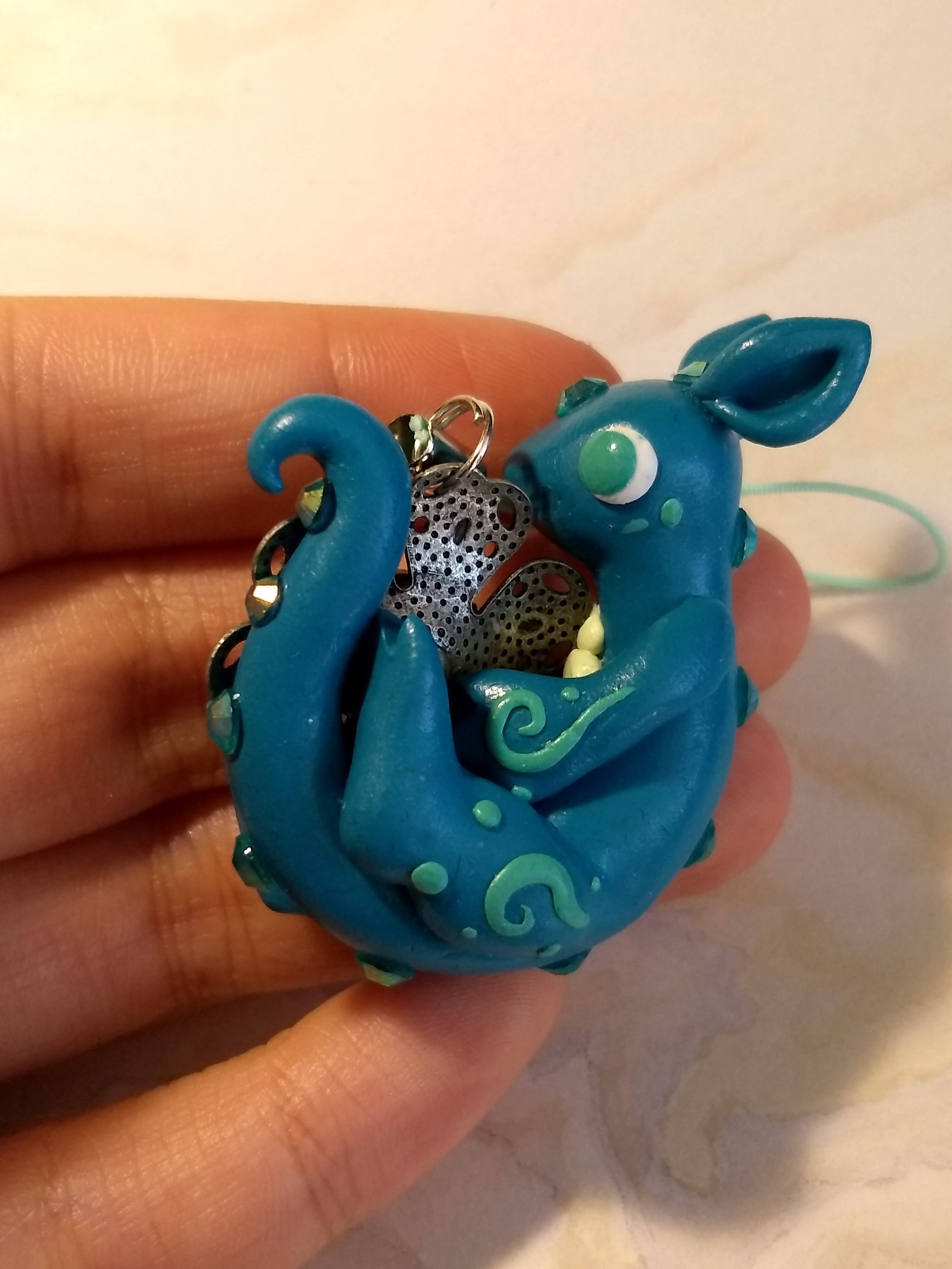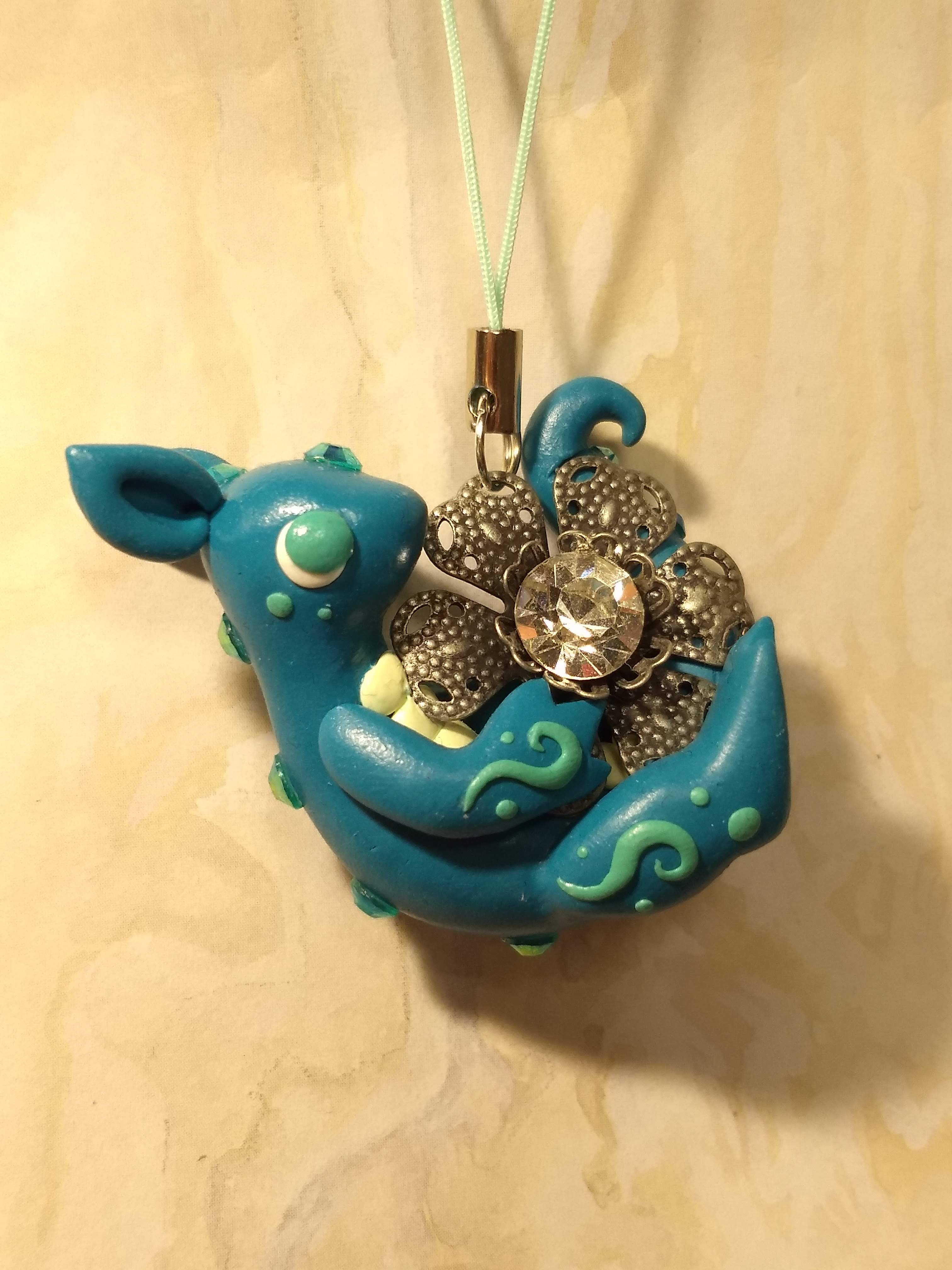 A dragon charm that's handmade from polymer clay. This one has curly patters on its body and hugs a silver flower.