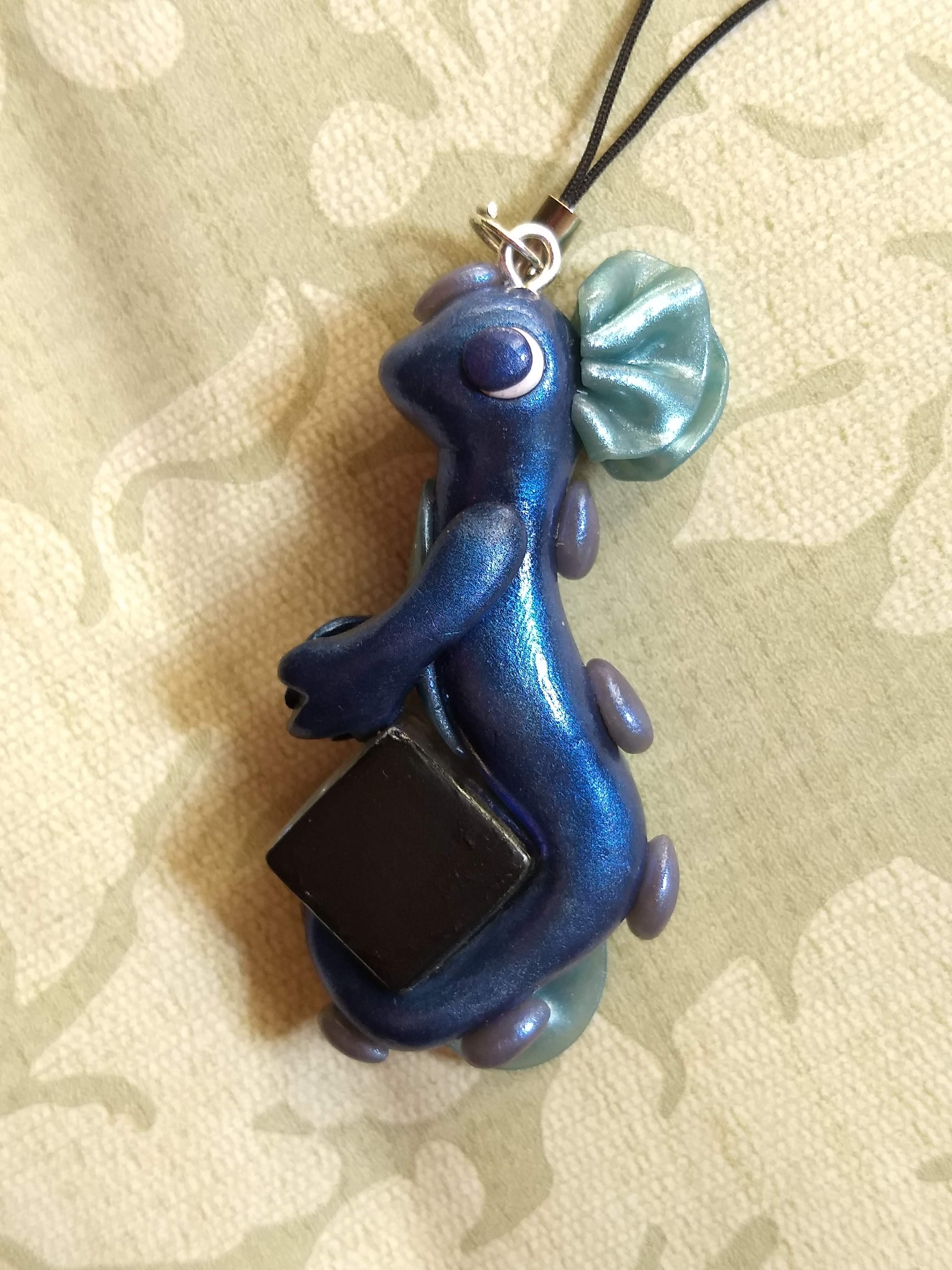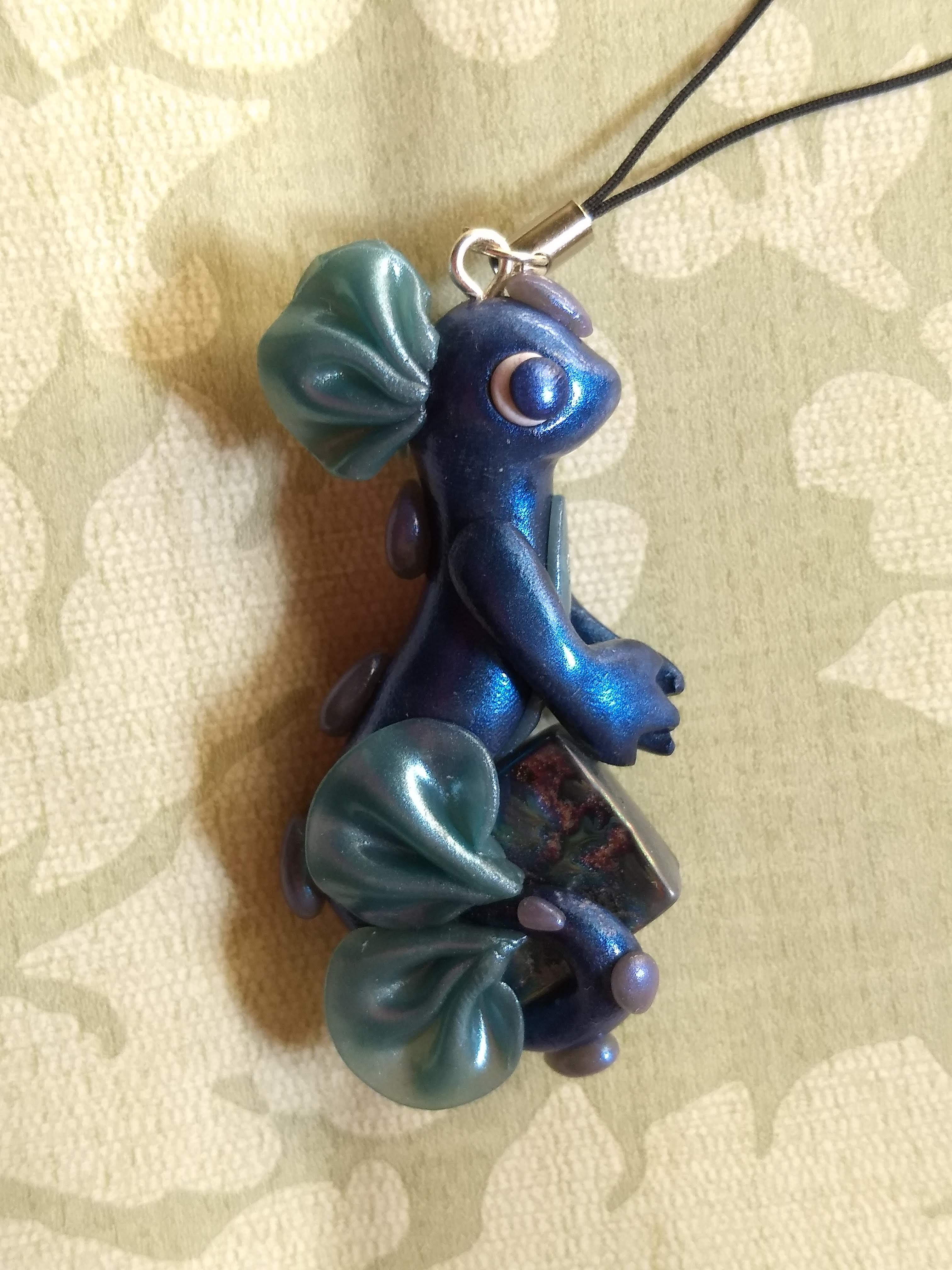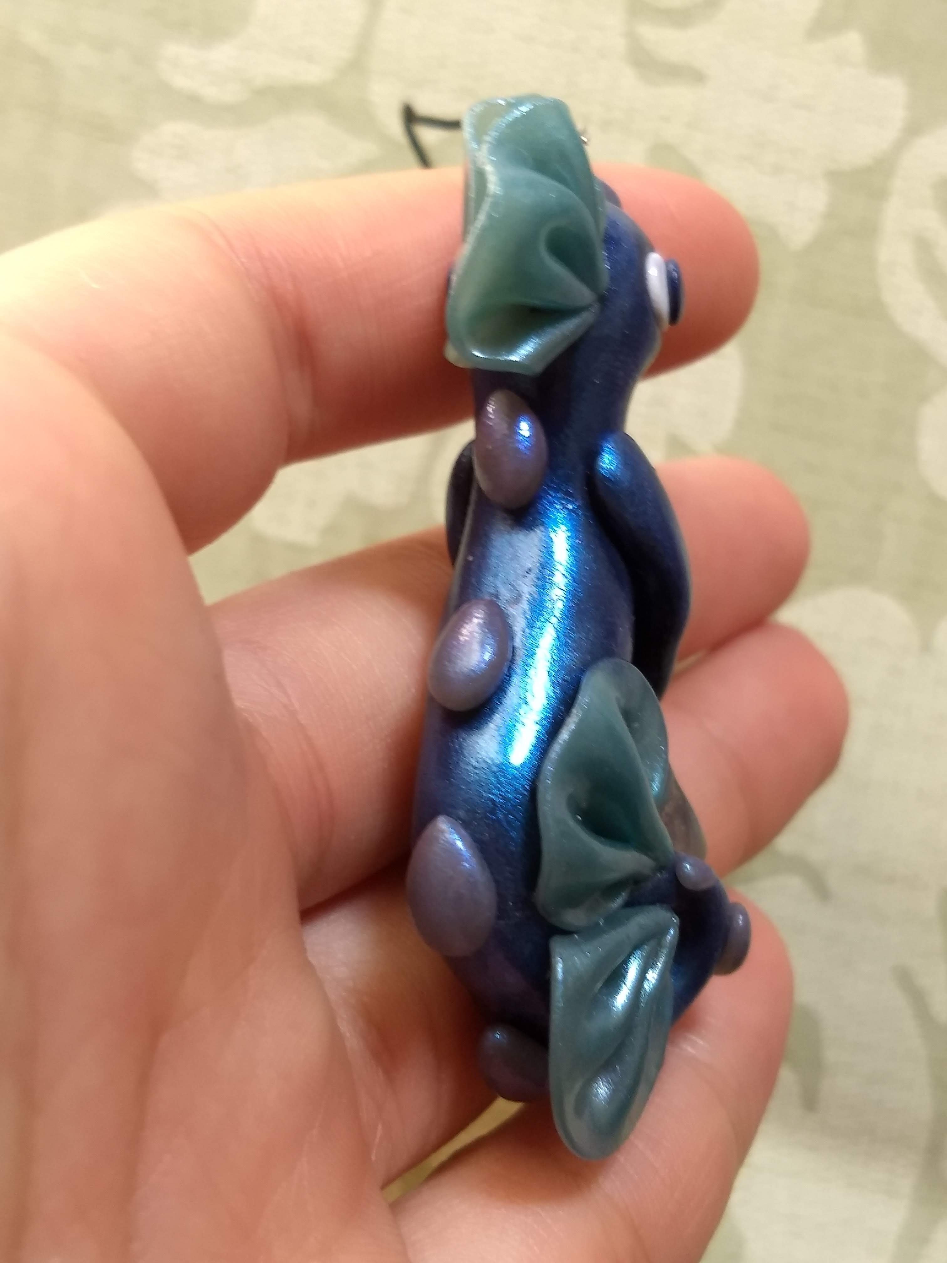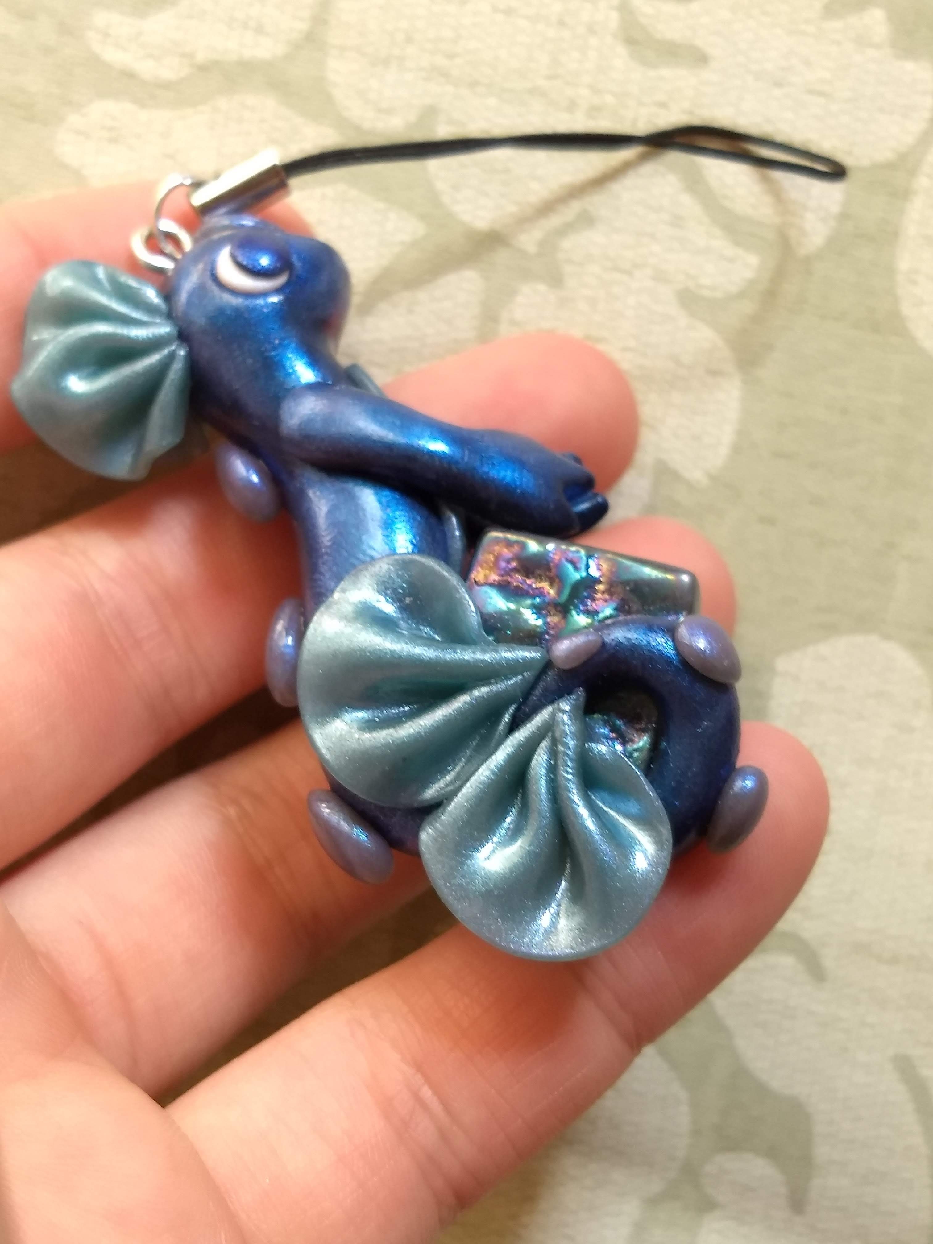 A mermaid dragon that is handmade from polymer clay. This one has been sealed with gloss varnish for maximum shine and holds a shiny glass square.