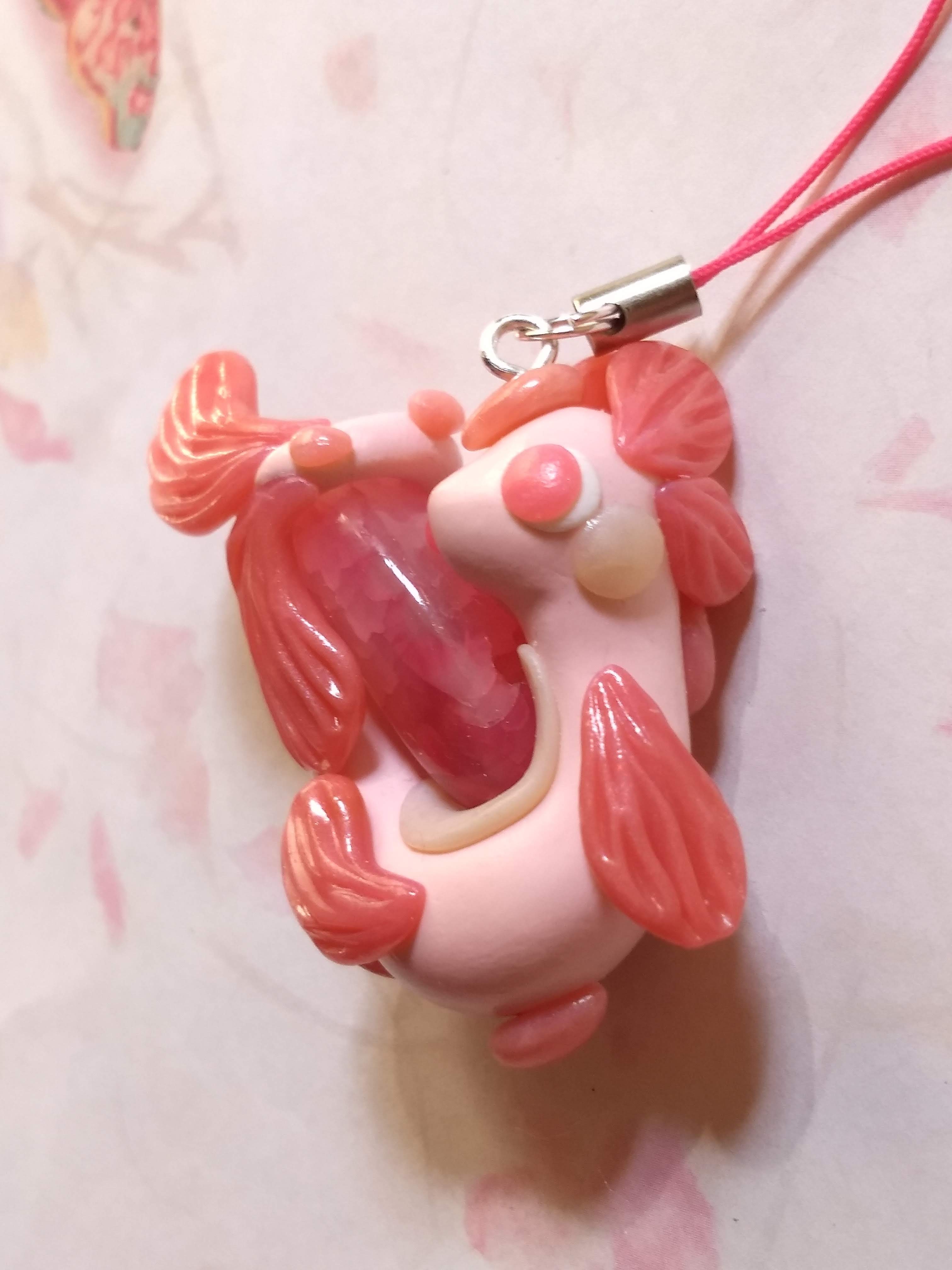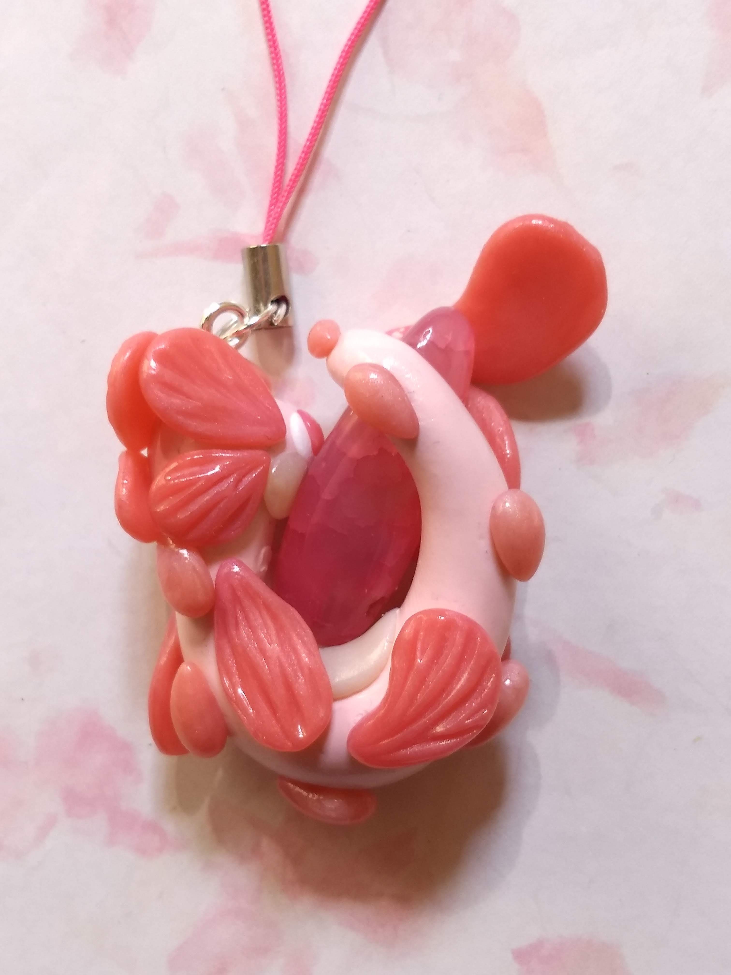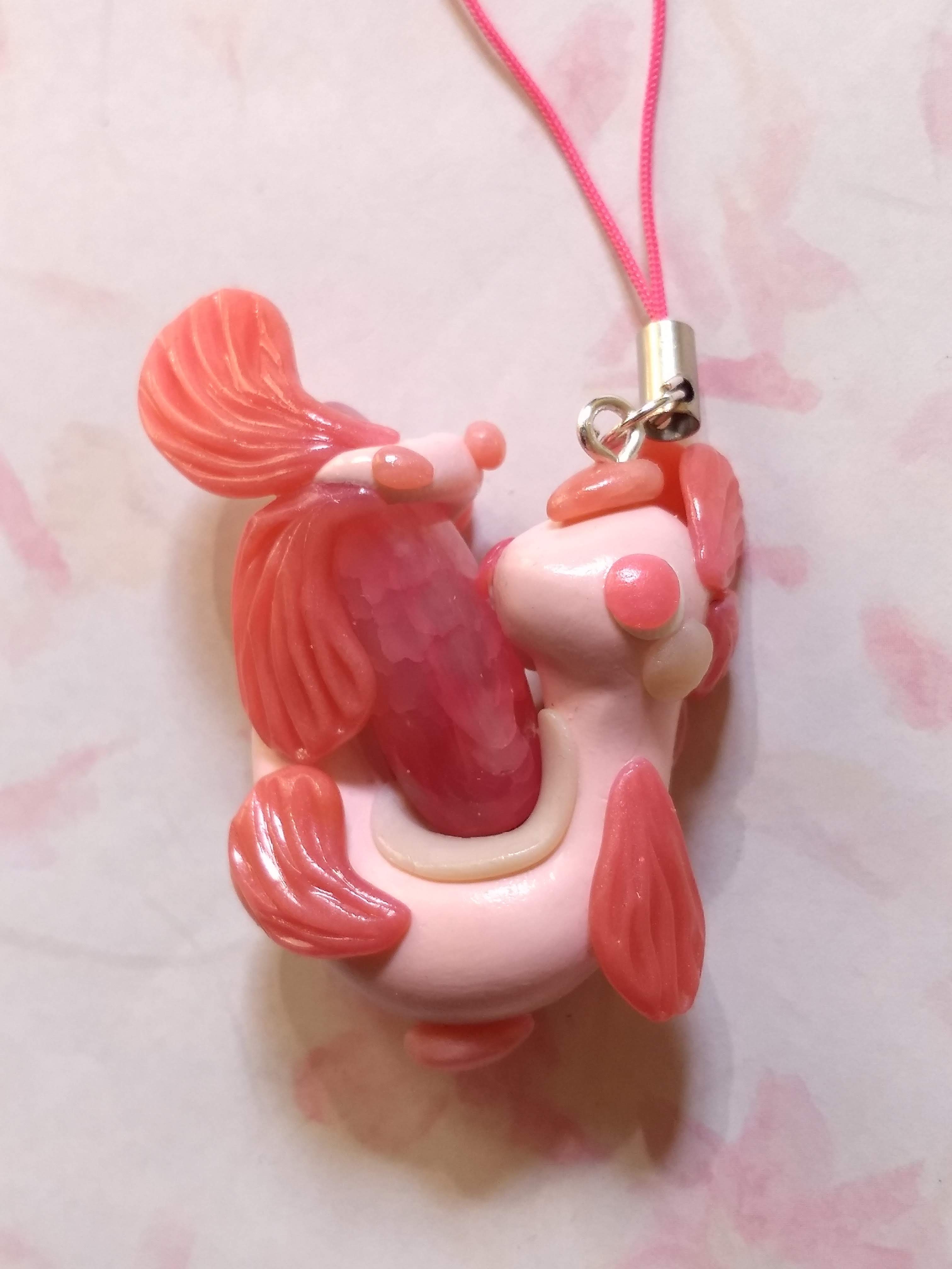 A mermaid dragon that's handmade from polymer clay. This one has shimmery pink fins and has its tail wrapped around a pink stone.