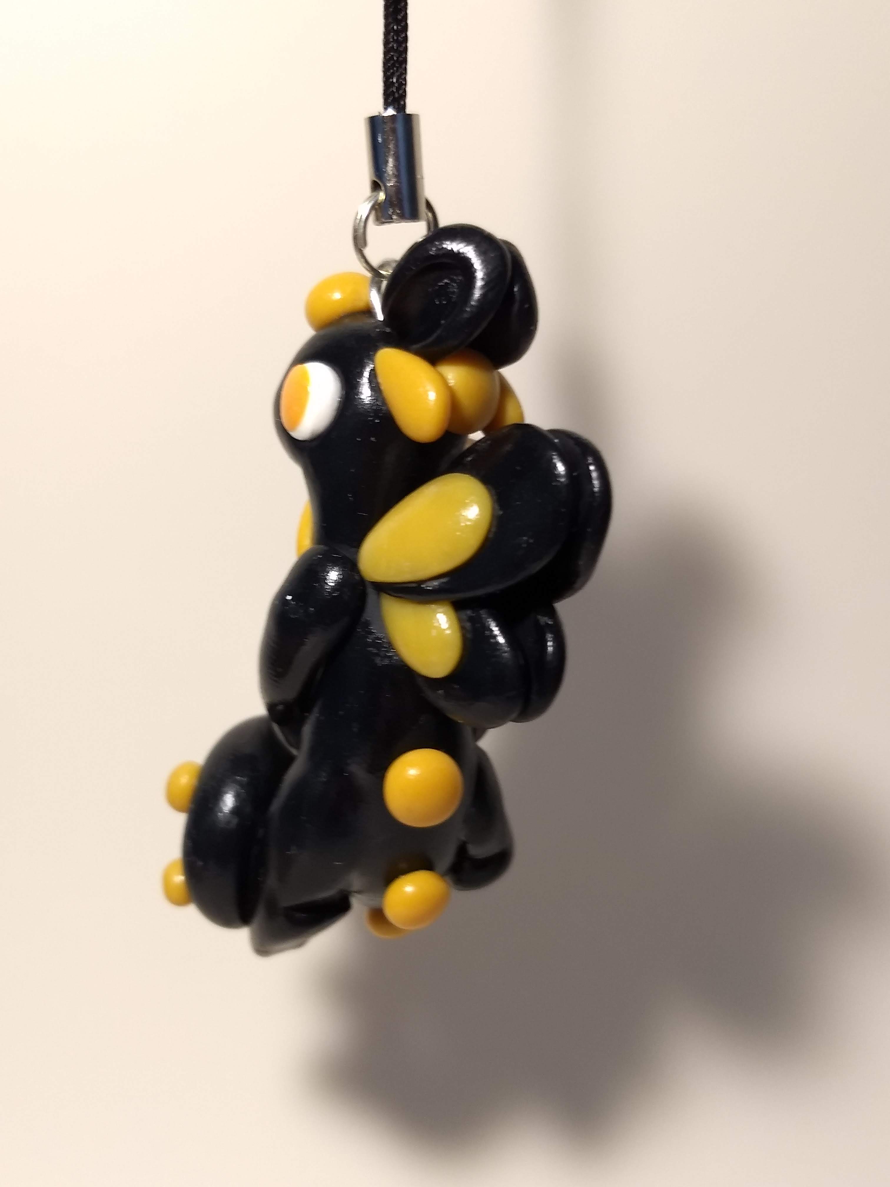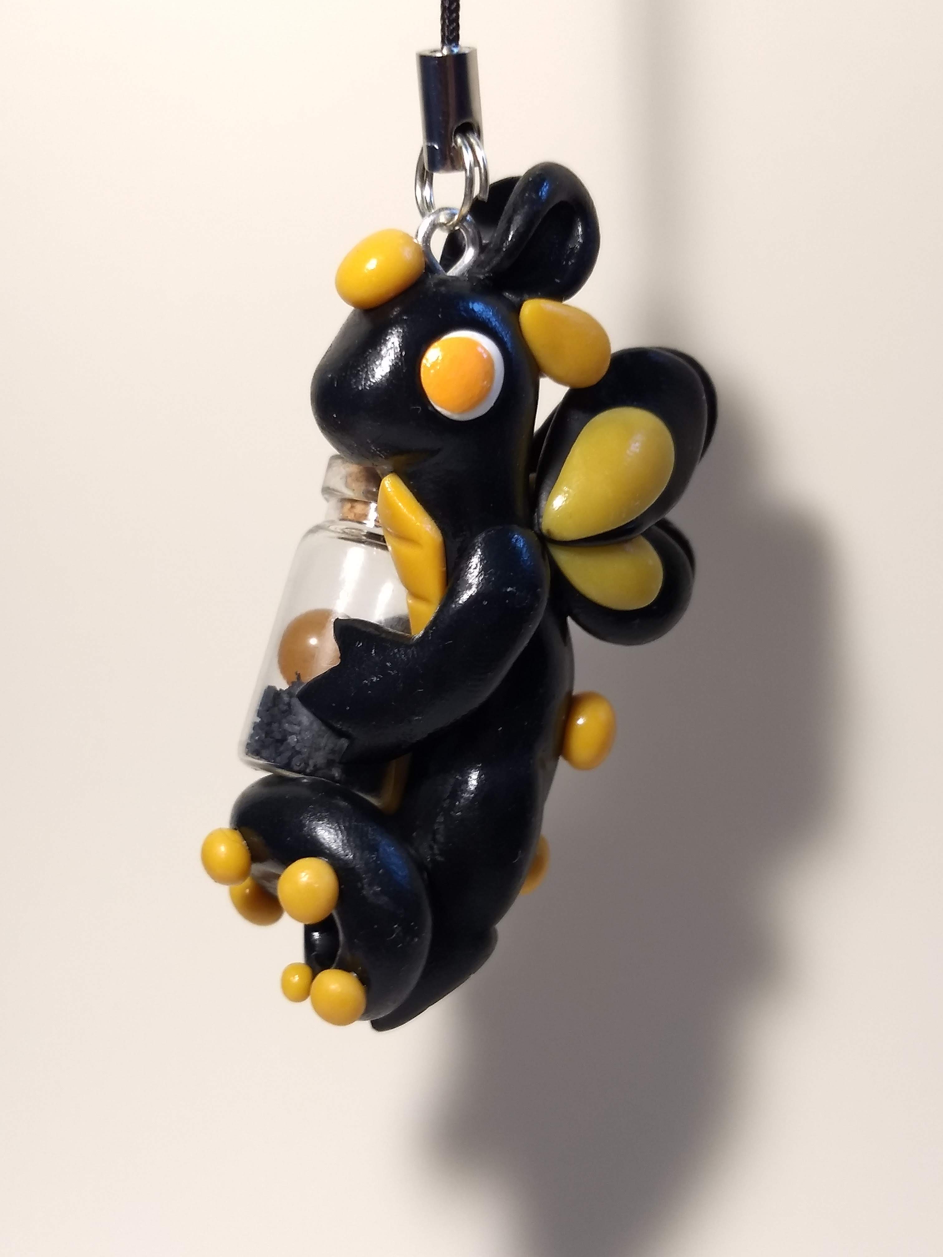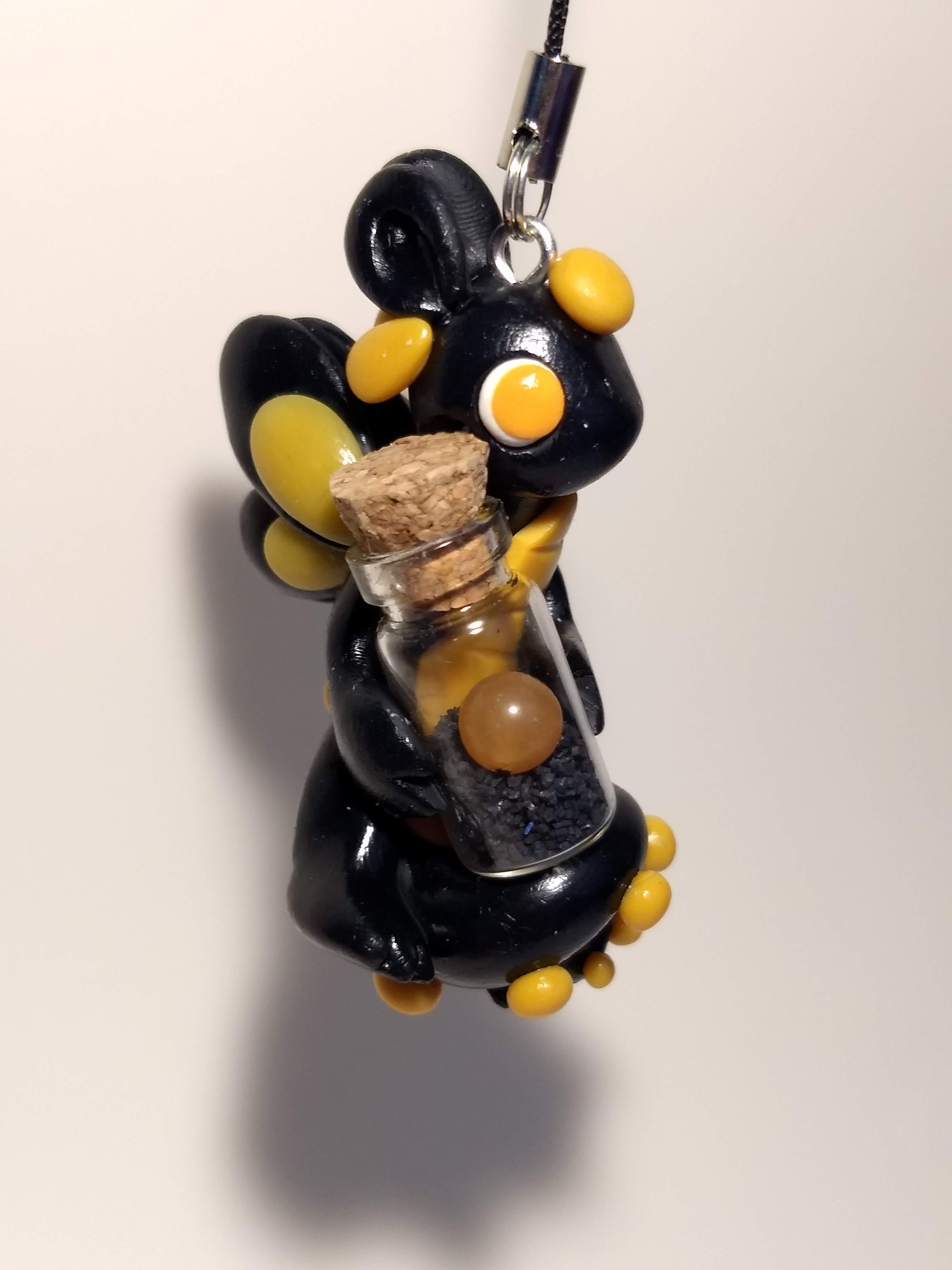 A dragon that is handmade from polymer clay. This one holds a small bottle filled with black sand and an orange orb.