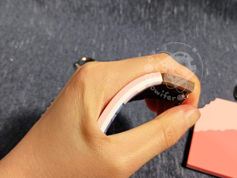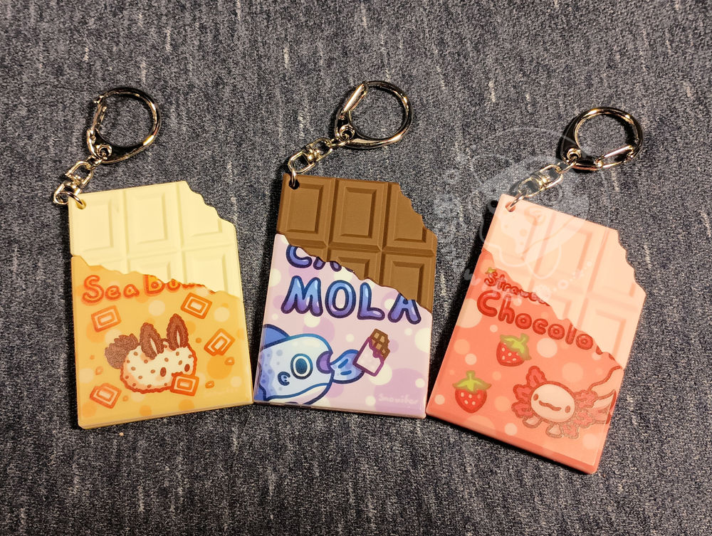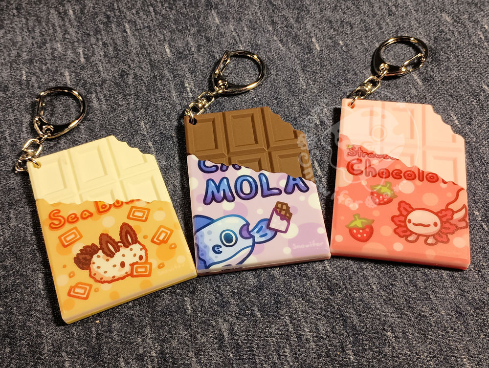 Rubber chocolate keychains featuring mola milk chocolate, strawberry axolotl chocolate and white sea bunny chocolate.