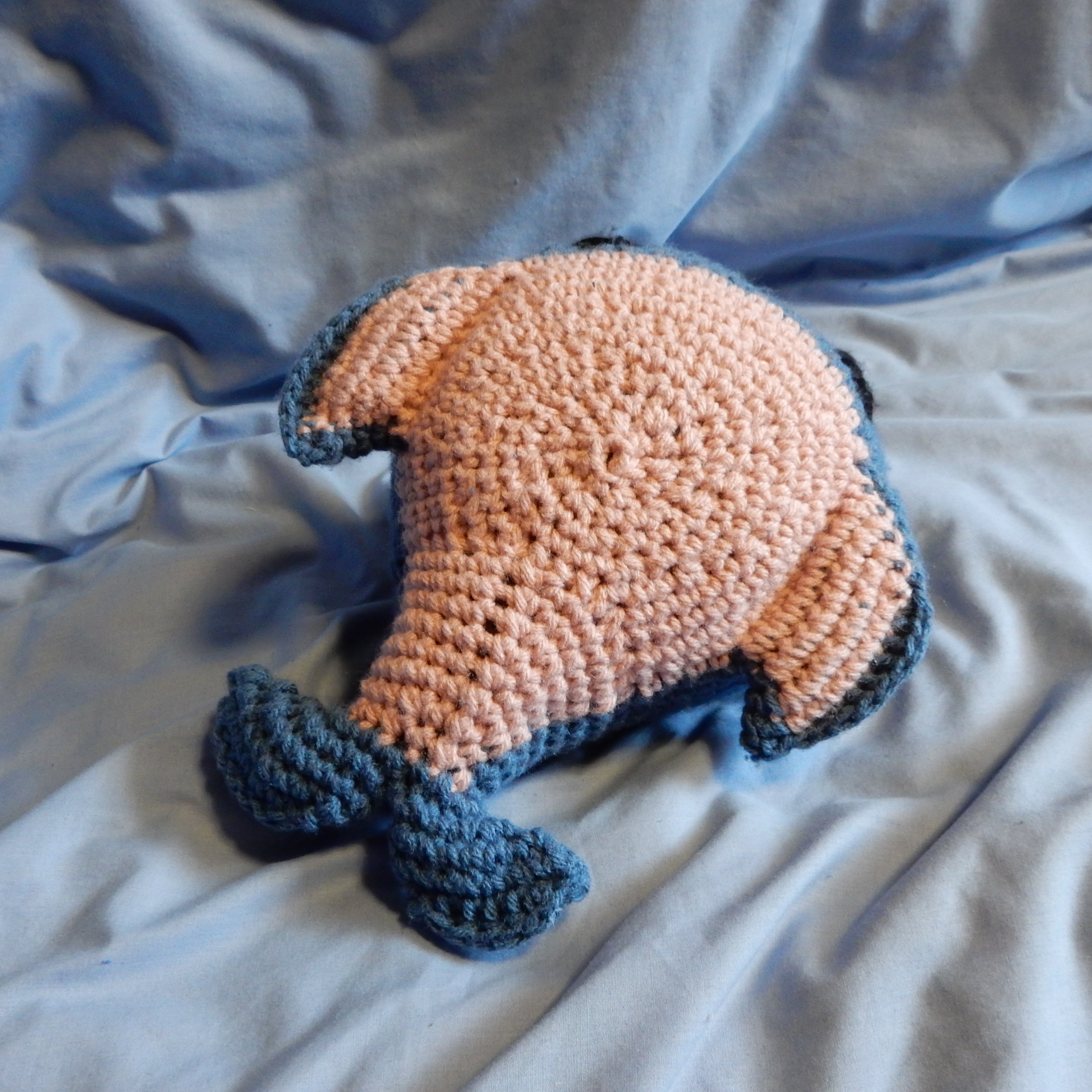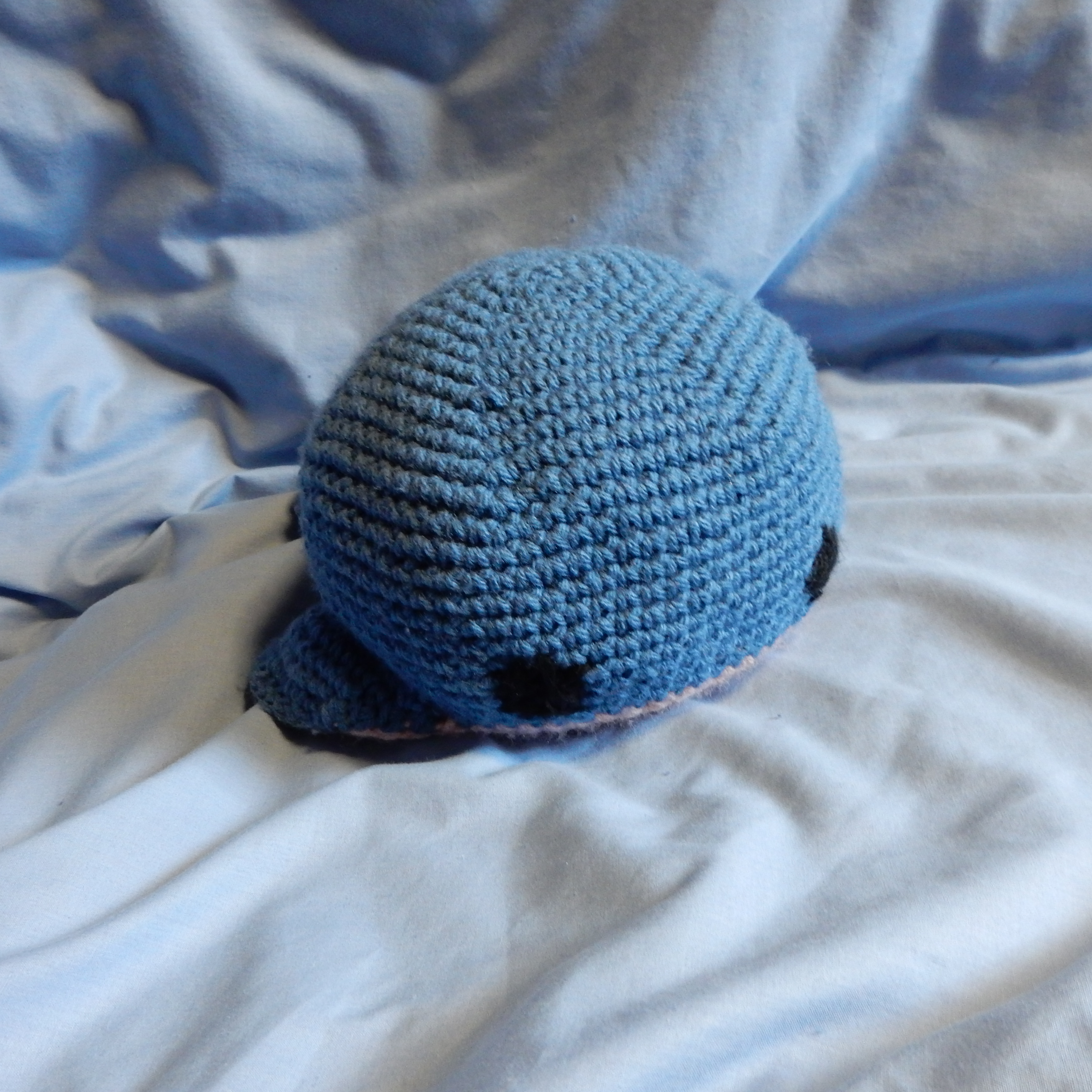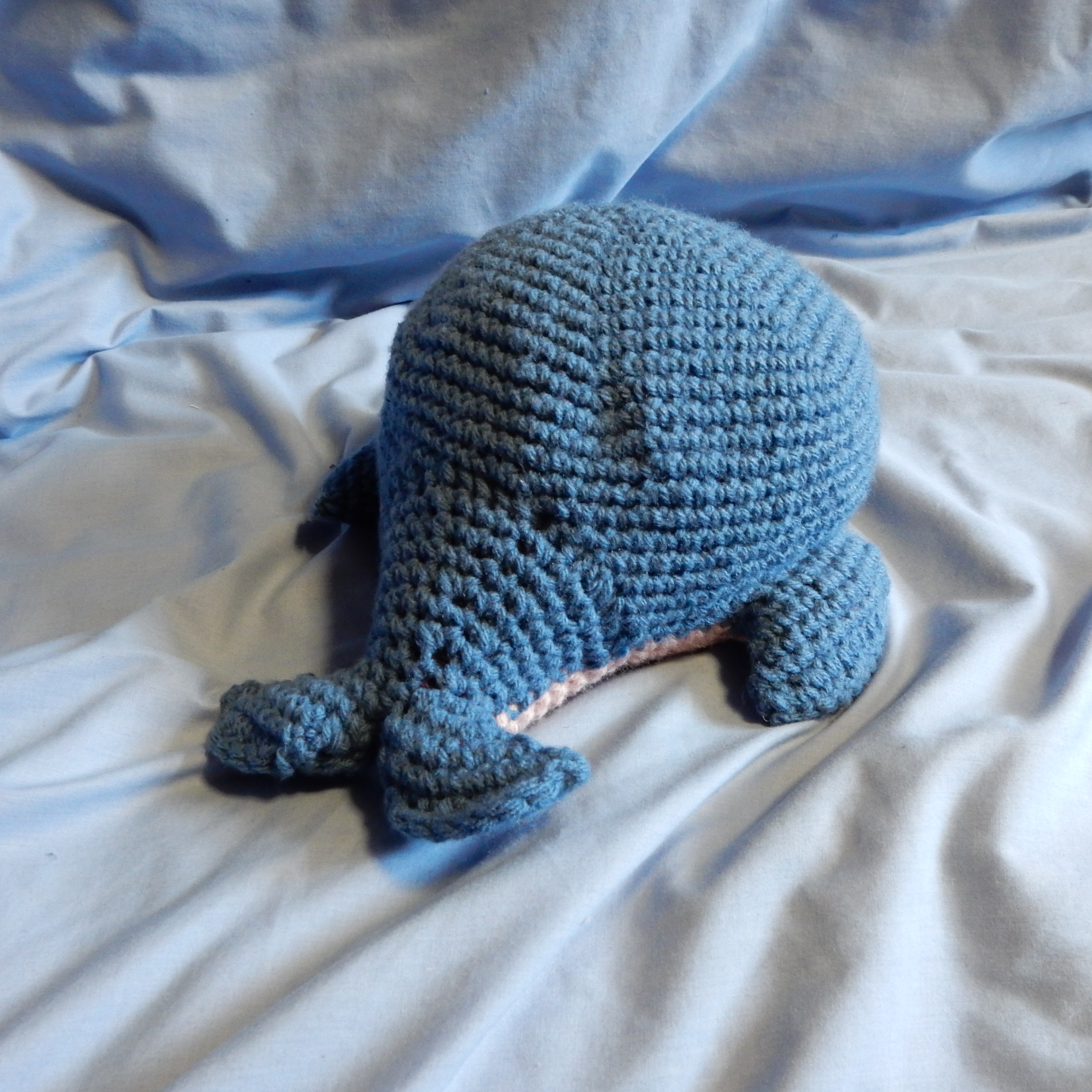 A whale plush crocheted from acrylic yarn. Stuffed with fabric scraps. Sits at about 5" tall.