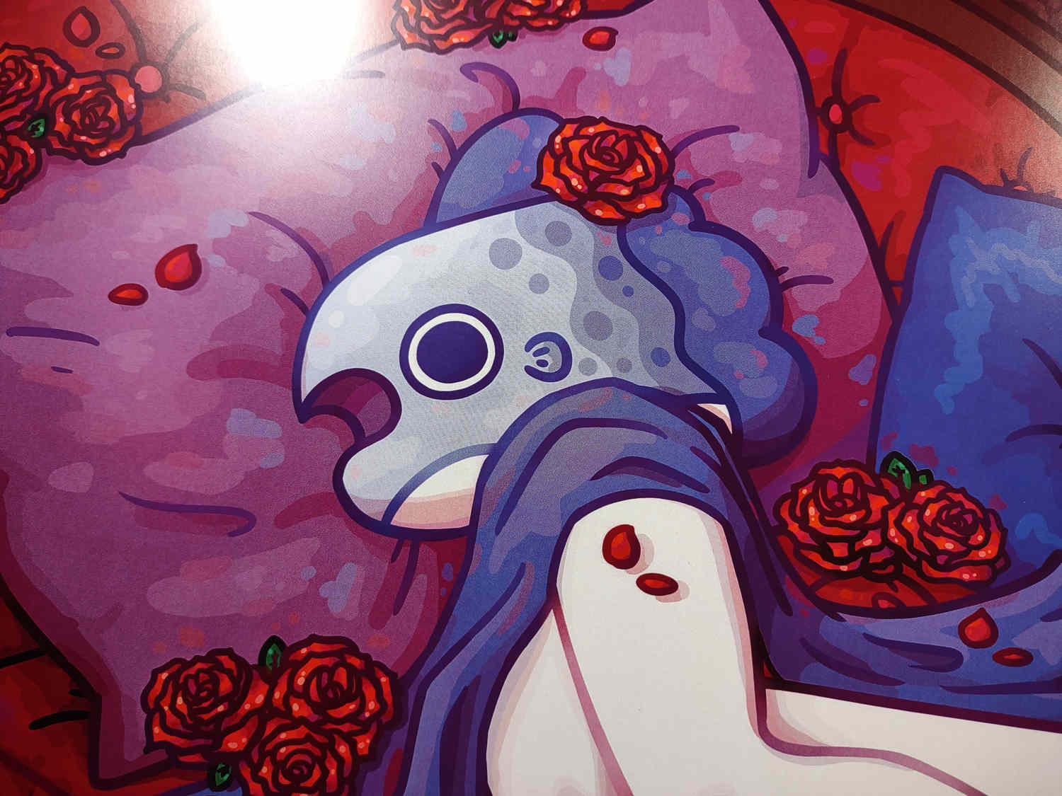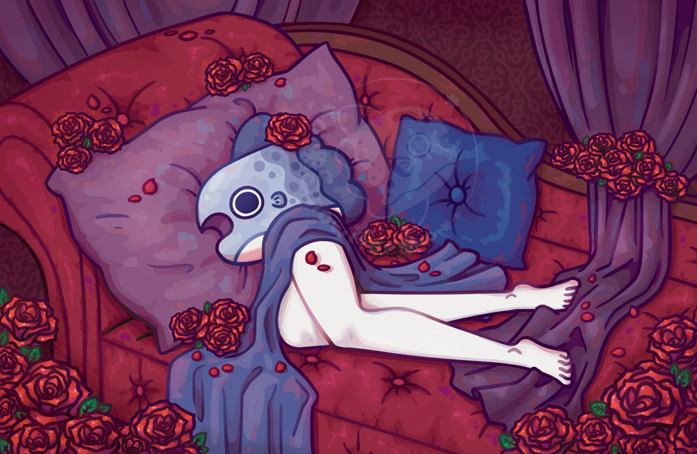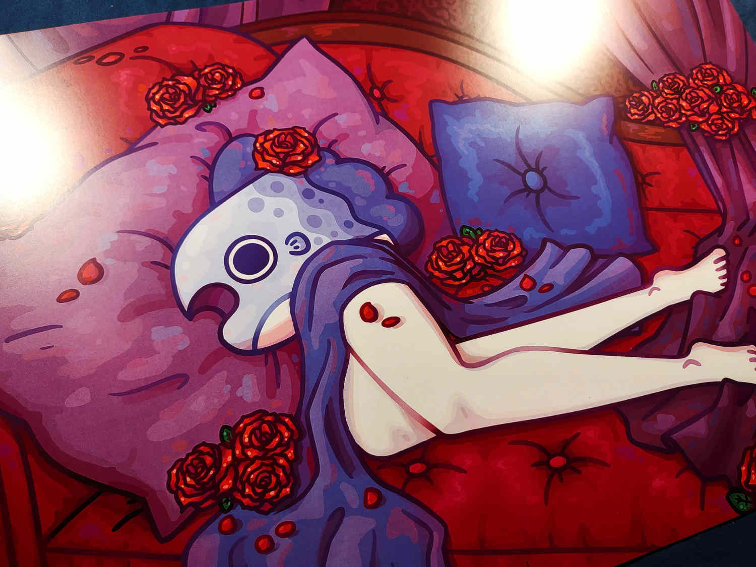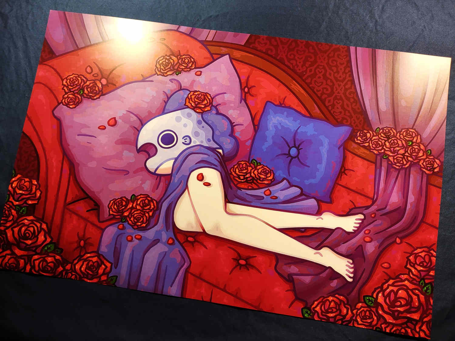 A print of a mola laying on a red couch surrounded by roses