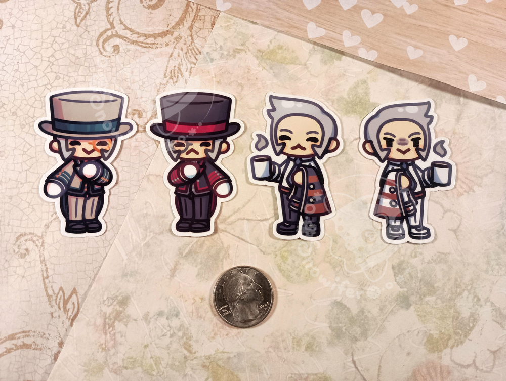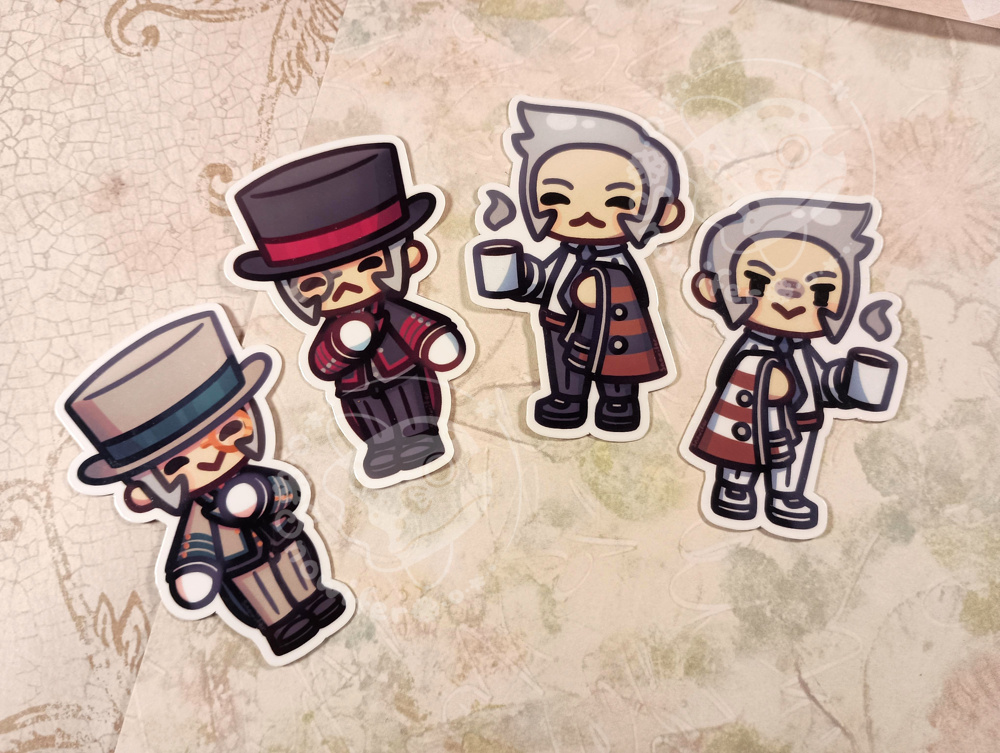 Chibi stickers of the Subway Masters Emmet and Ingo in their tea party outfits or getting ready for work.