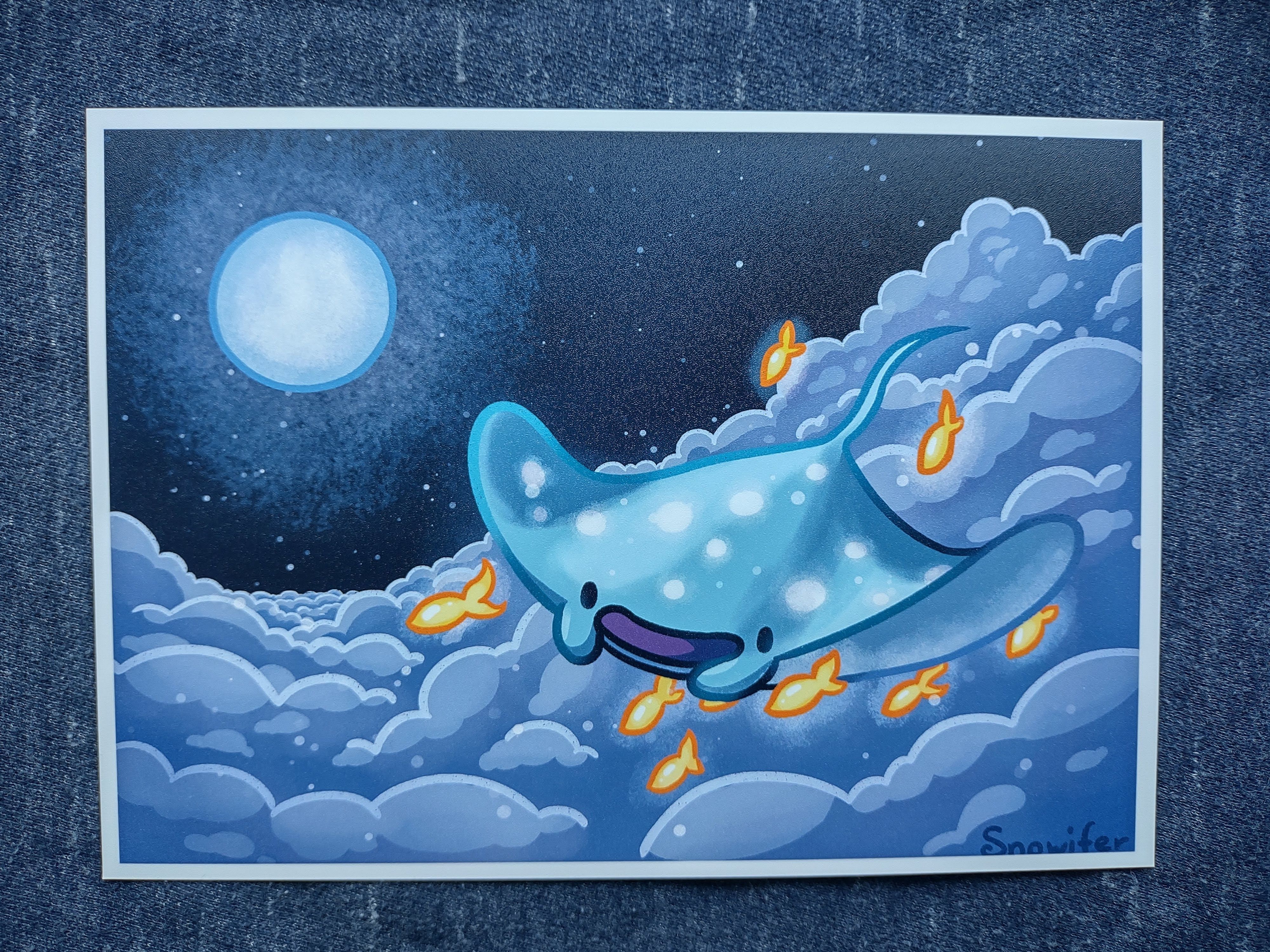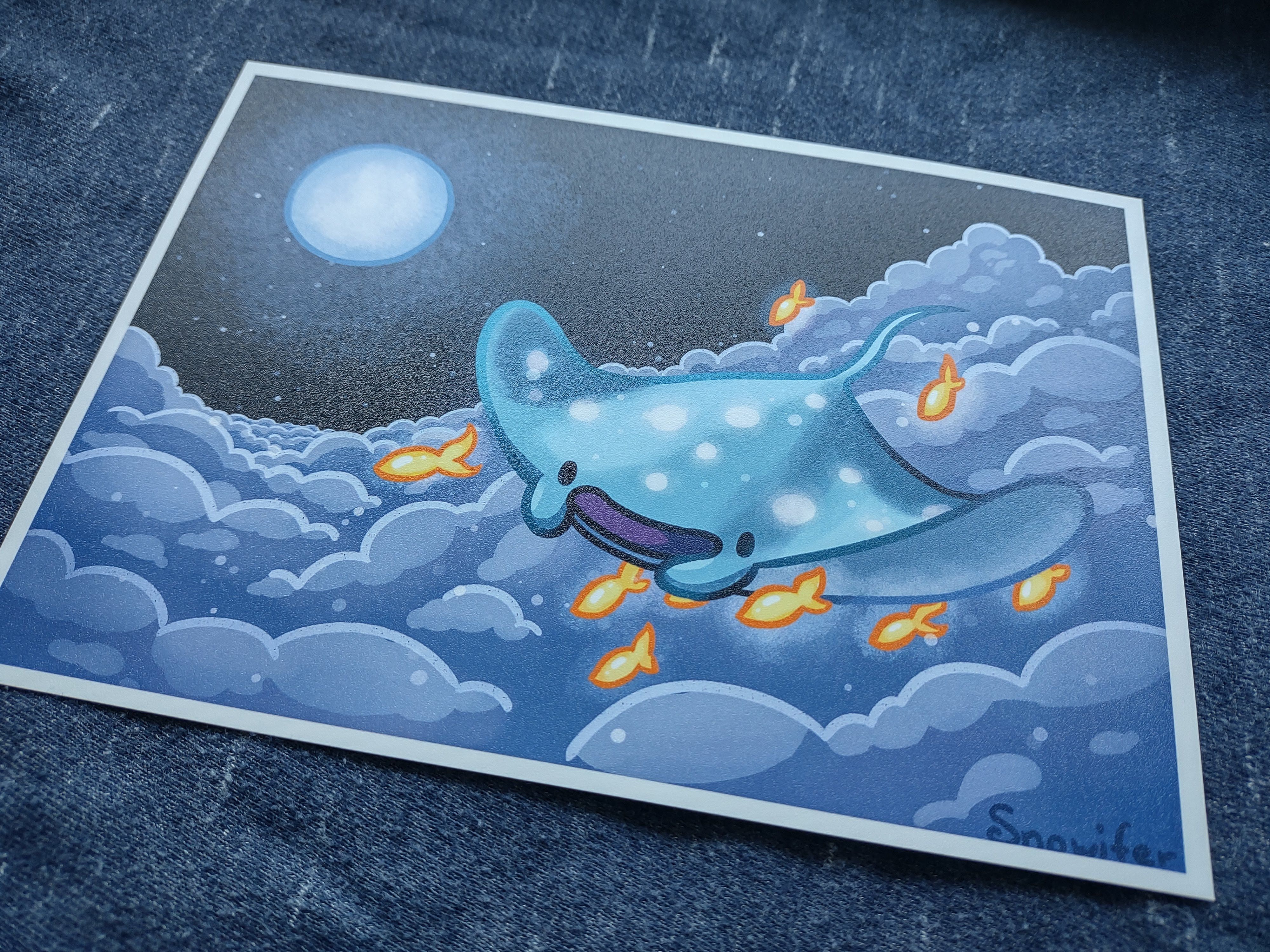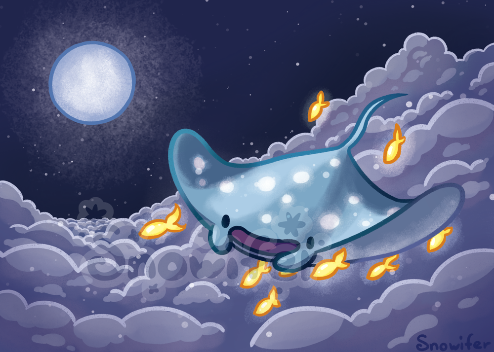 A 5x7 inch print of a manta ray swimming in the night sky with some small friends.