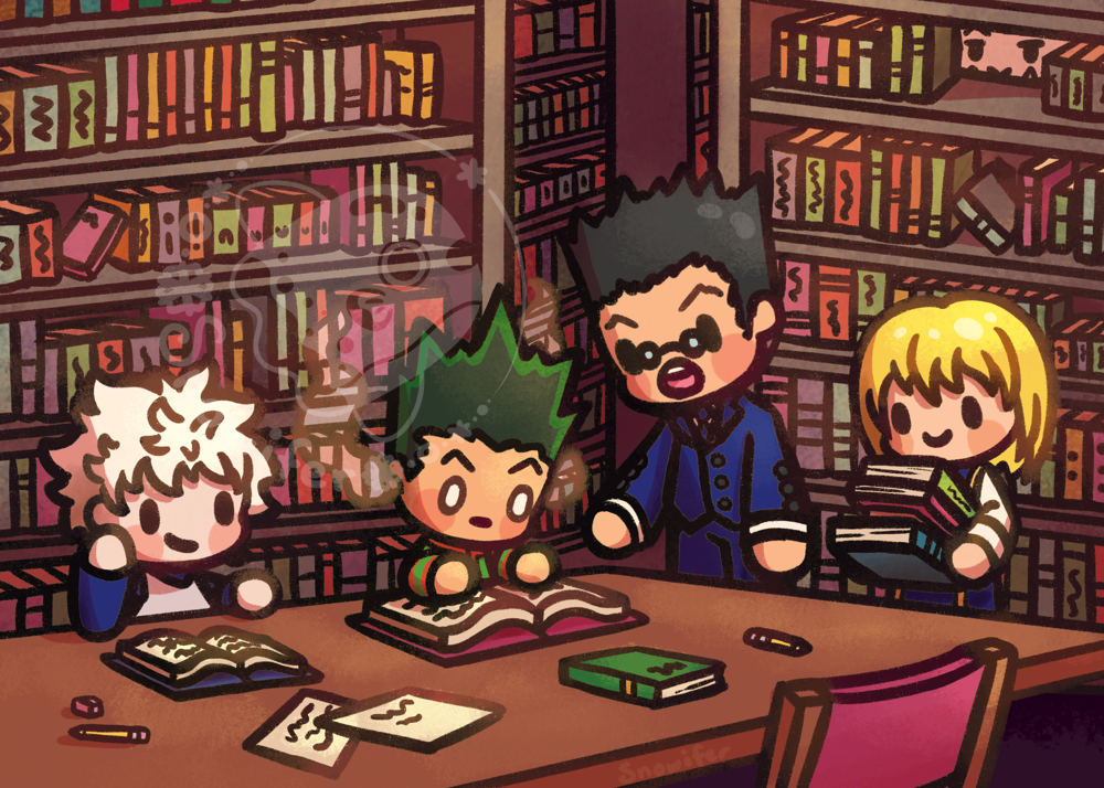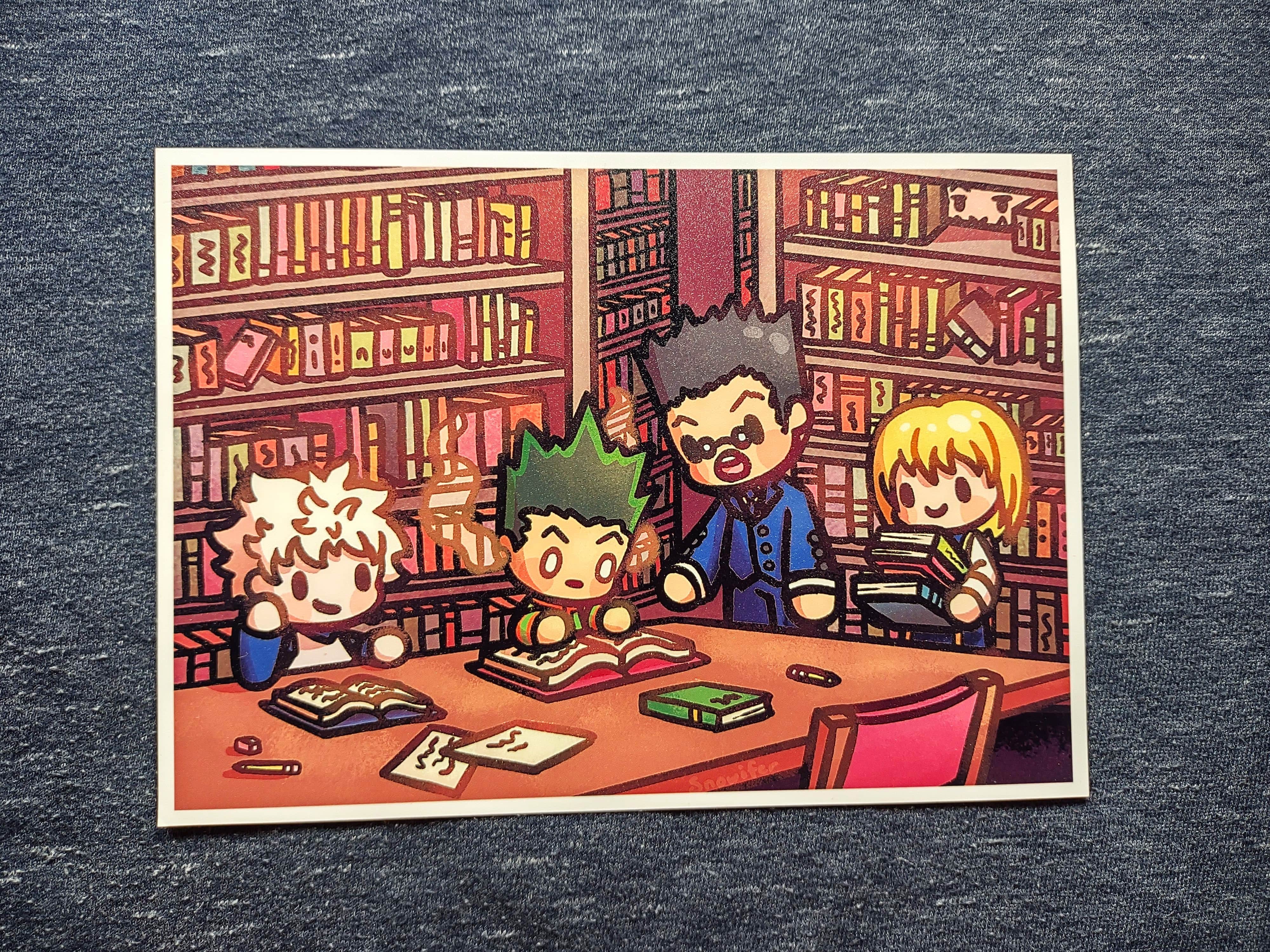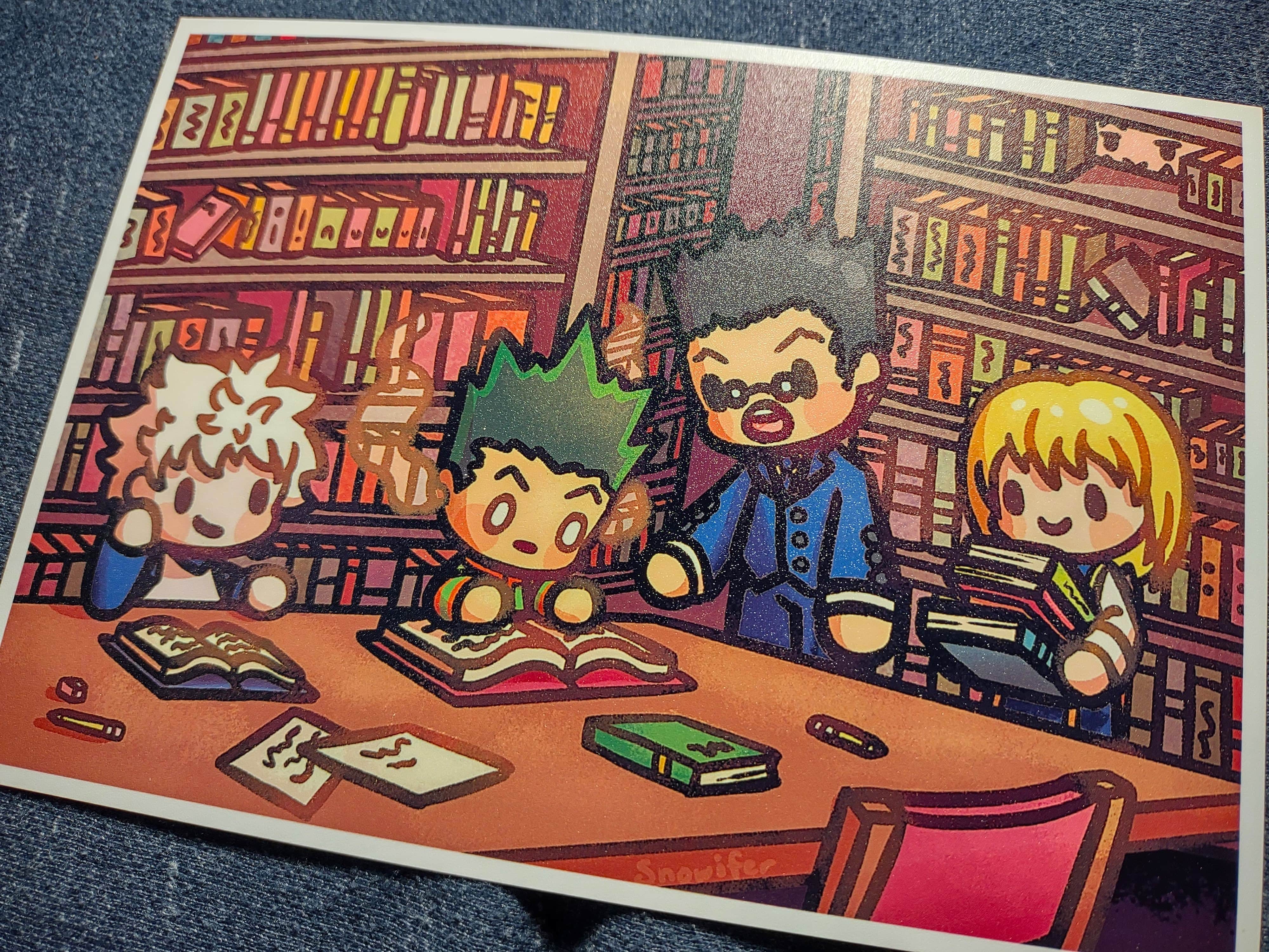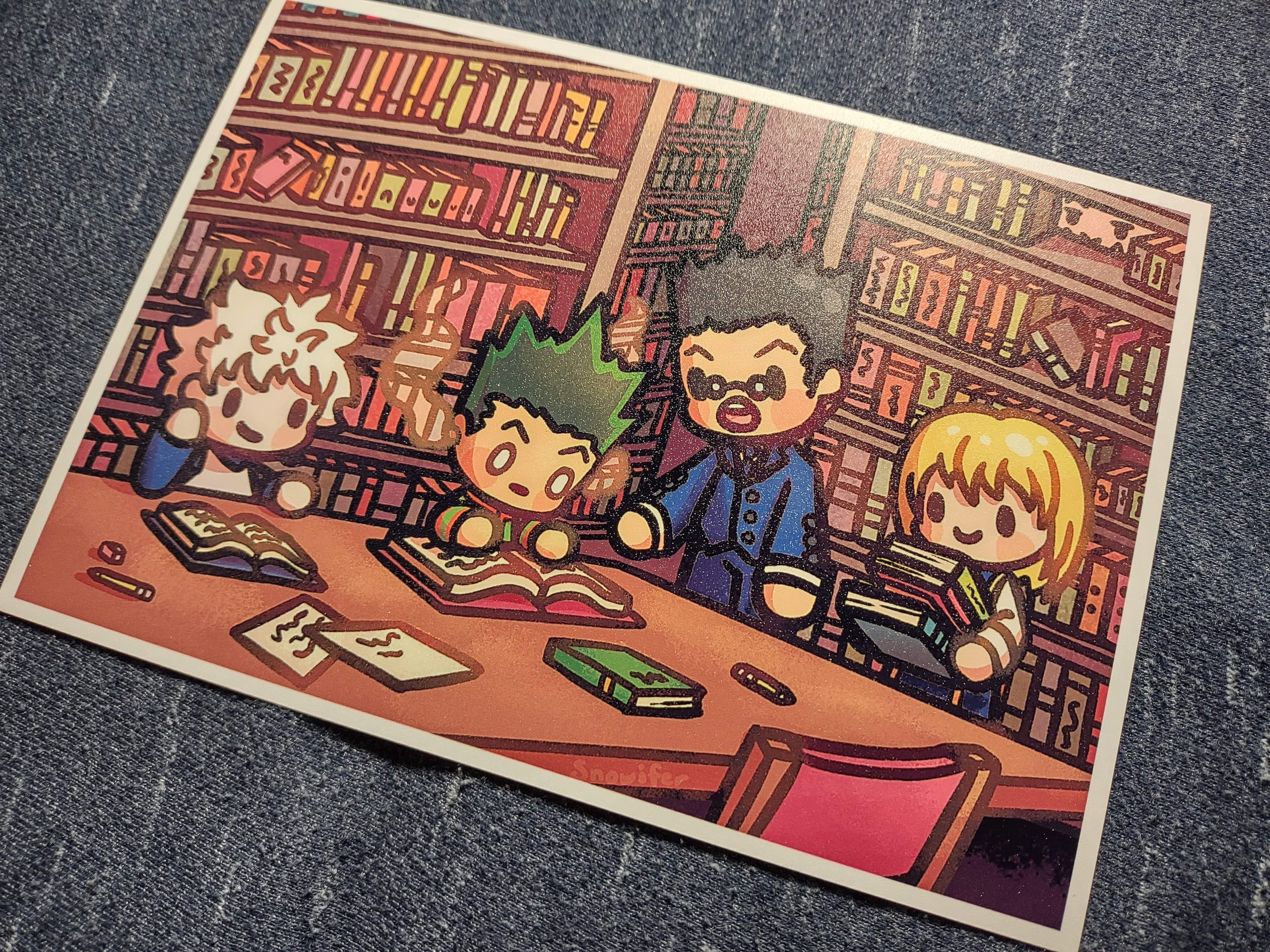 A 5 x 7 print of the main quartet from Hunter x Hunter studying at a library.
