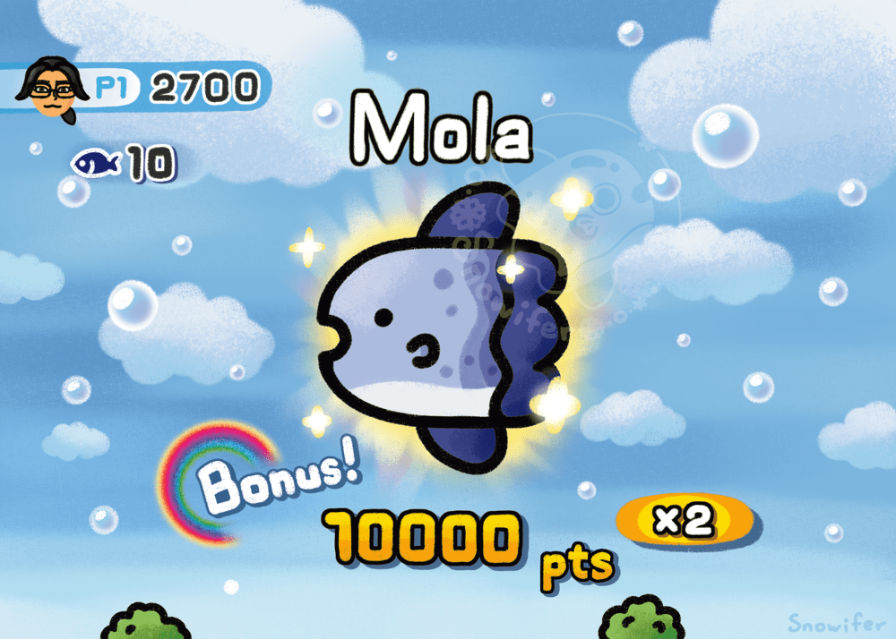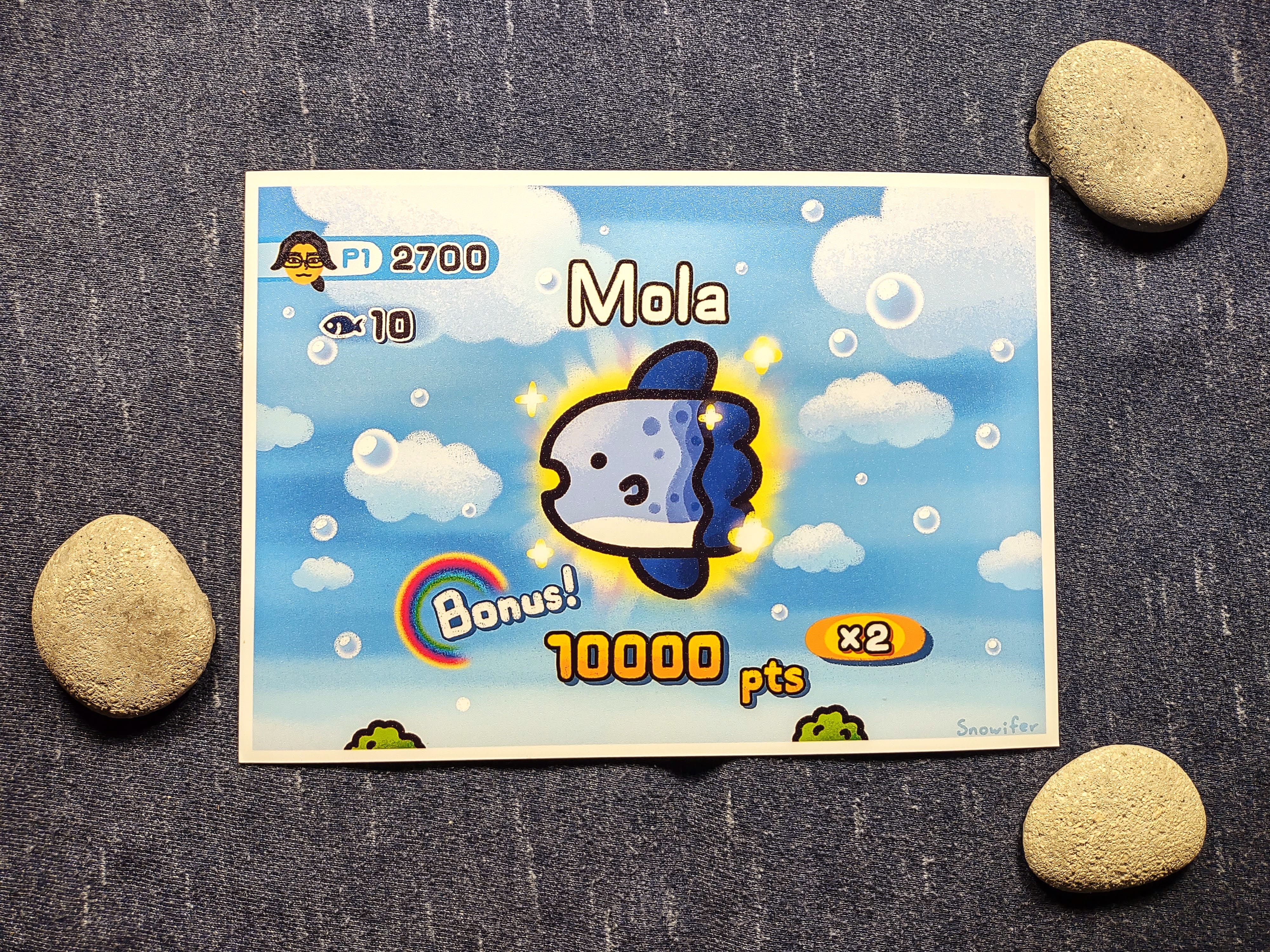 A 5 x 7 print of a mola being displayed after being fished up. Inspired by the Wii Play fishing minigame.