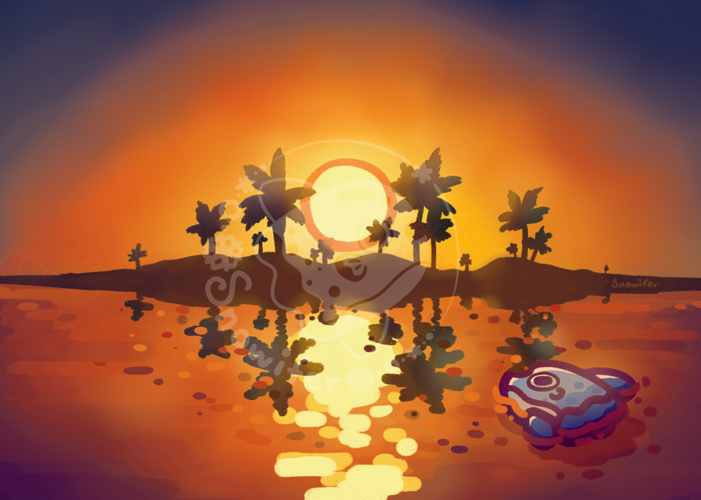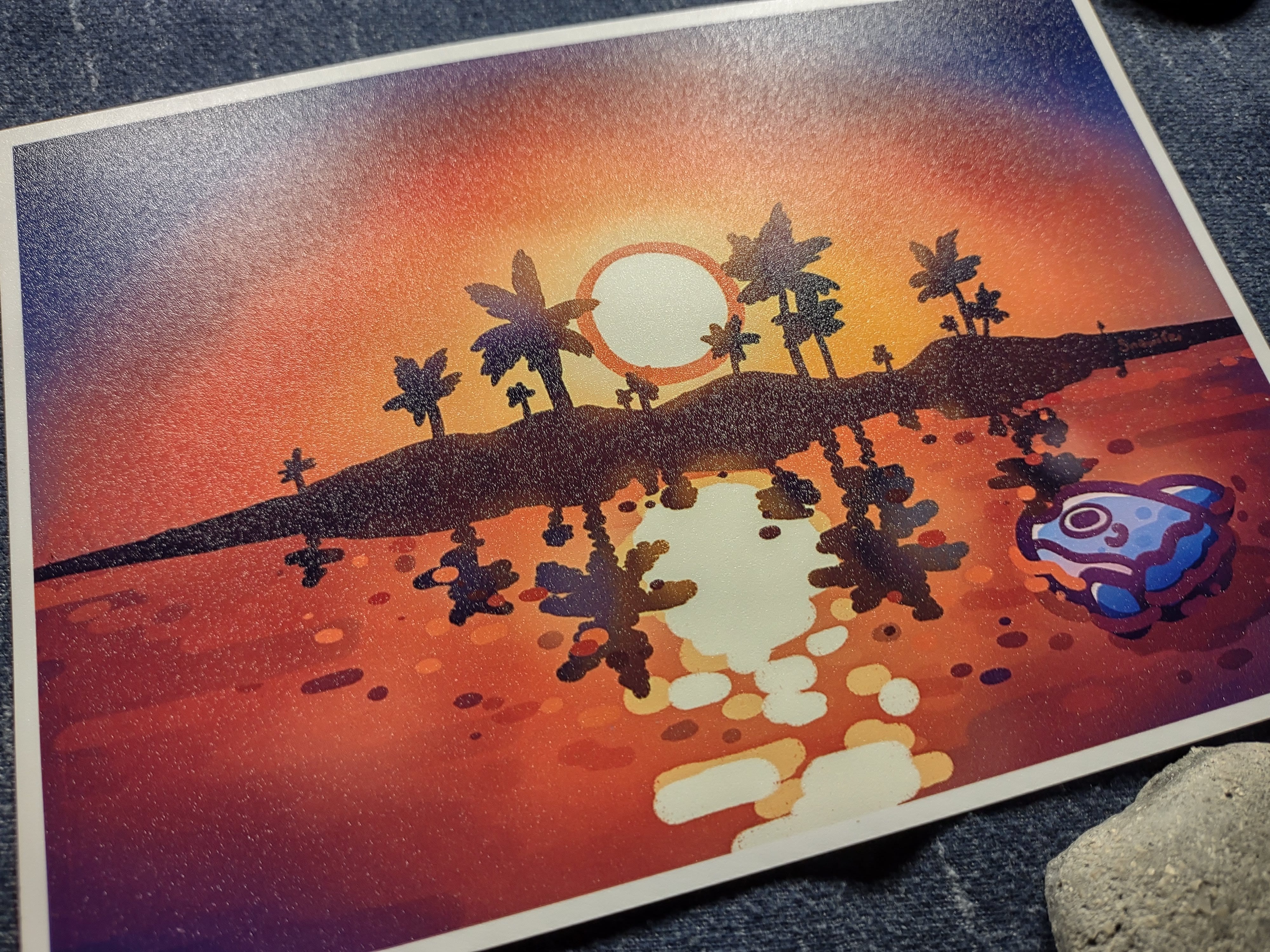 A 5 x 7 print of a mola floating by a rich orange sunset beach.