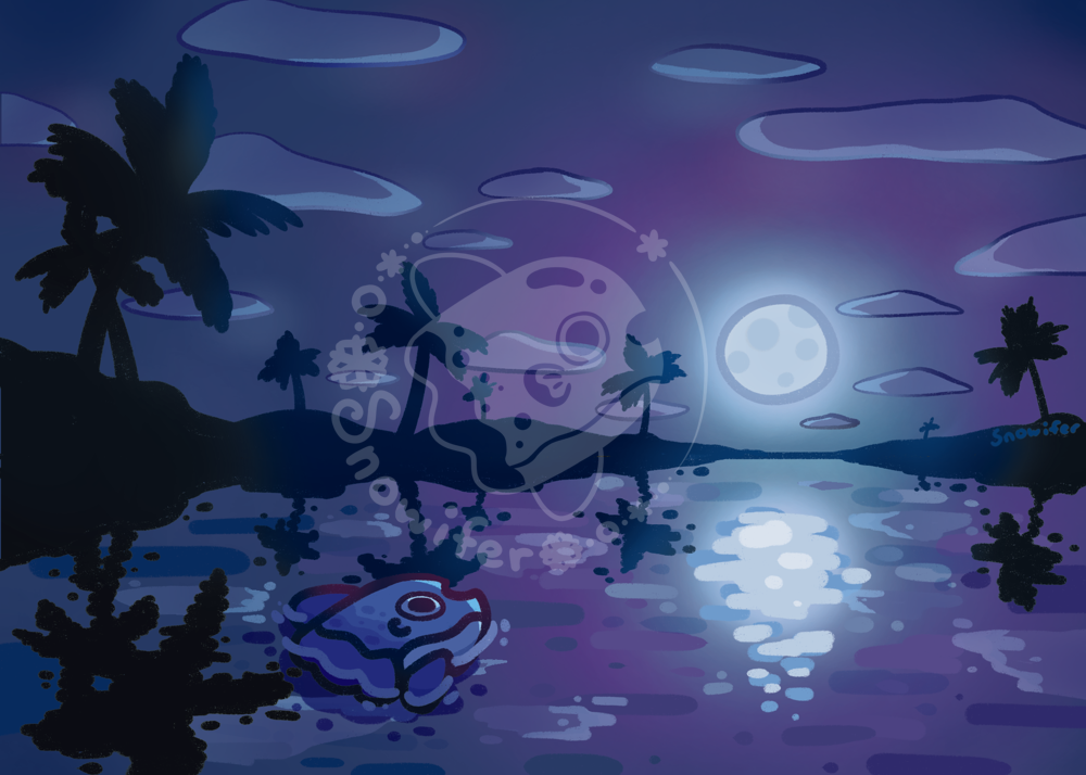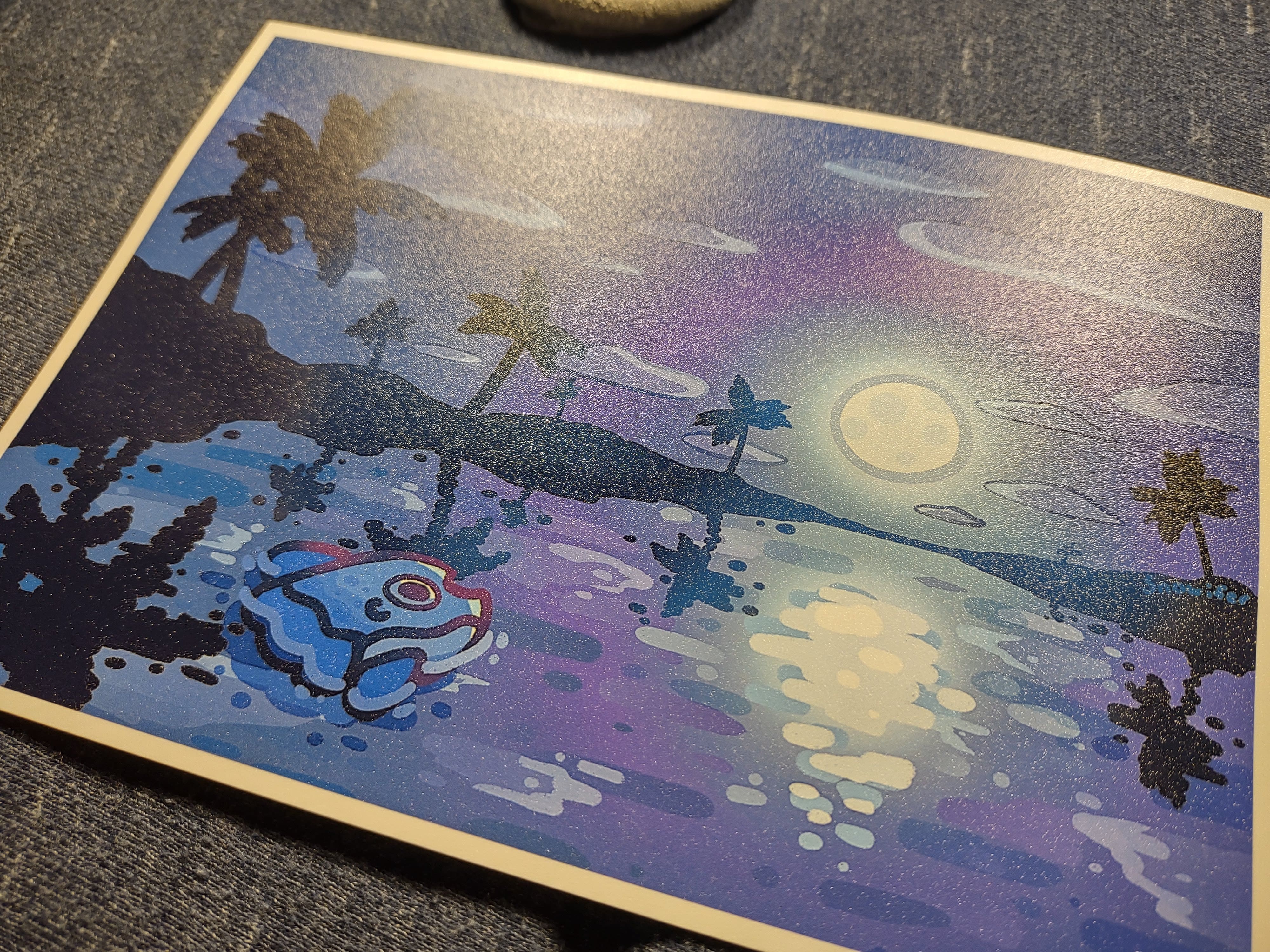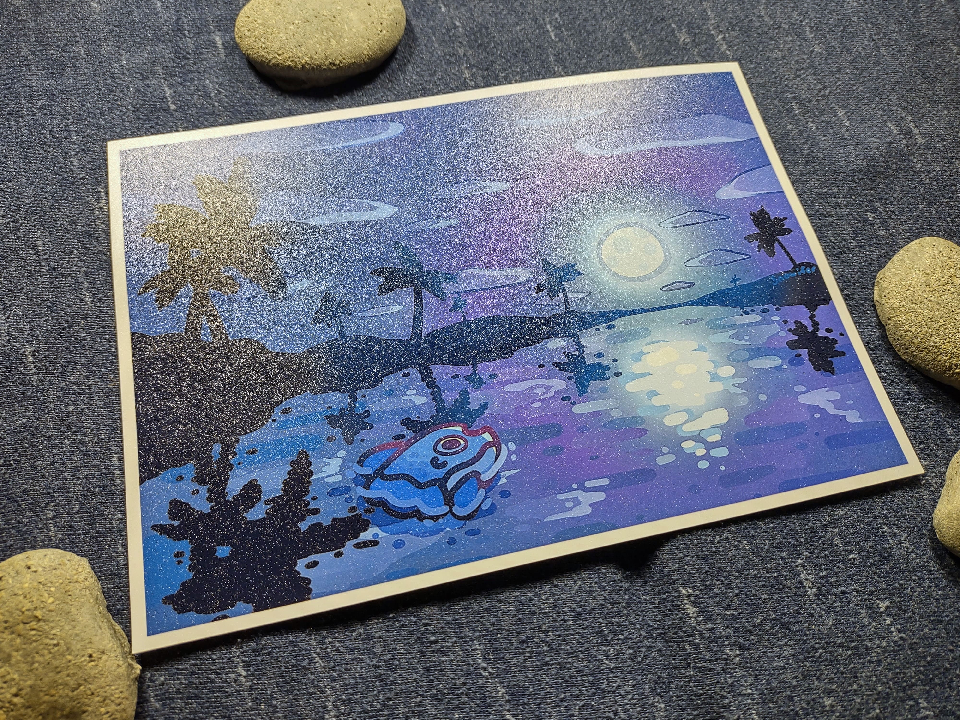A 5 x 7 print of a mola floating by a moonlit beach.