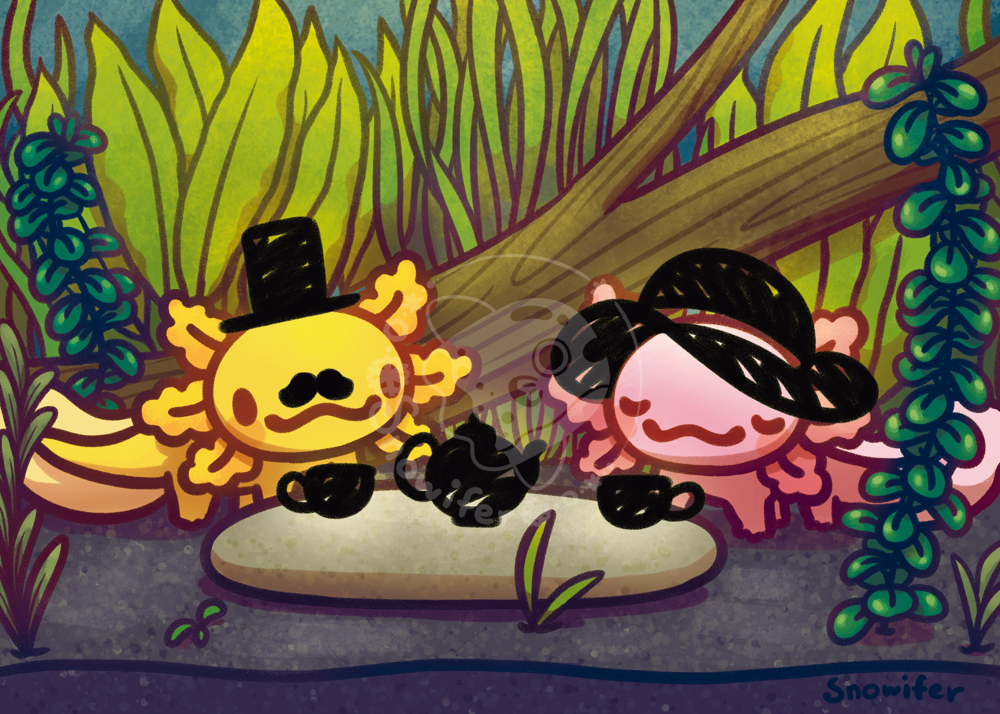 A 5 x 7 print of two axolotls chilling by a rock with a tea party and accessories drawn in marker.