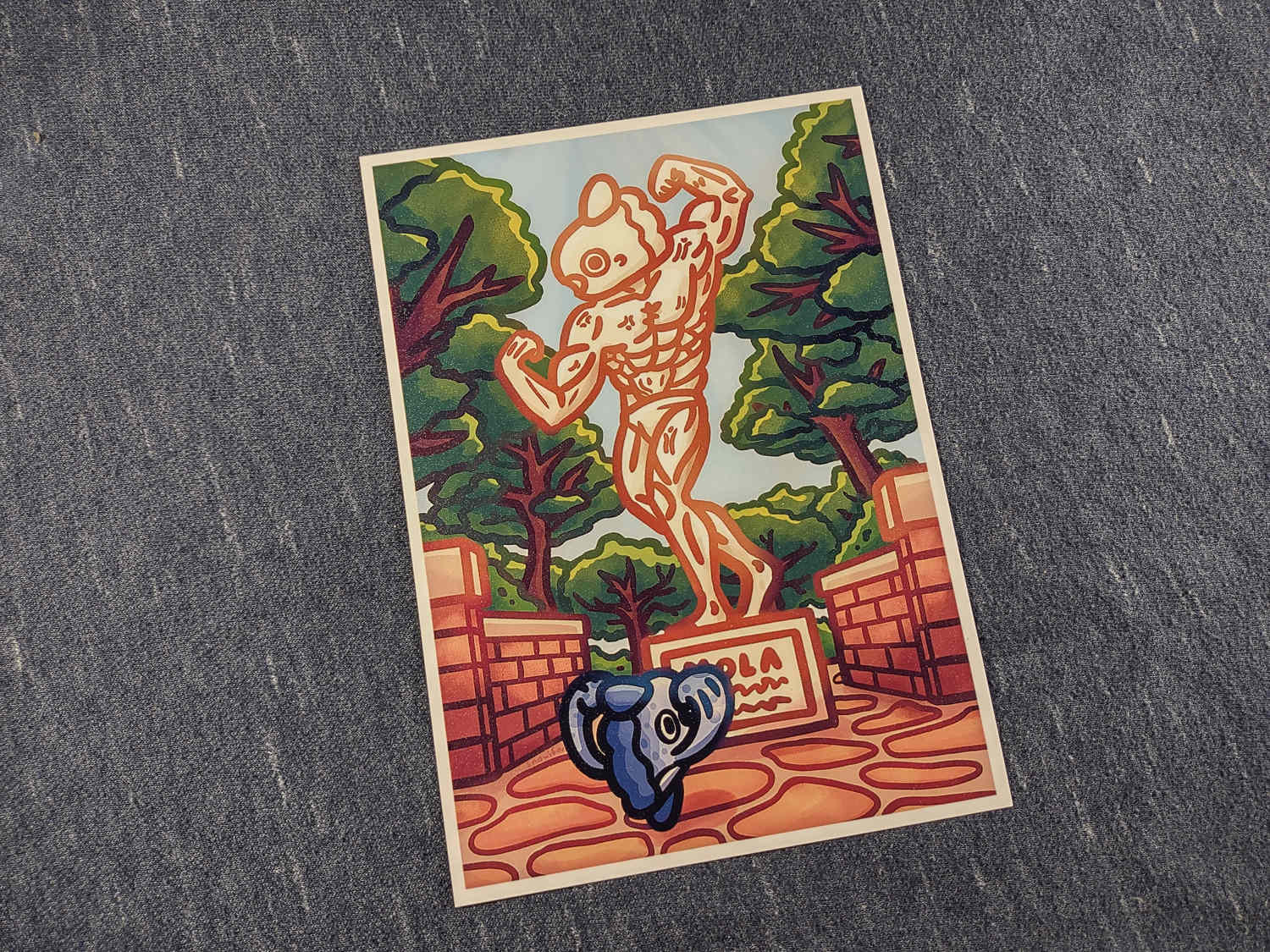 A 5 x 7 print of a mola looking up to a large buff statue of a mola flexing.