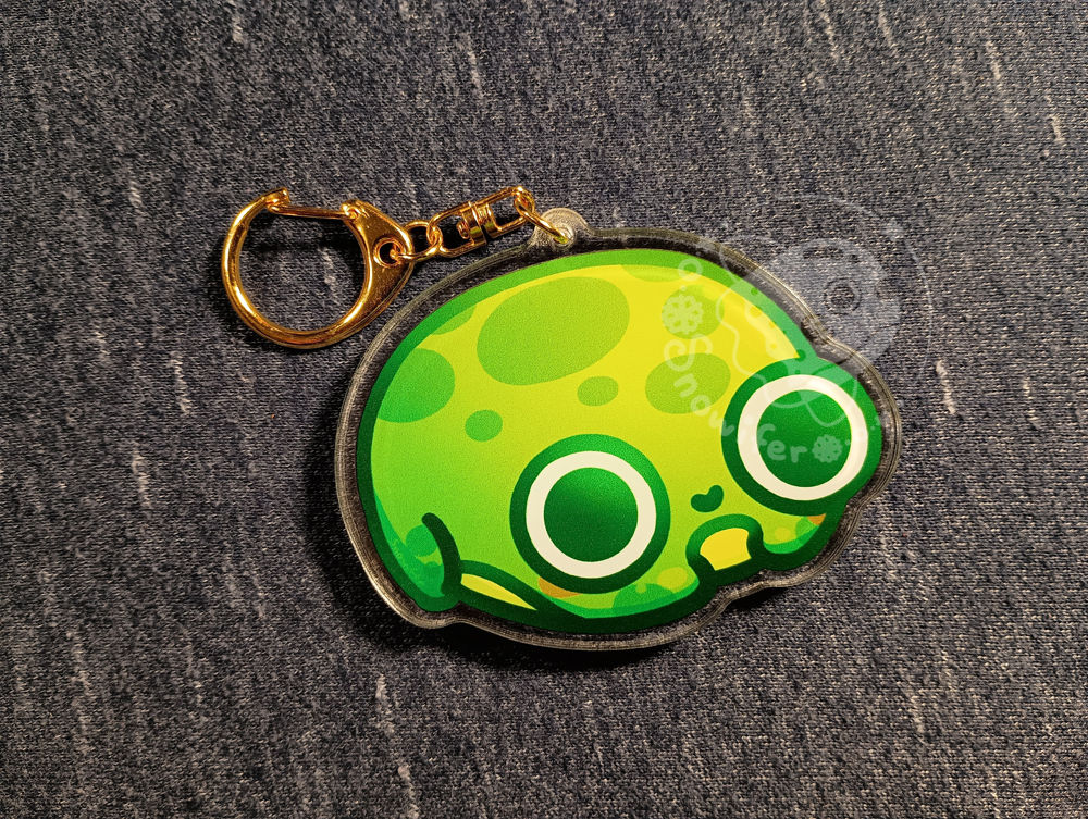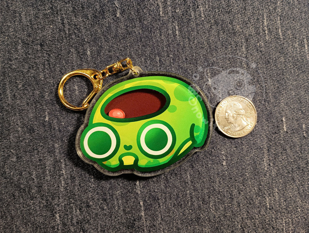 A shaker keychain of a frog with a tiny brain bouncing around in its empty head.