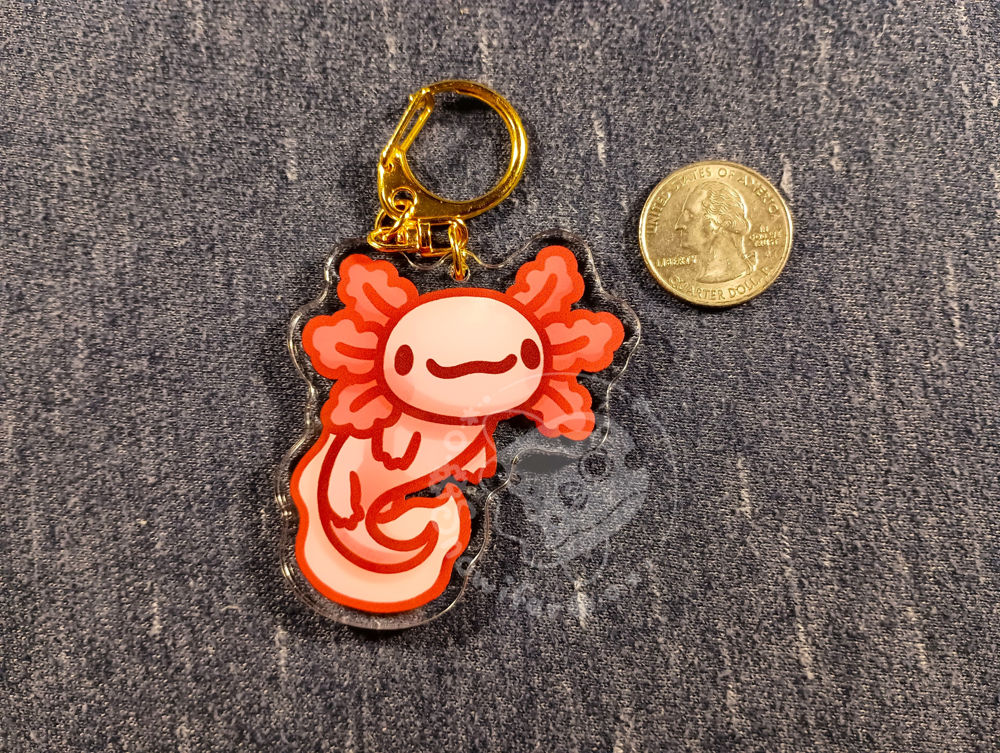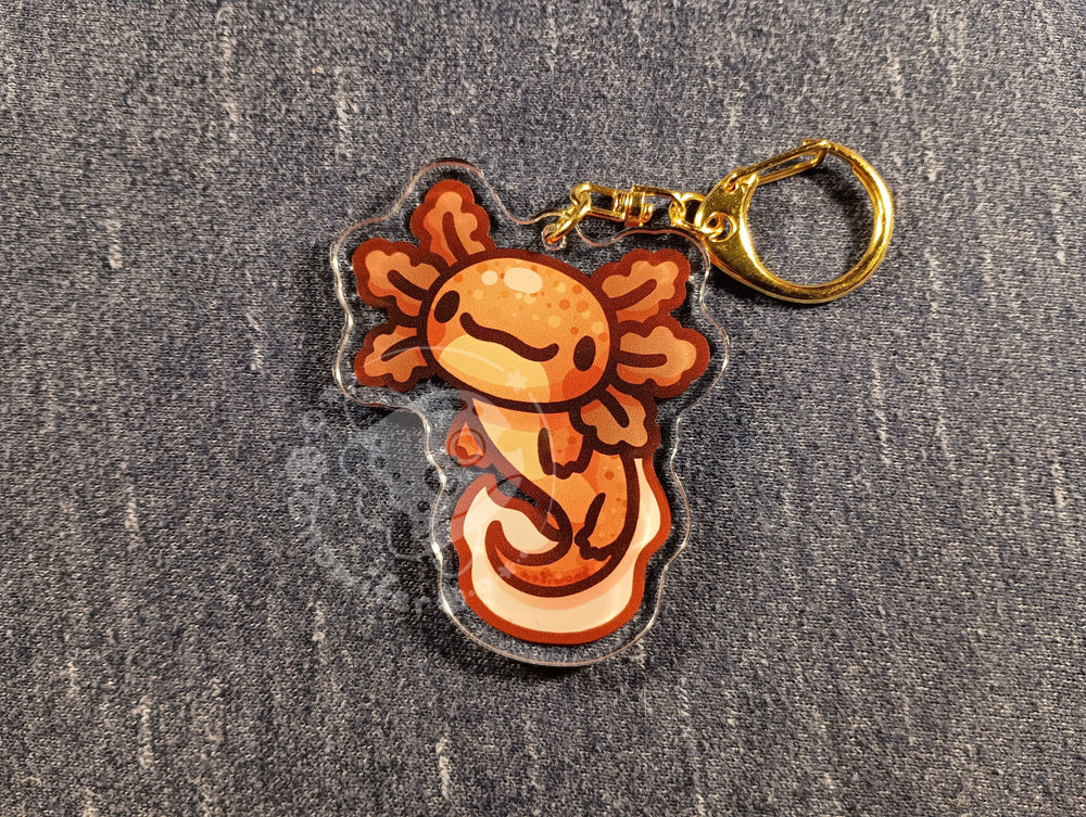 A keychain with a pink axolotl on the front and a brown axolotl on the back.