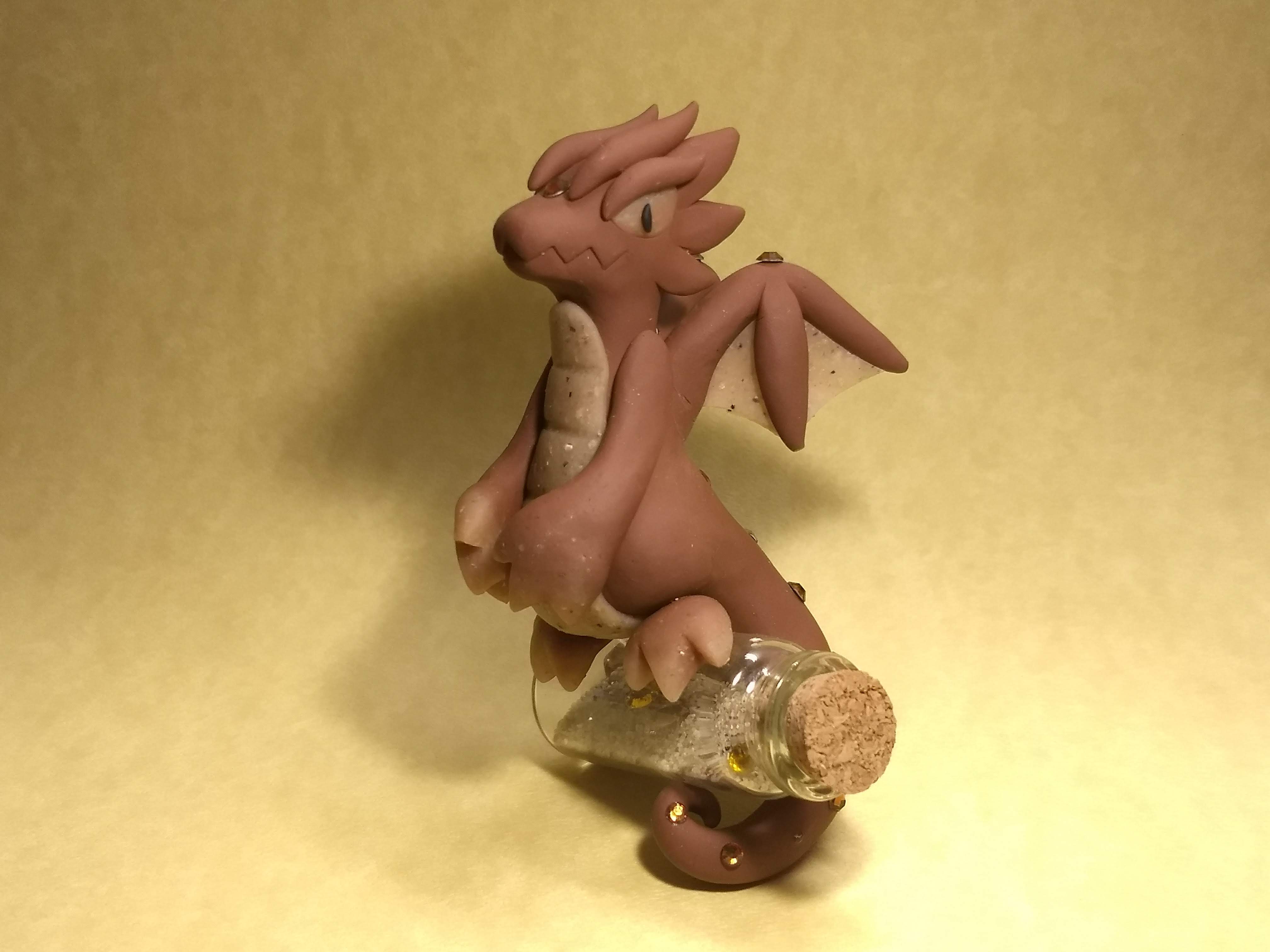 A one of a kind dragon handmade from polymer clay. The bottle is removable, but the dragon cannot stand without it. The wings have been cracked and securely reattached and glued.