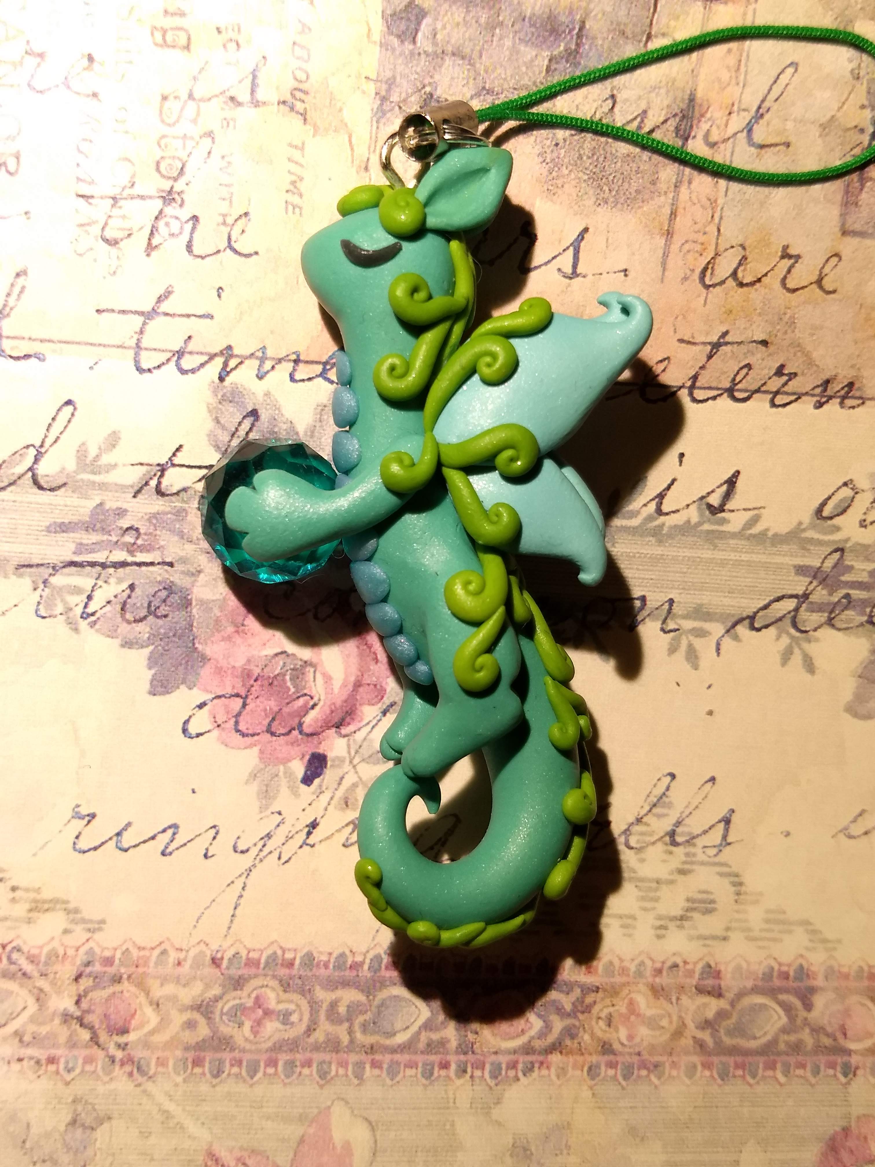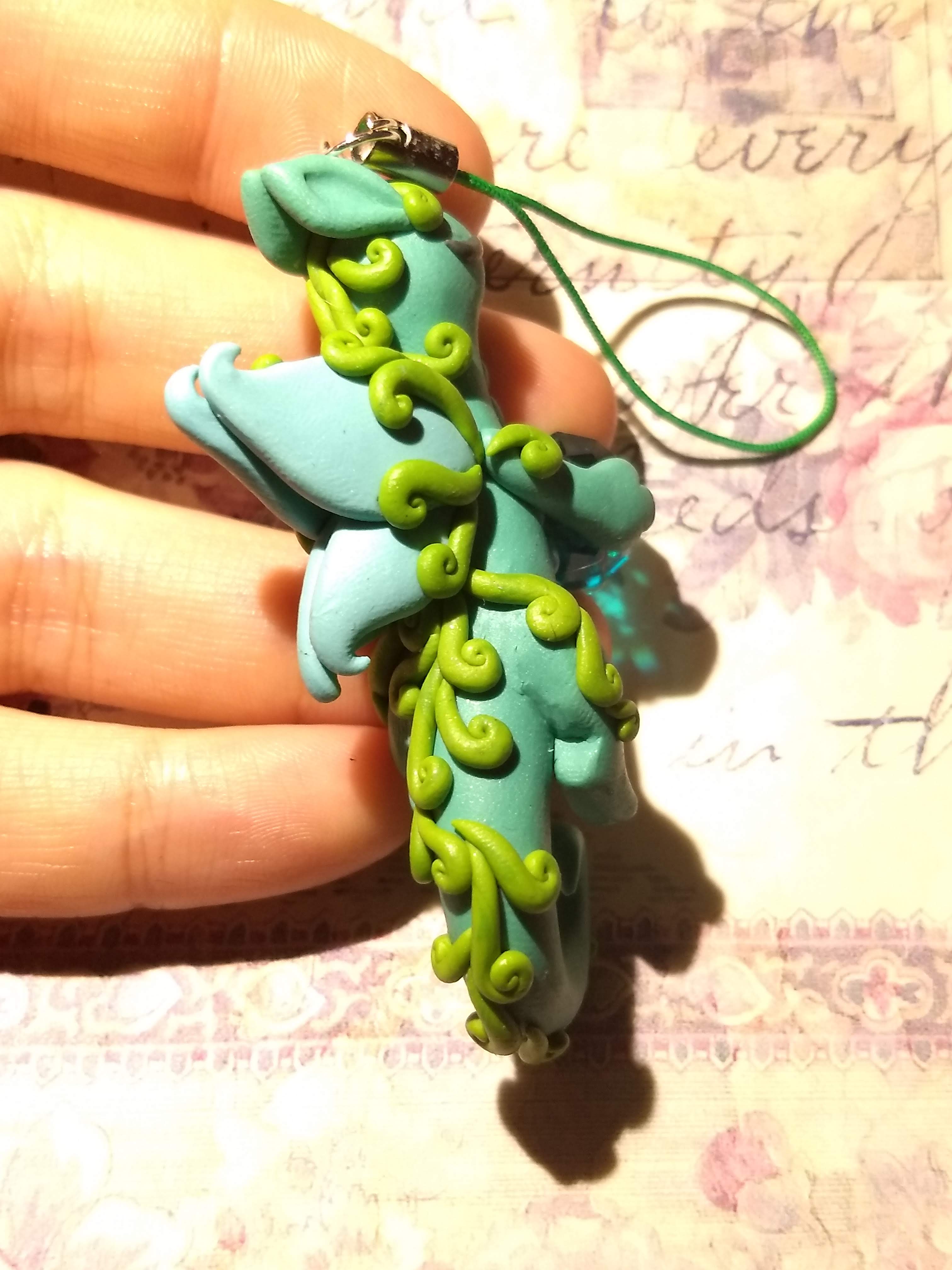 A dragon charm handmade from polymer clay. Its body shimmers and has been finished with a matte varnish.