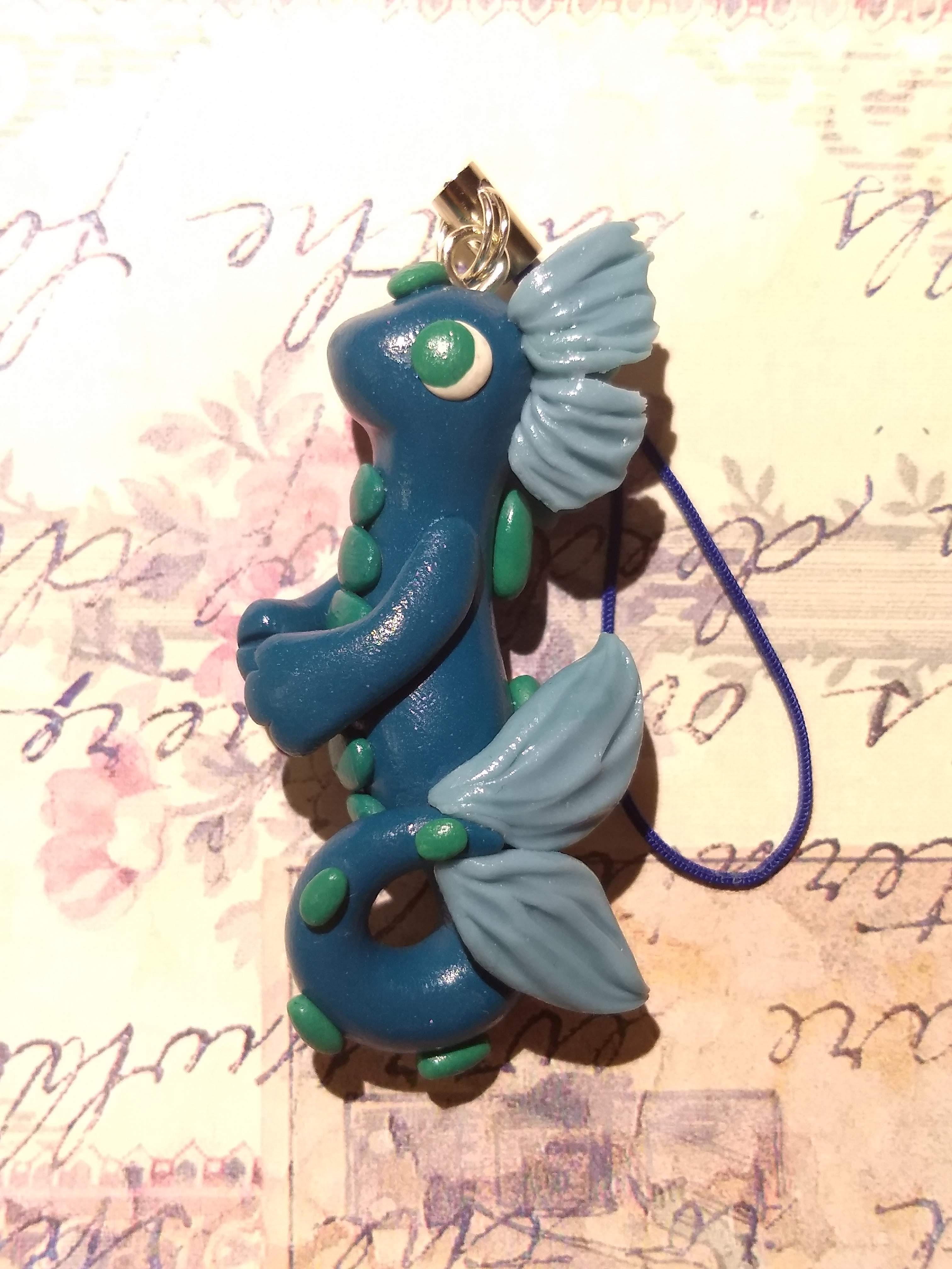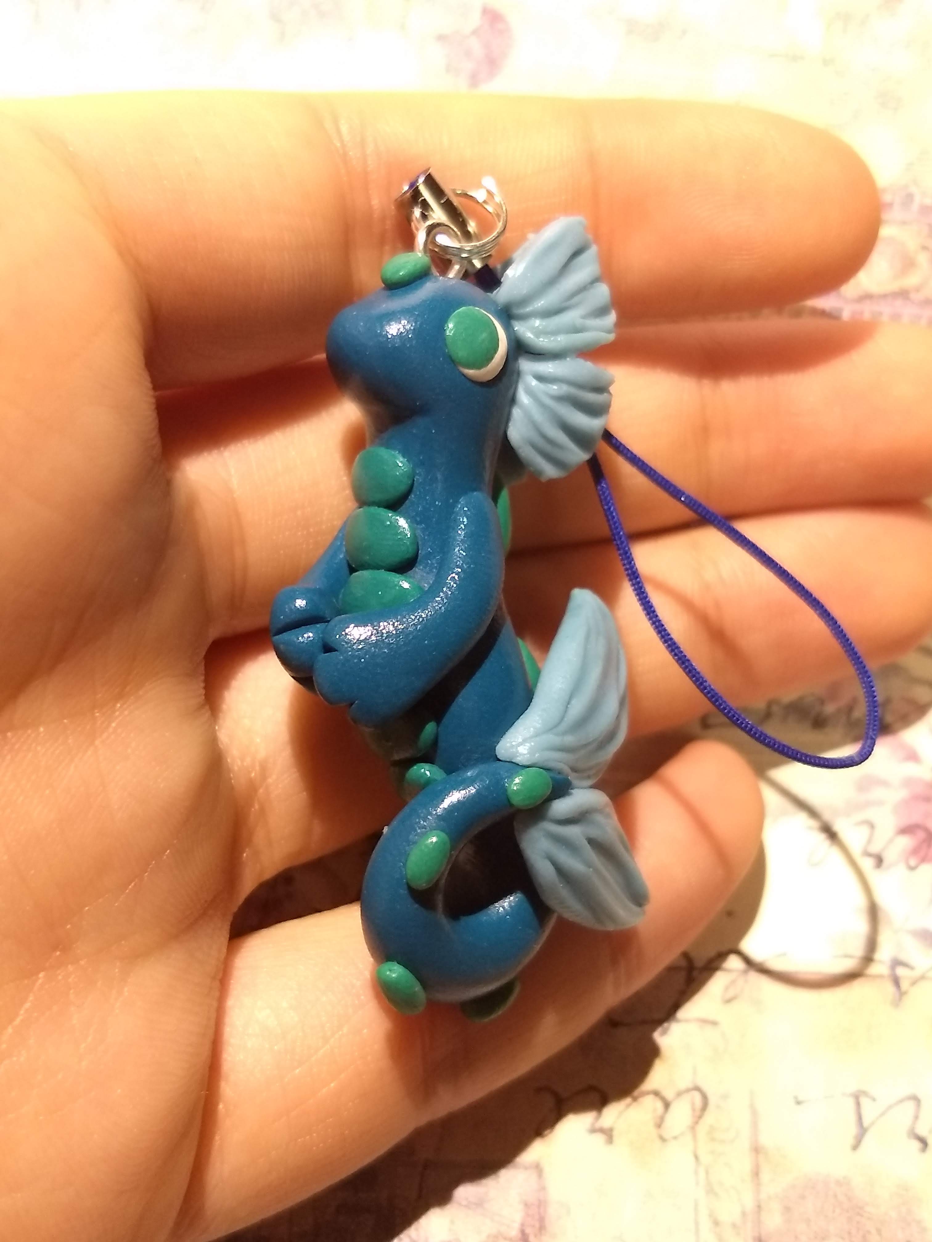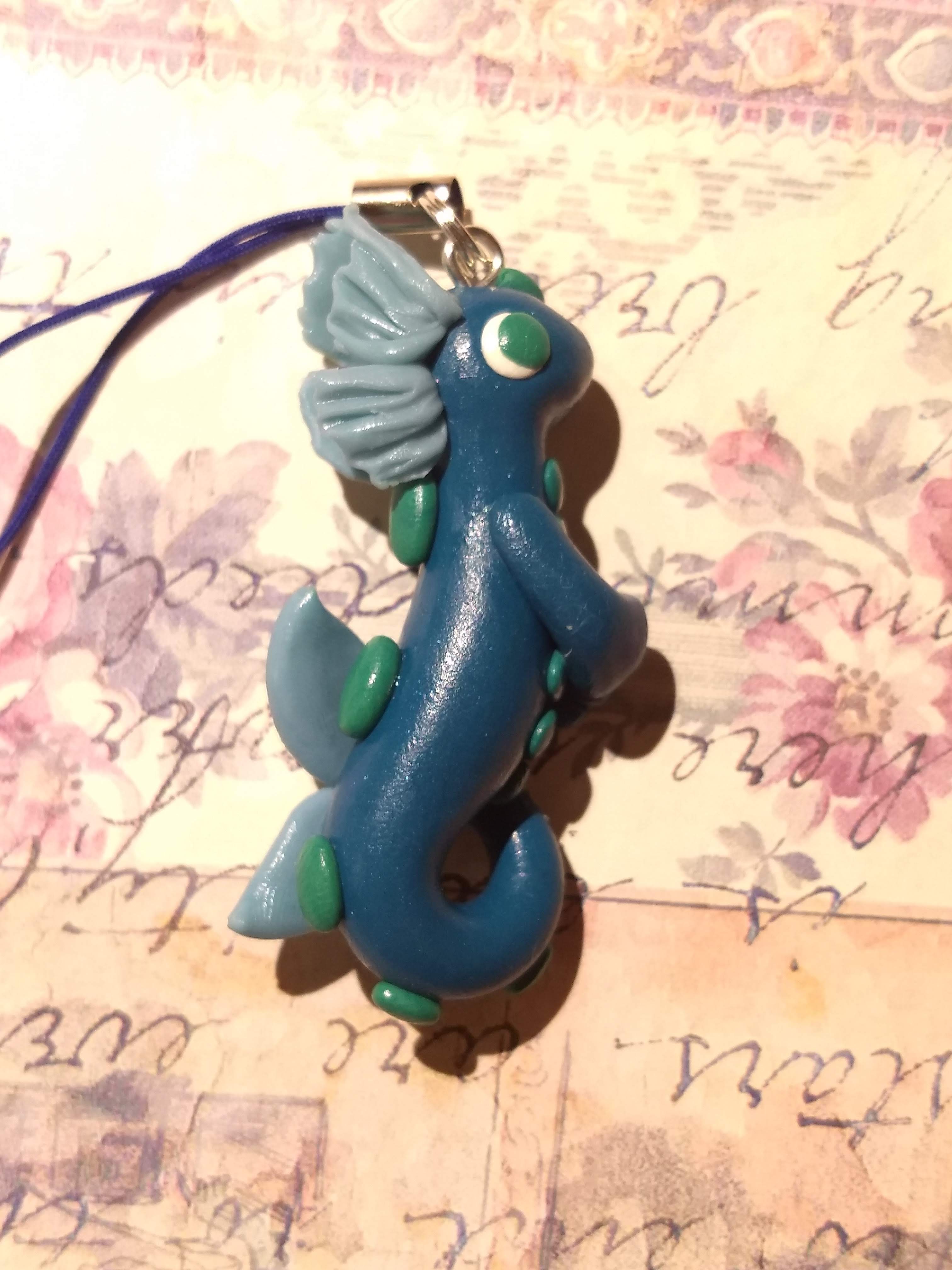 A handmade dragon charm made from polymer clay. This dragon's body features a very slight amount of shimmer.
