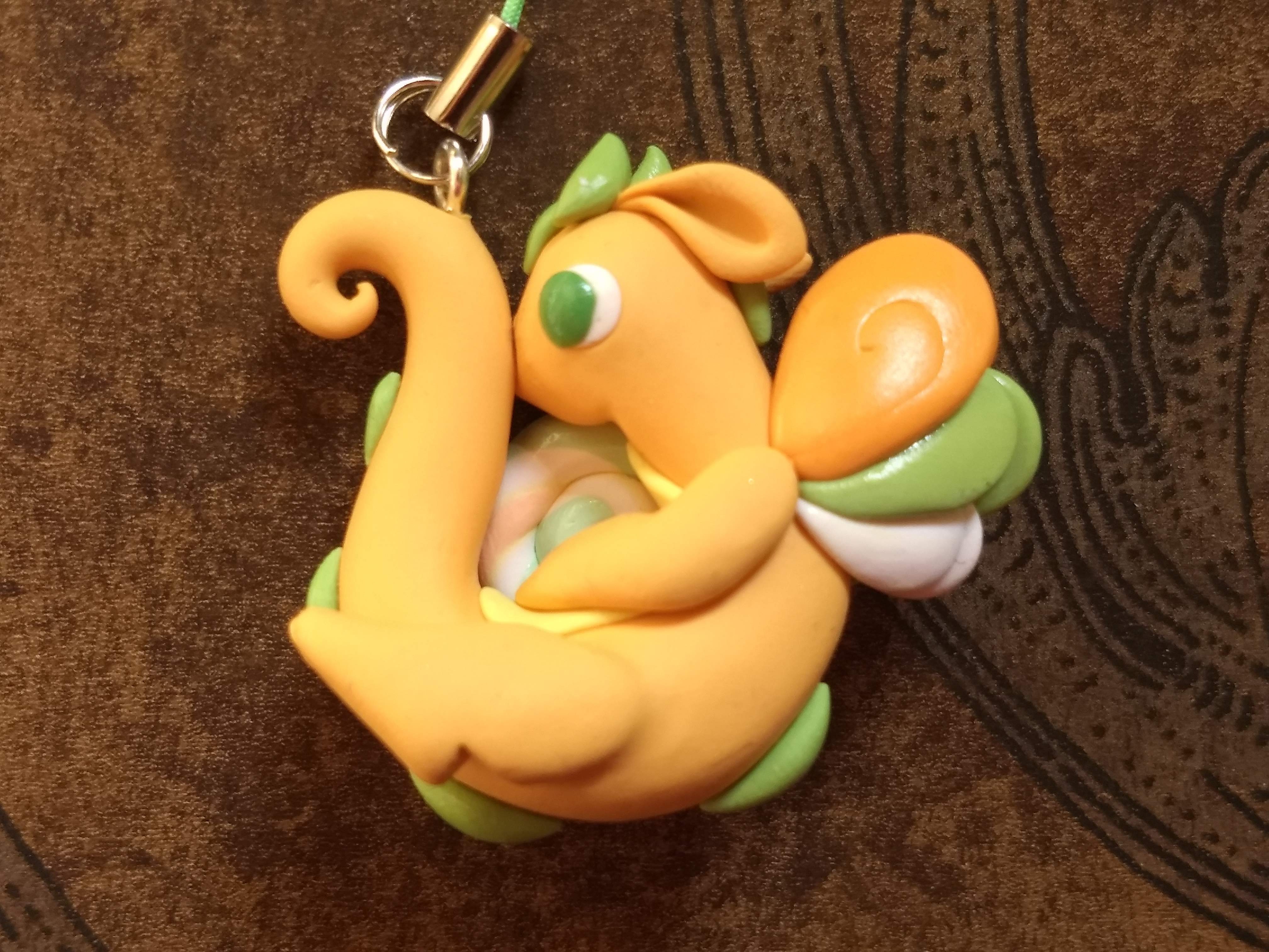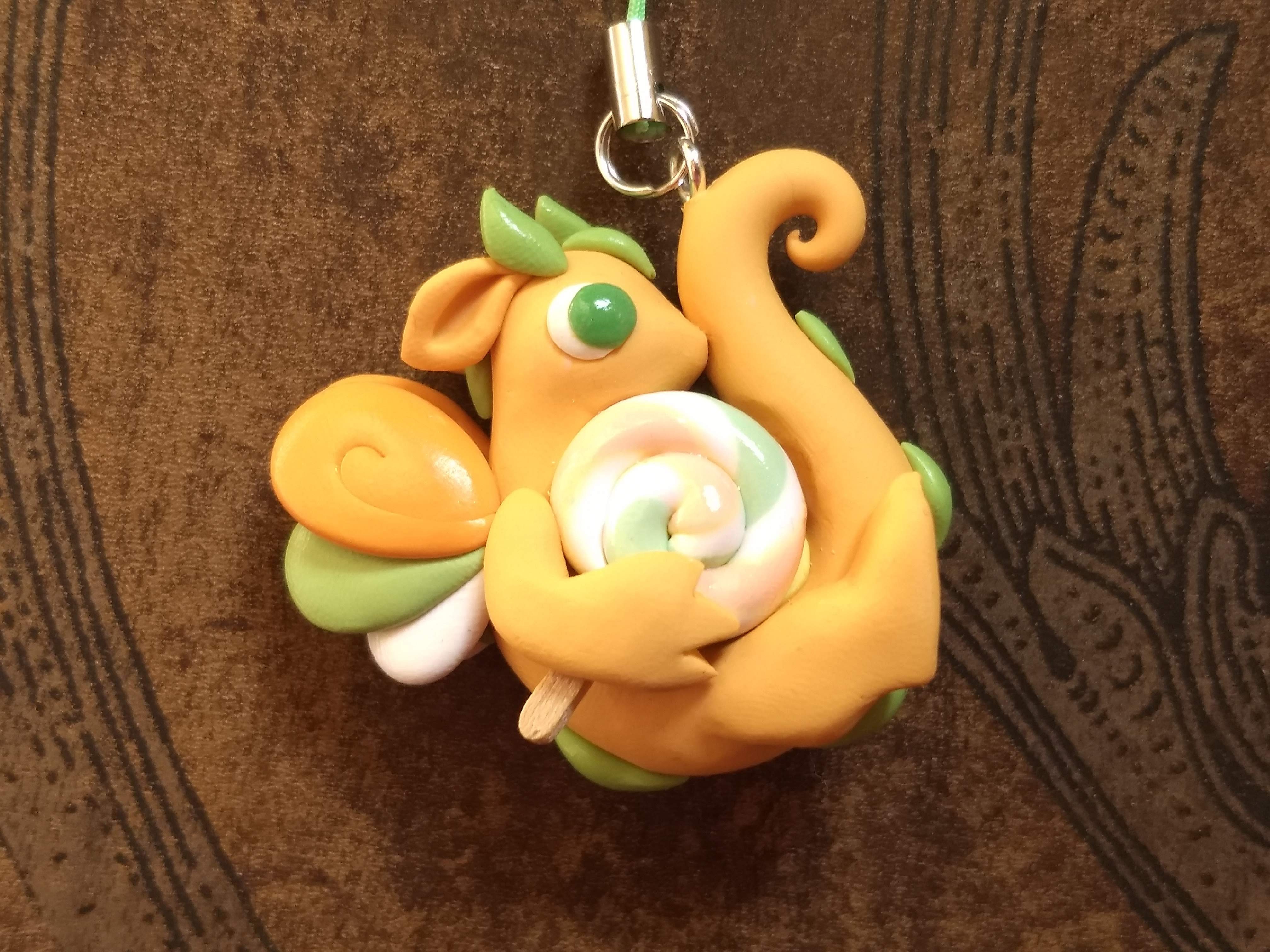 A dragon charm that is handmade from polymer clay. This one is hugging a shiny orange and green lollipop.