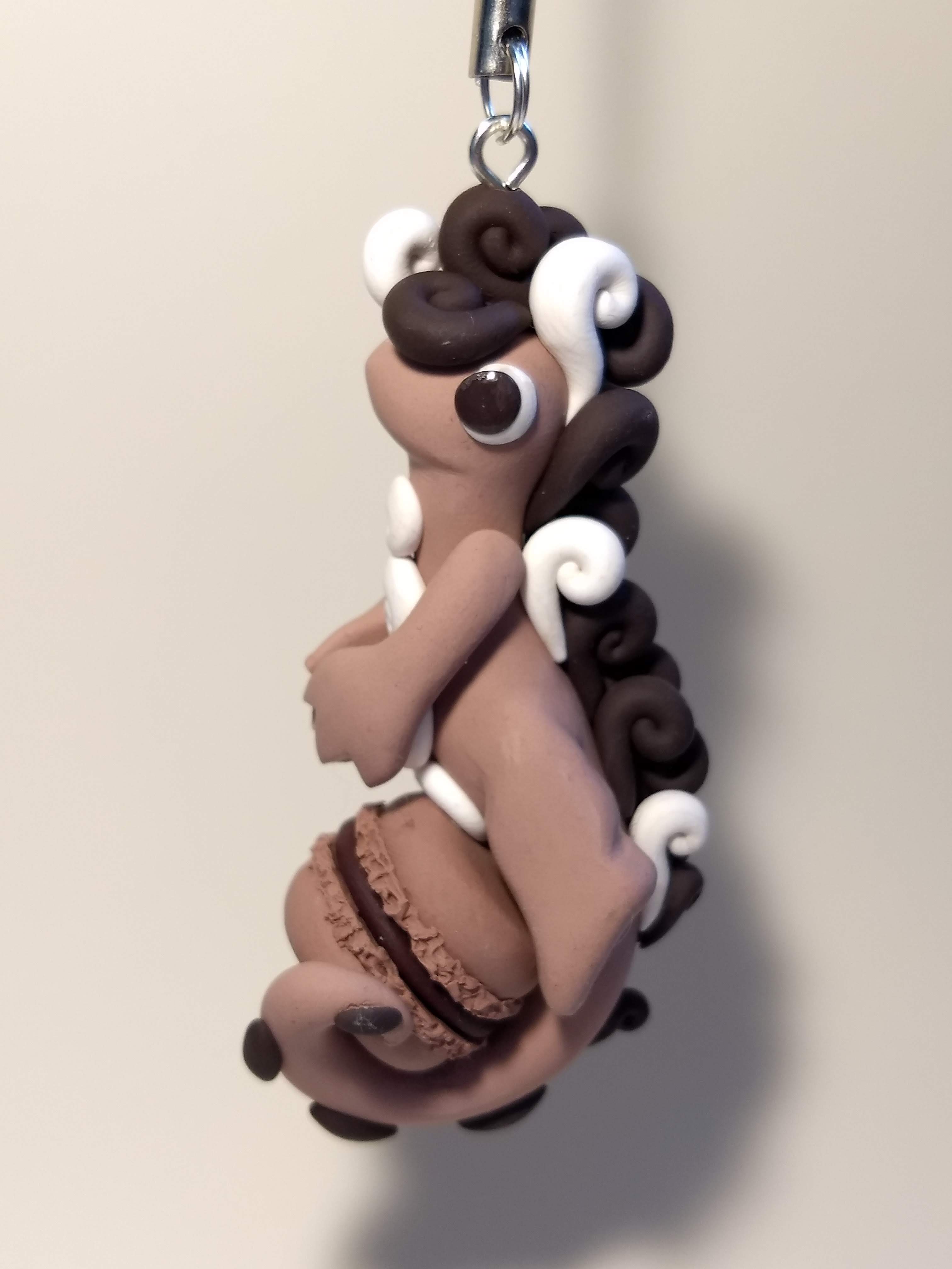 A dragon charm that is handmade from polymer clay. This one has a swirly dark brown mane with white accents and has its tail wrapped around a chocolate macaron.
