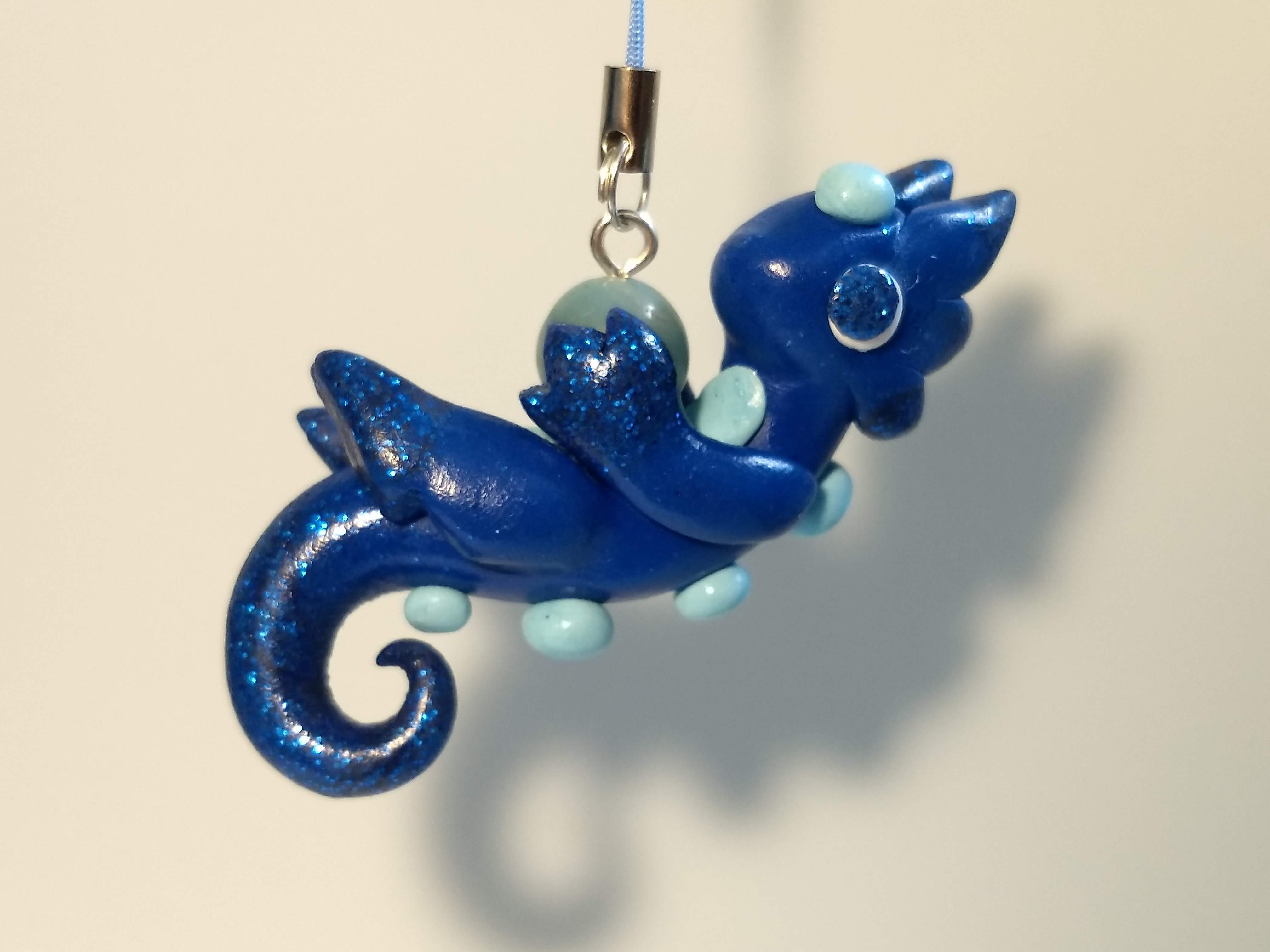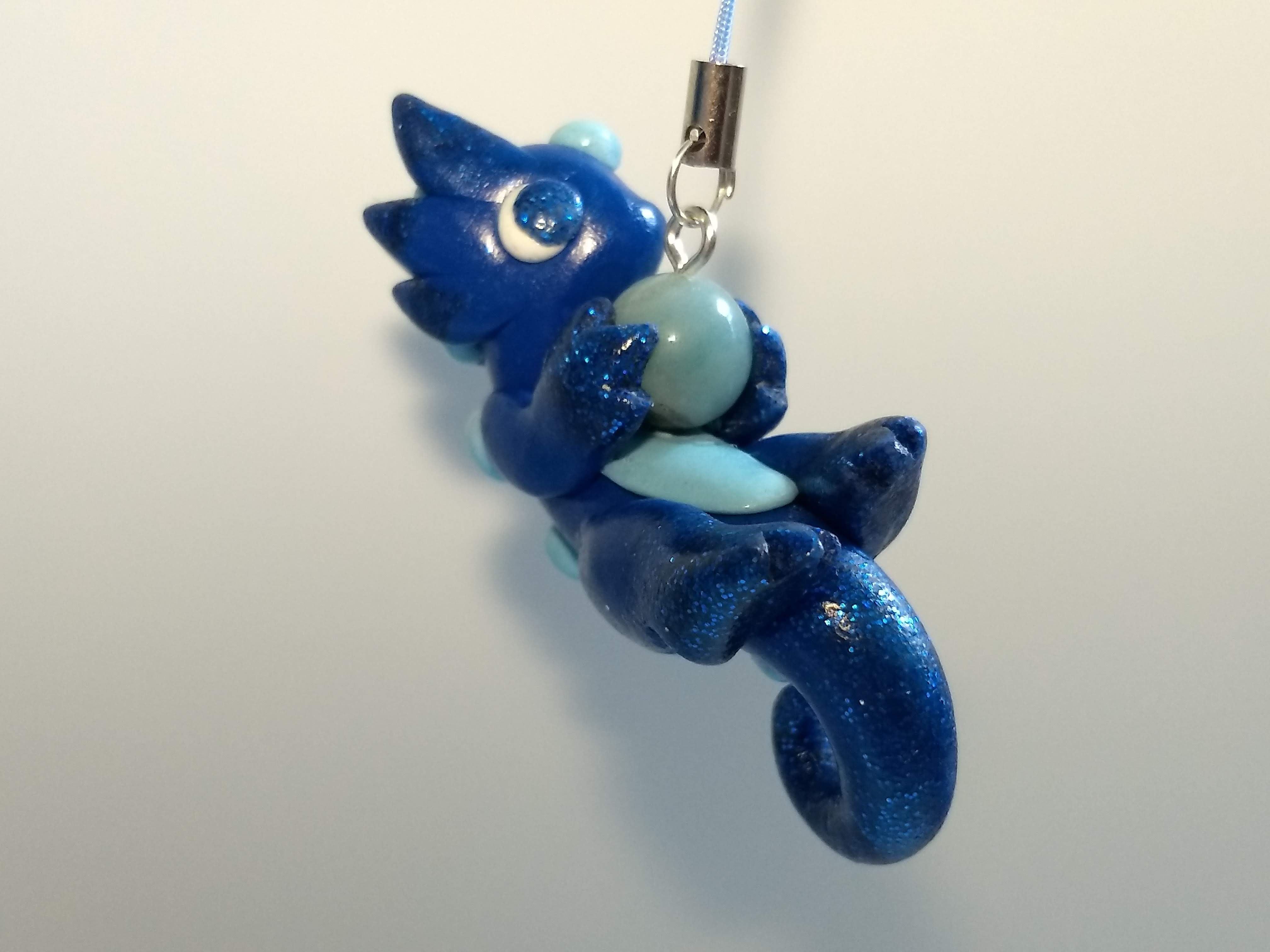 A dragon charm that is handmade from polymer clay and glitter. This dragon has dark blue glitter on the edges of its body and is holding a blue bead.