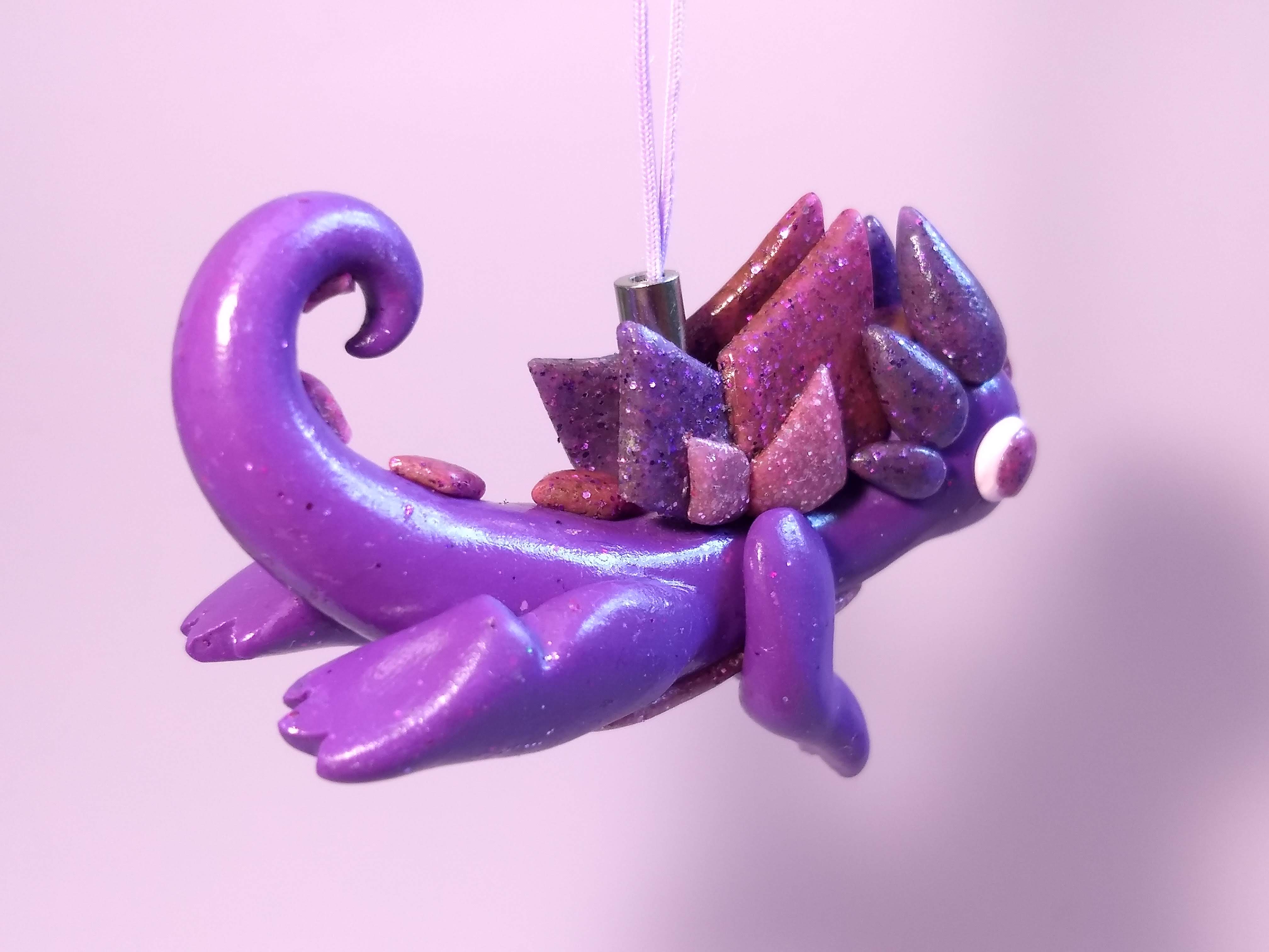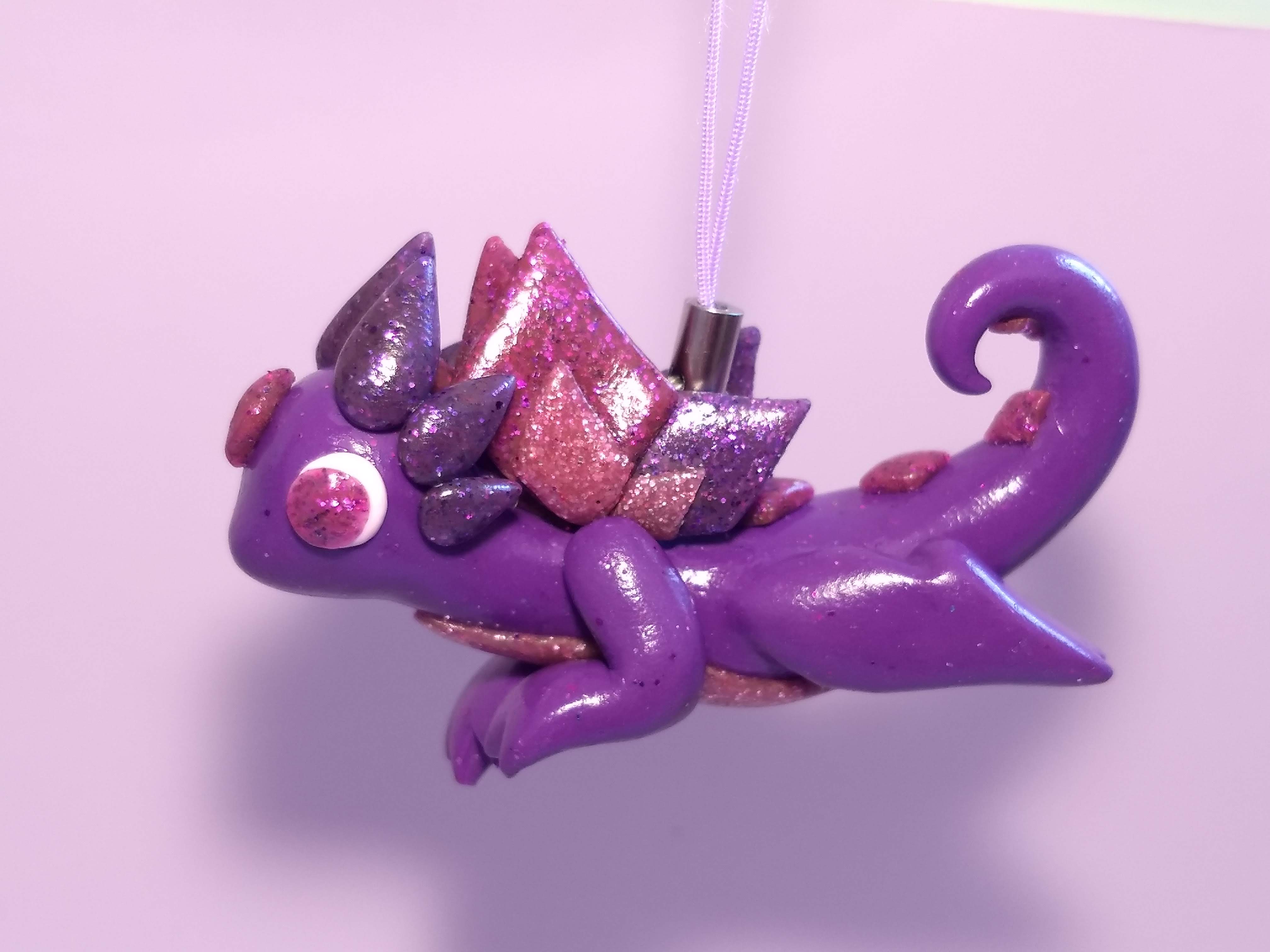 A dragon charm that's handmade from polymer clay. This dragon has glitter scattered throughout its body and is sealed with a gloss varnish.