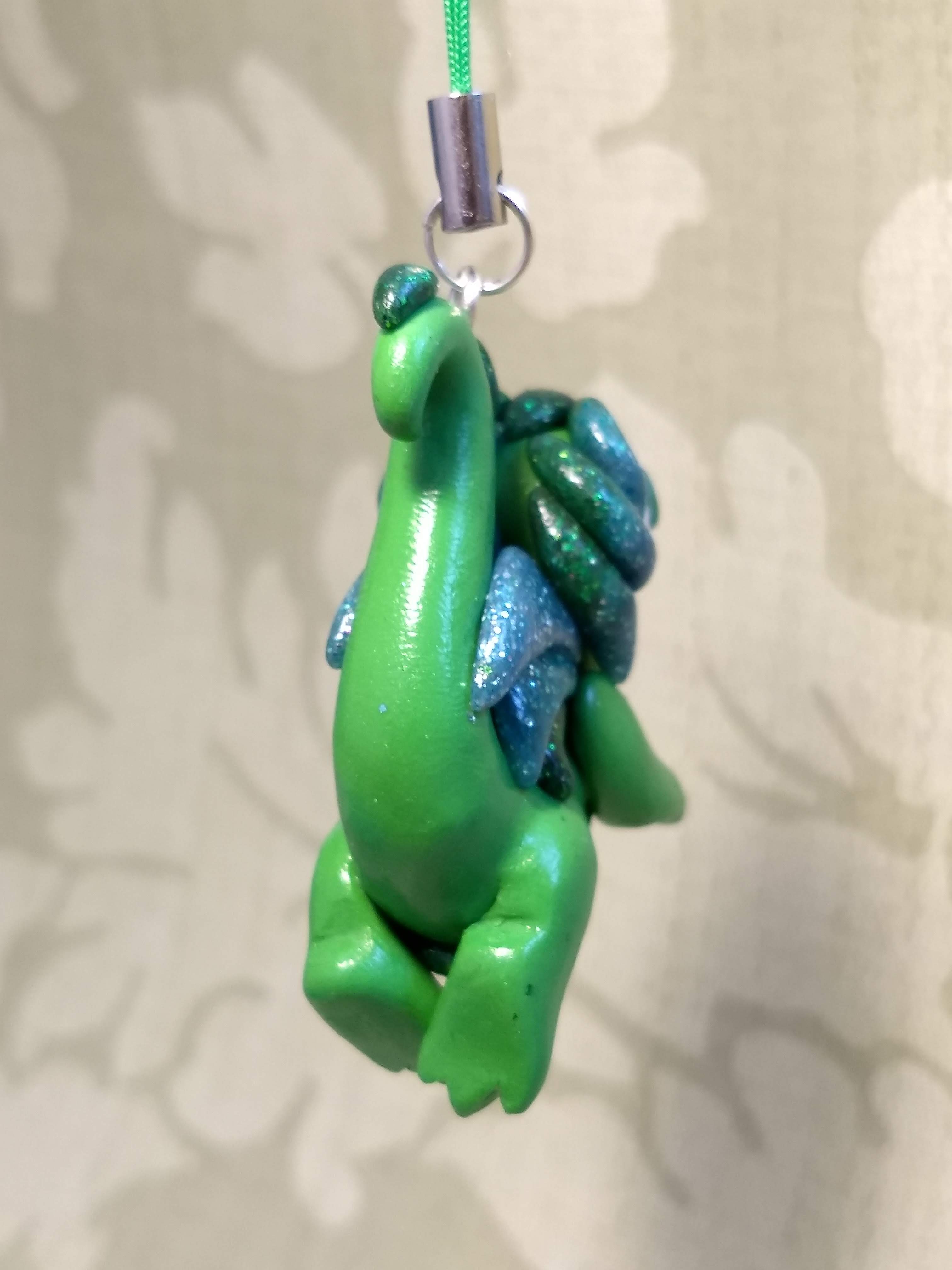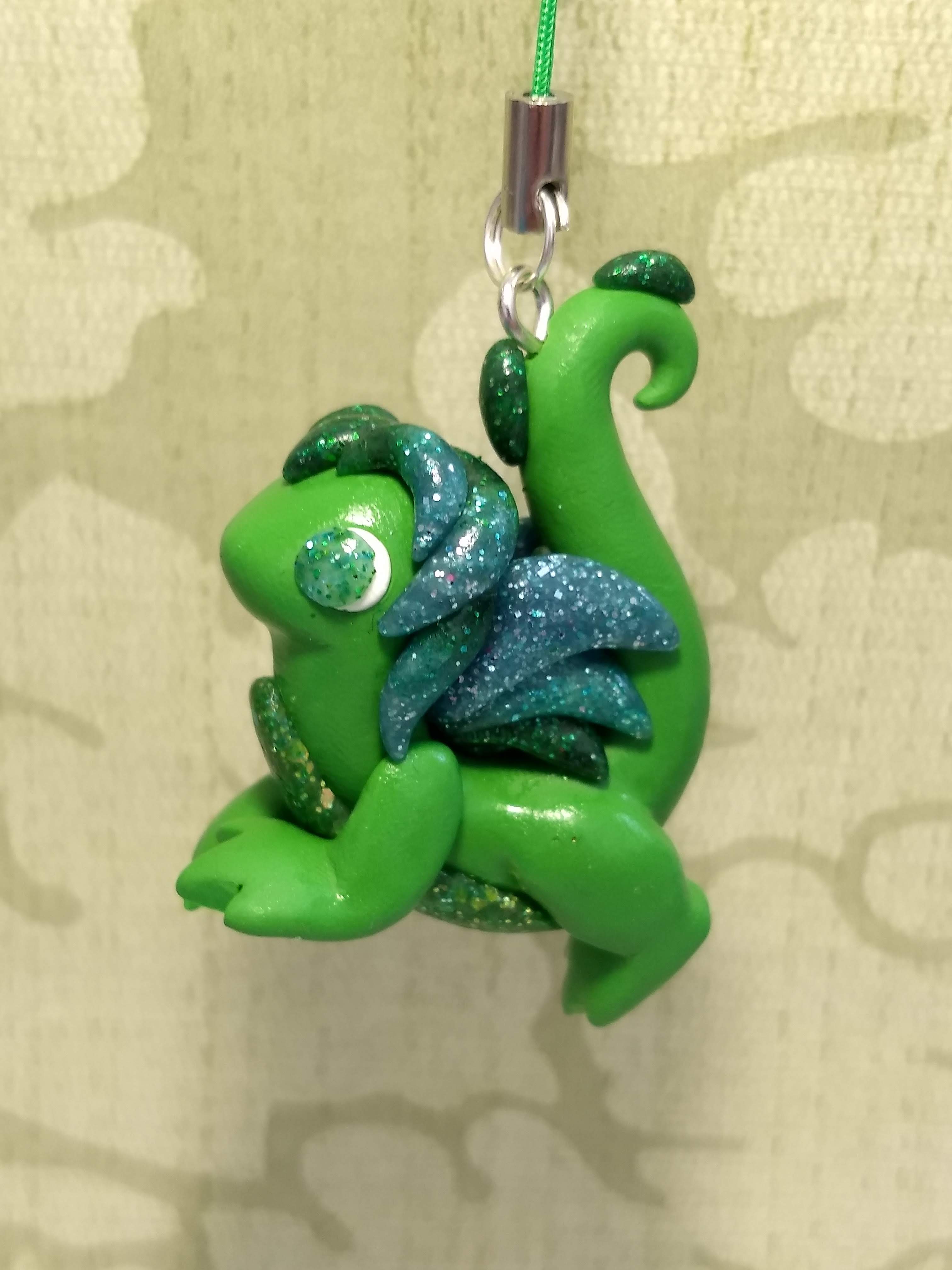 A dragon charm that is handmade from polymer clay. This one features glitter accents that transition from green to sky blue.