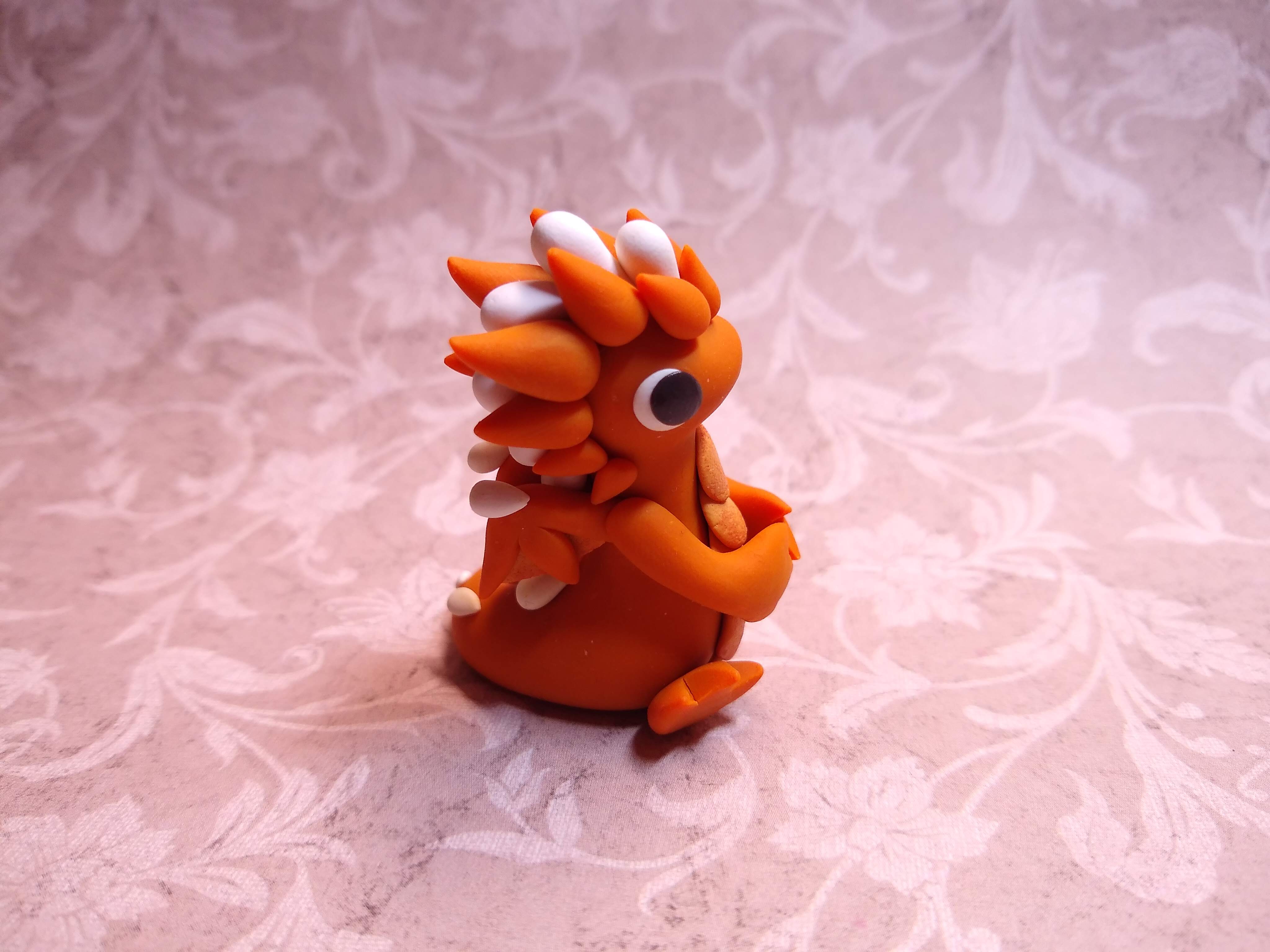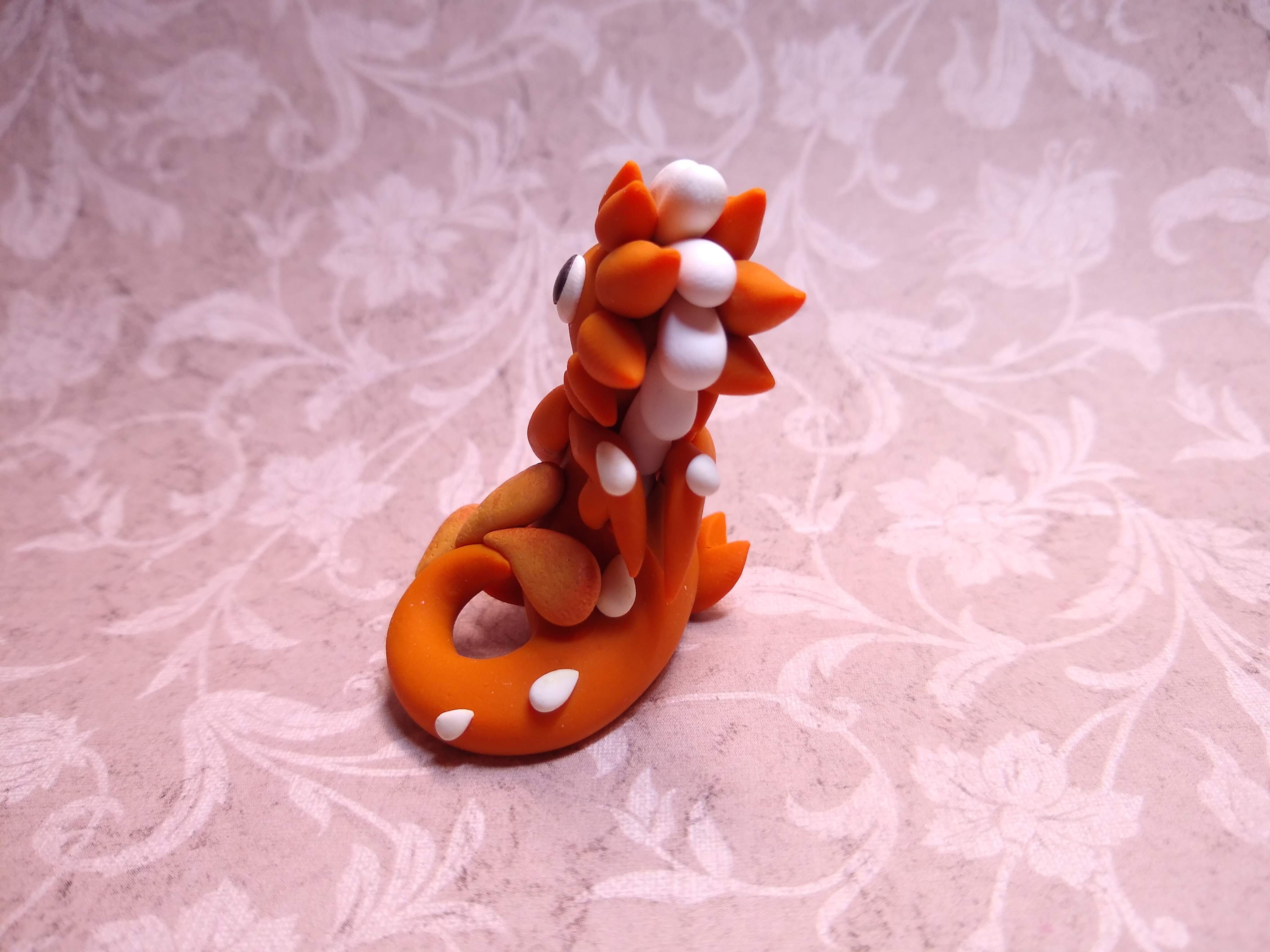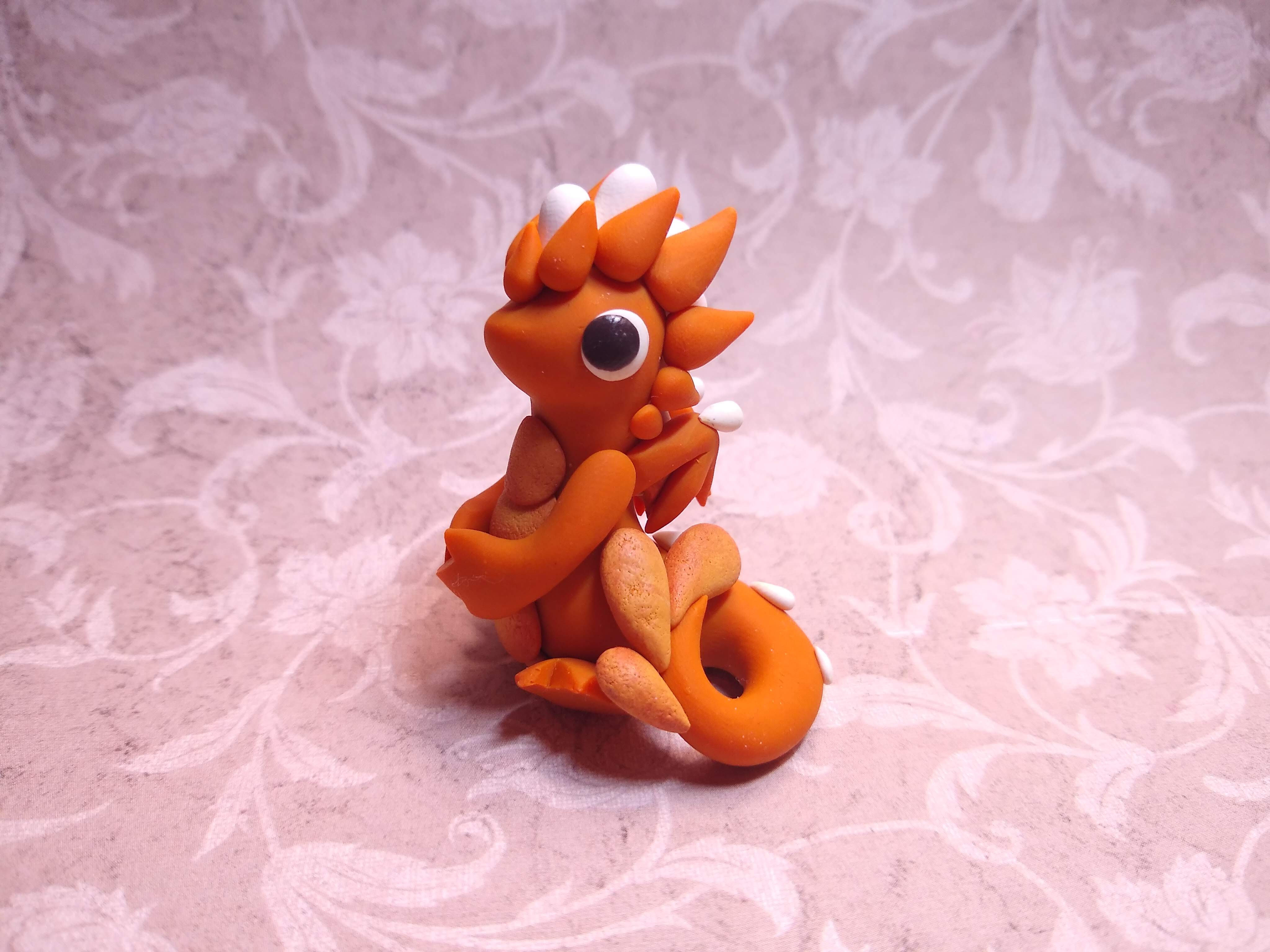 A handmade polymer clay dragon sculpture. This one is pumpkin pie themed and has dark brown eyes. Sealed with matte and gloss glazes.