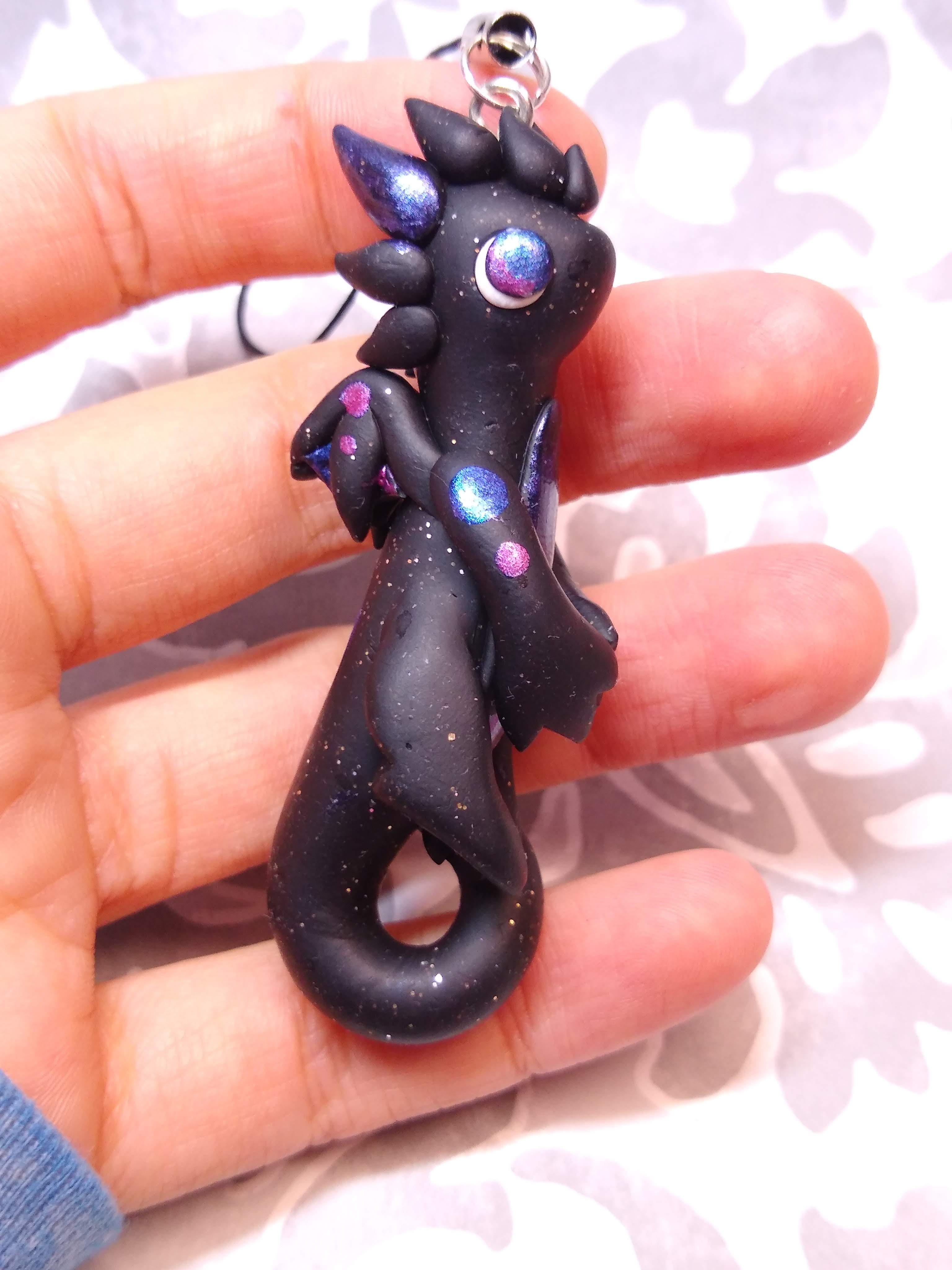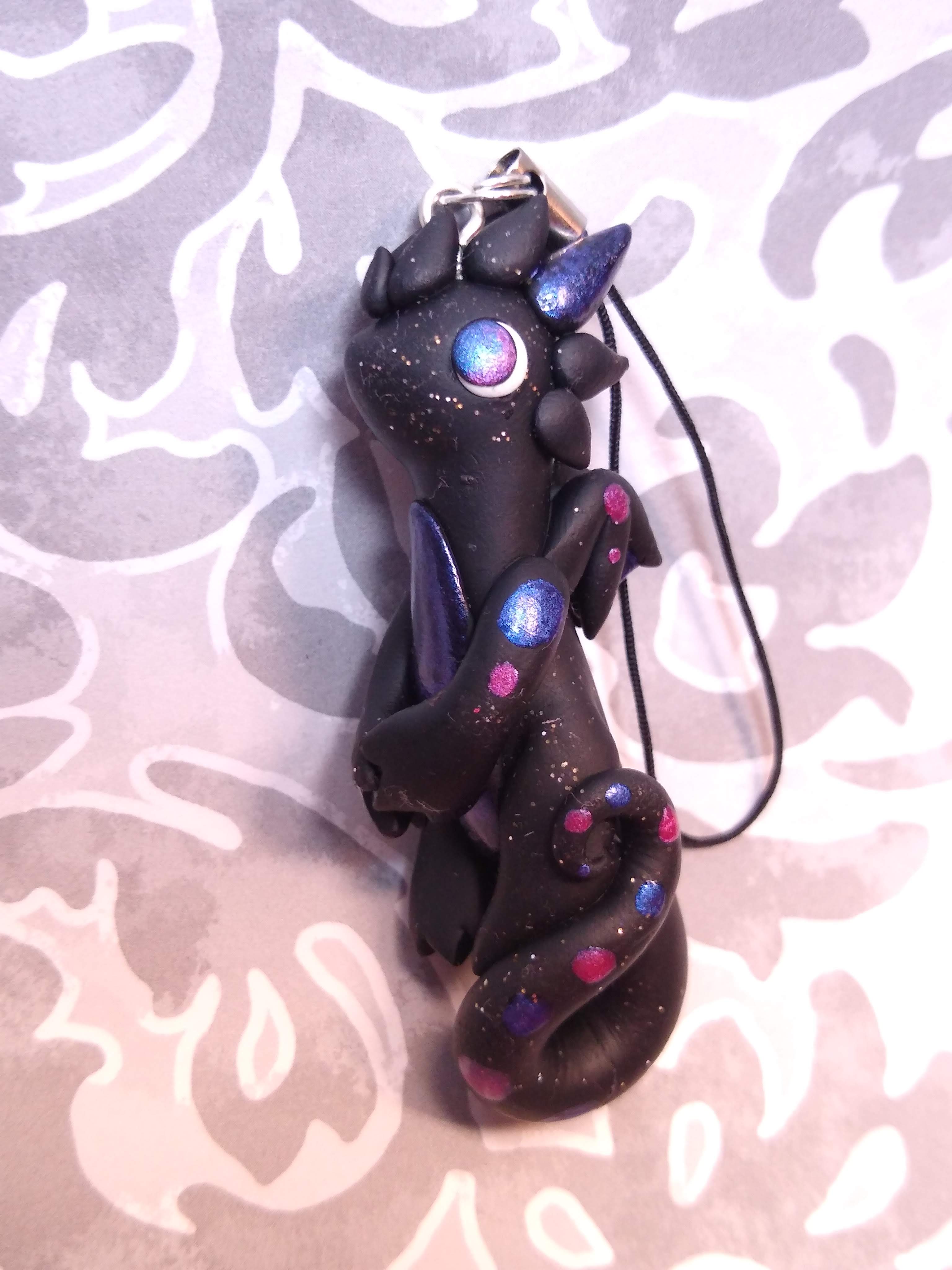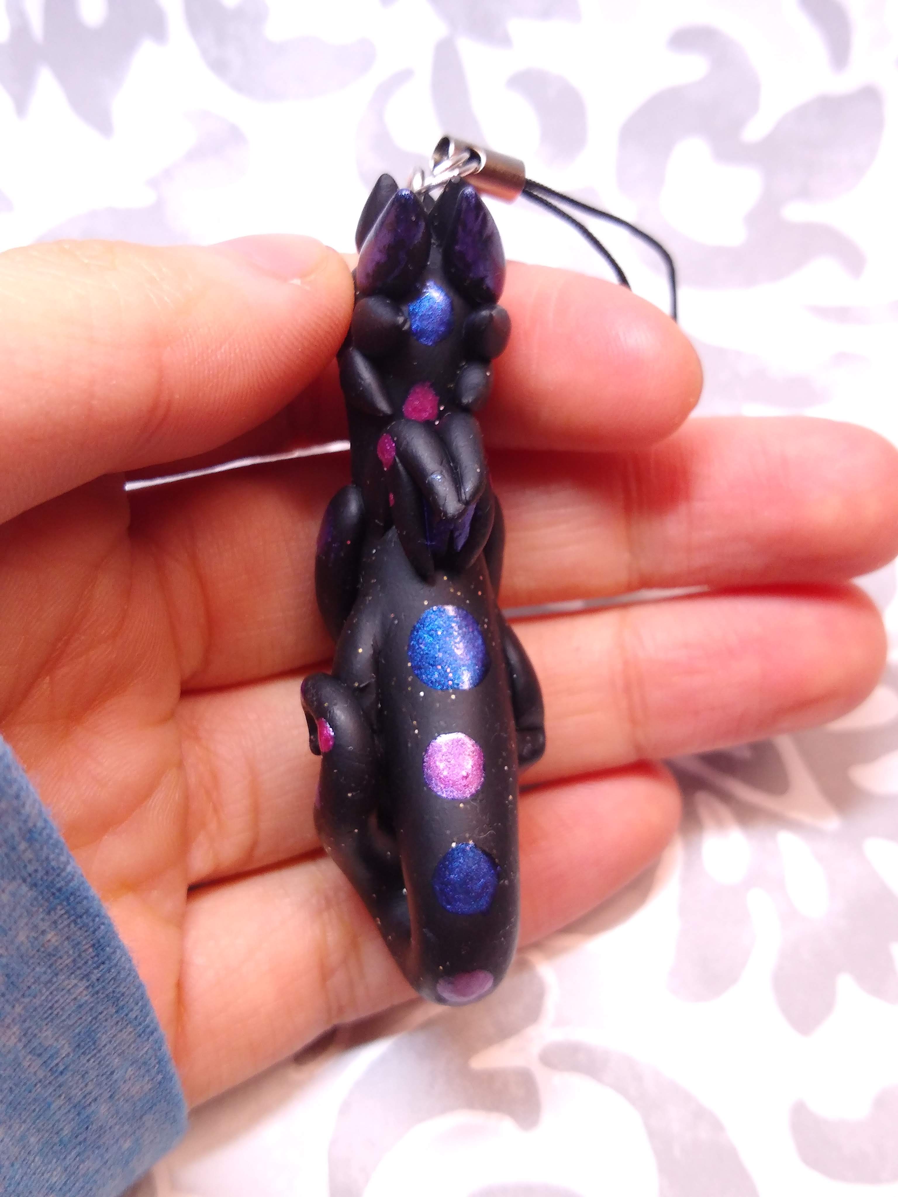 A dragon charm that is handmade from polymer clay. This one has a black base with bits of glitter. The shiny spots are sealed with glaze.