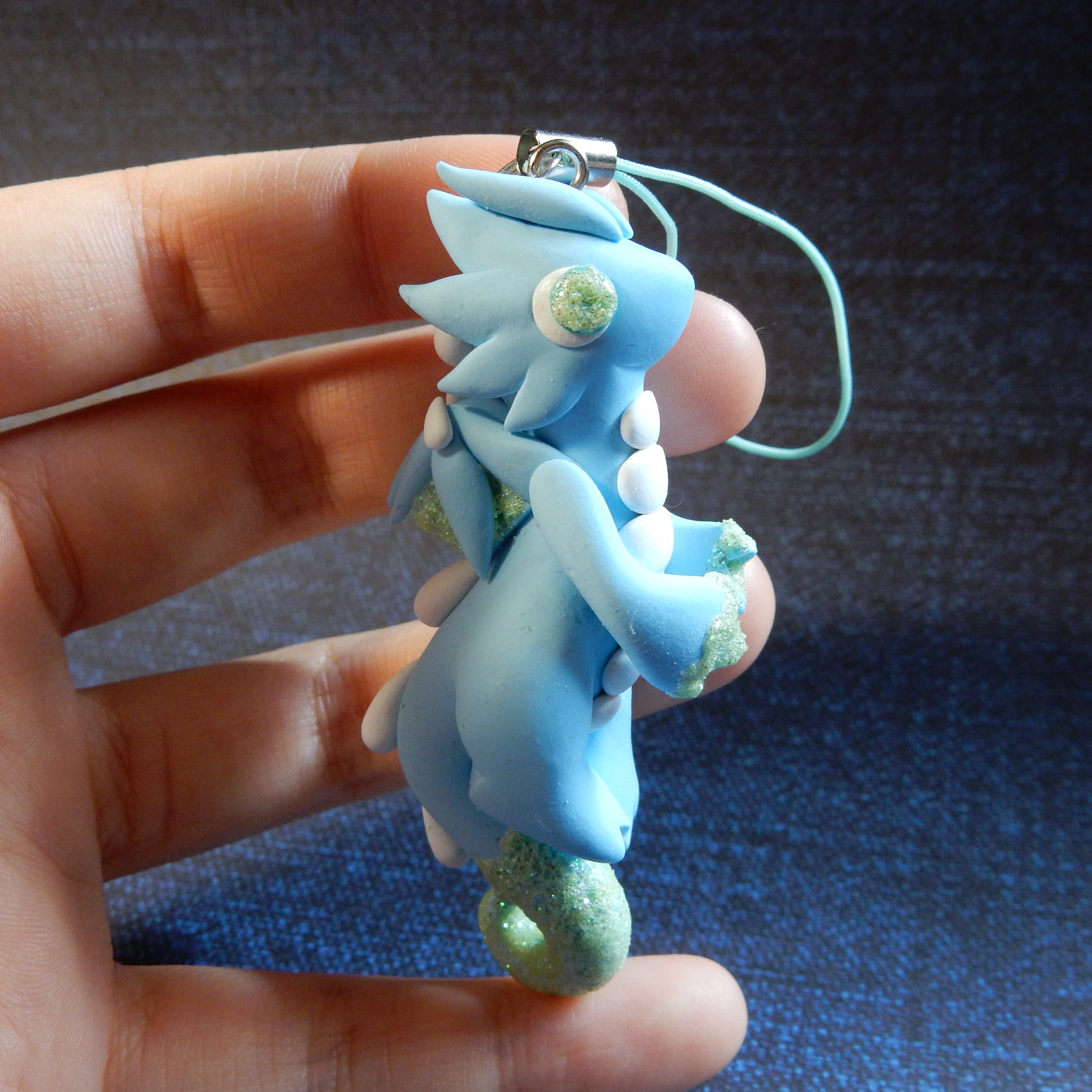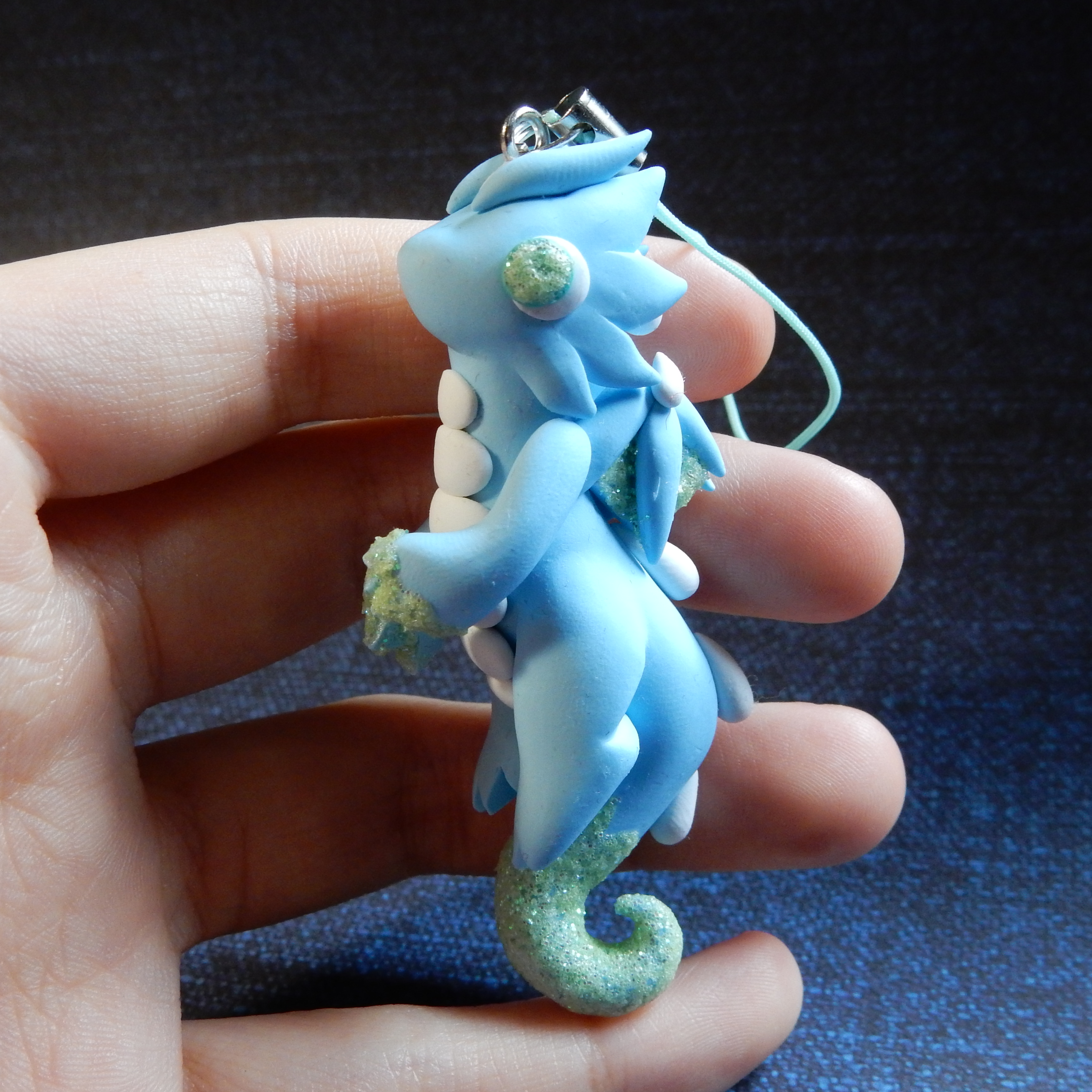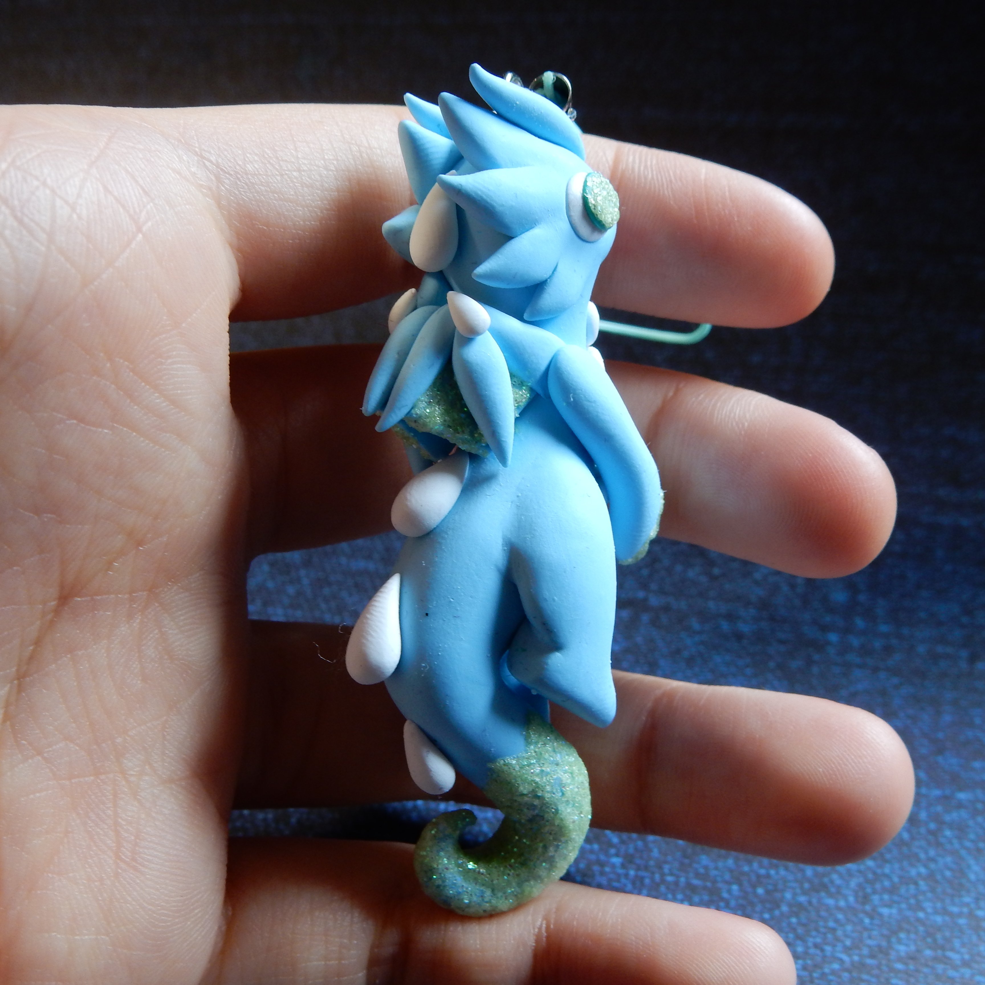 A dragon charm that is handmade from polymer clay. This one is light blue with light green glitter accents.