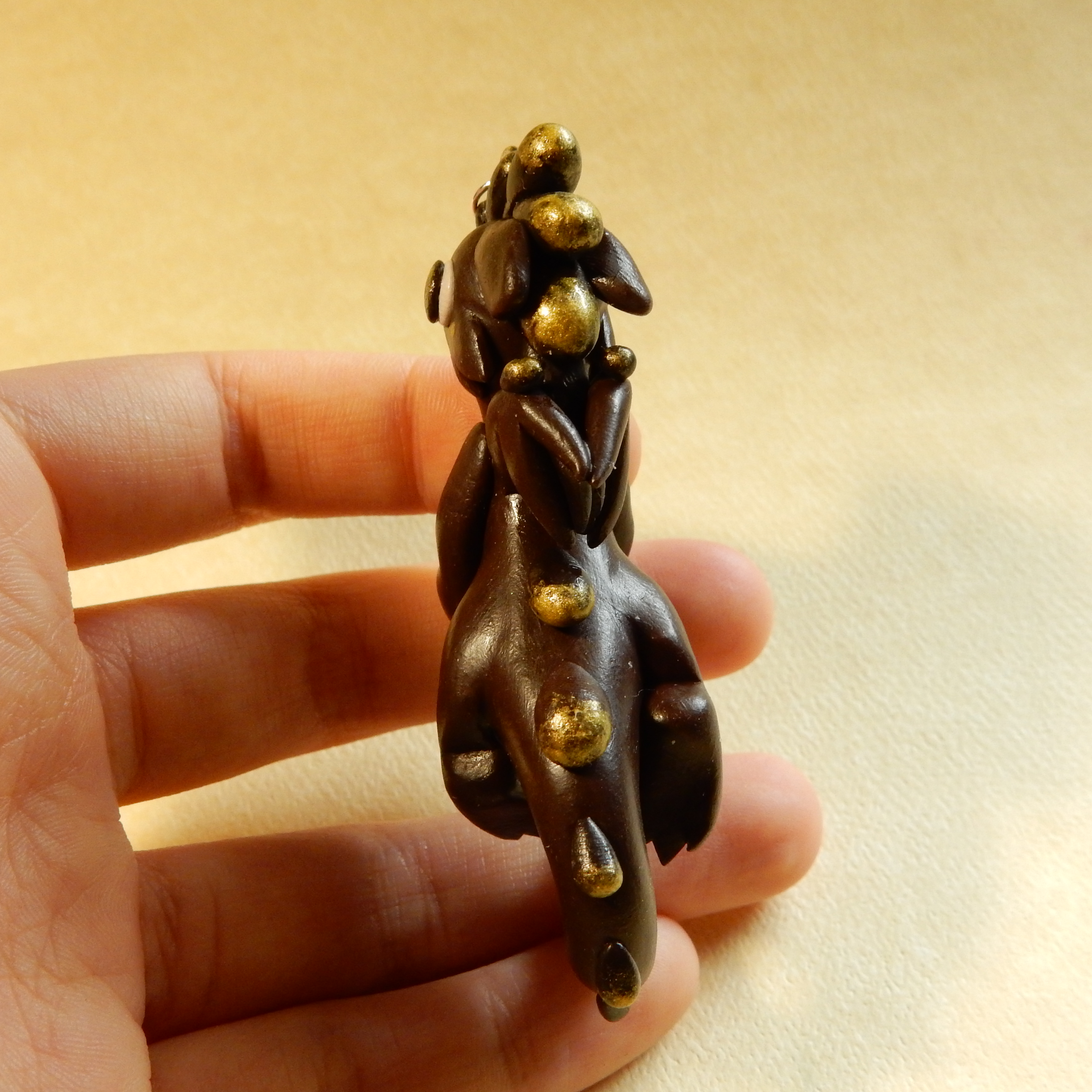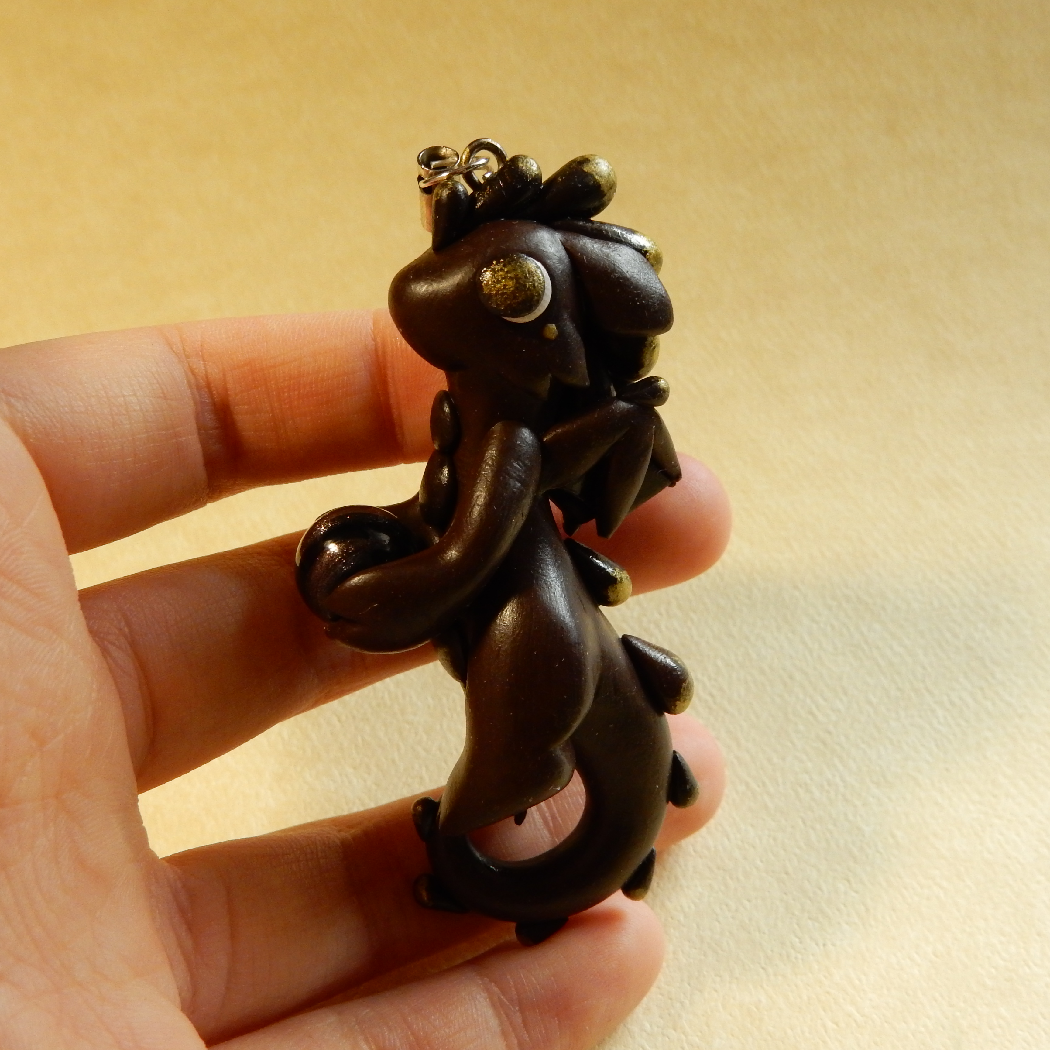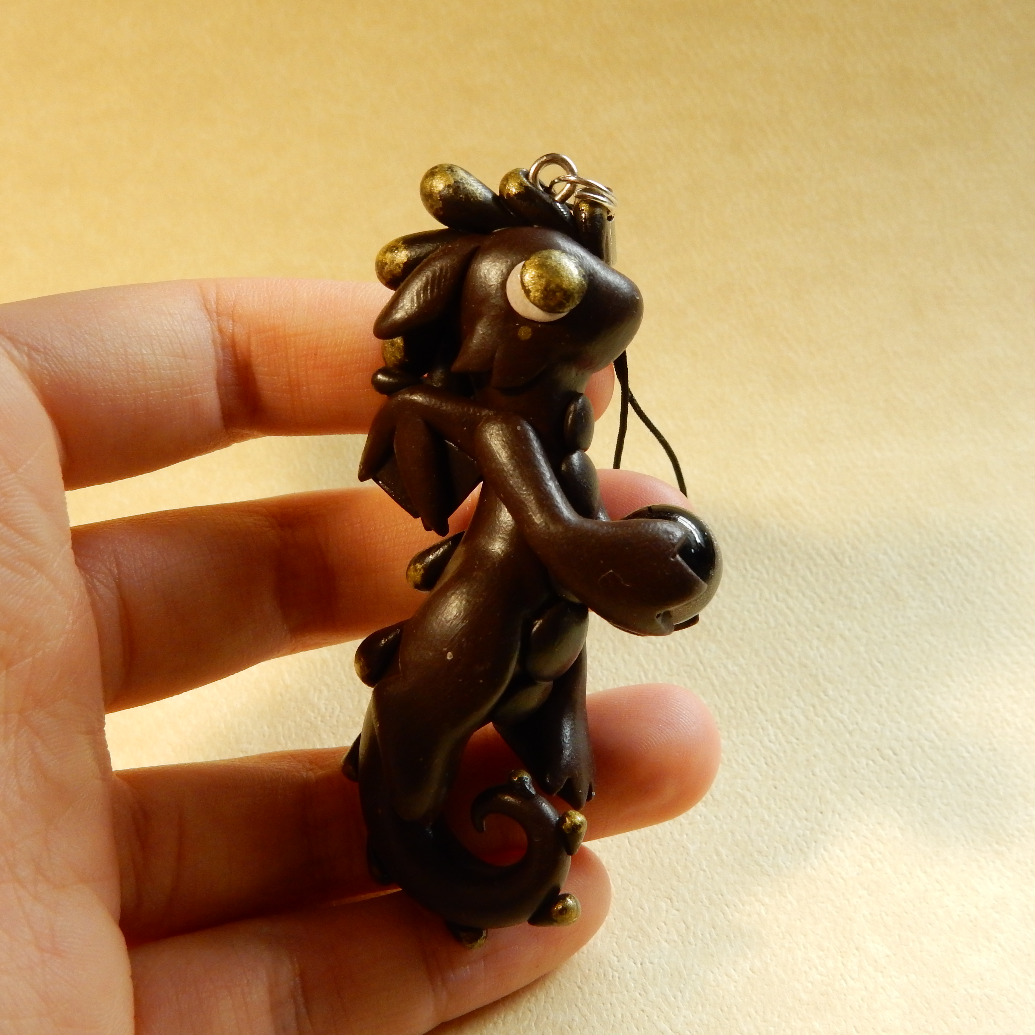 A dragon charm that is handmade from polymer clay. This one is brown with gold accents and holds a shiny bead.
