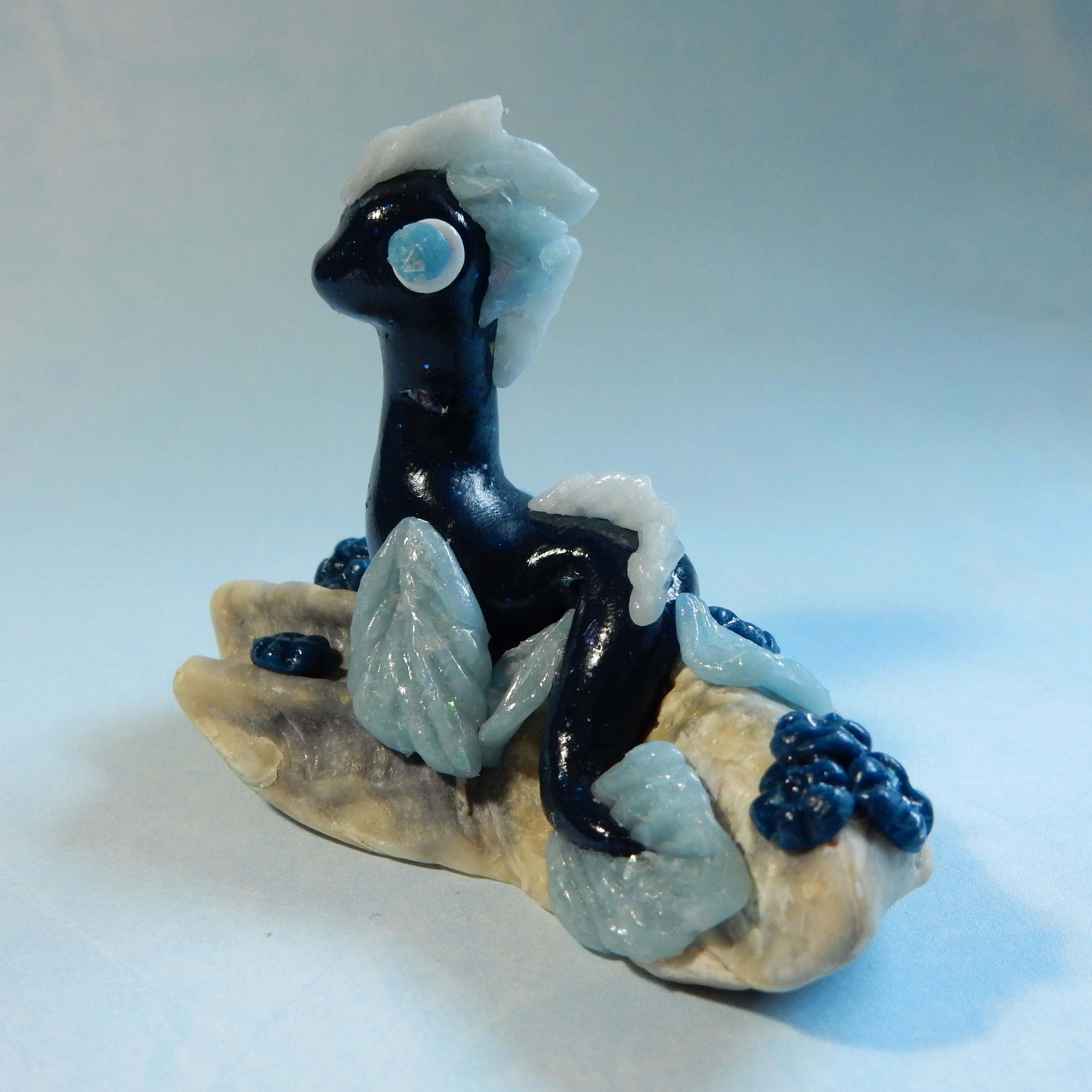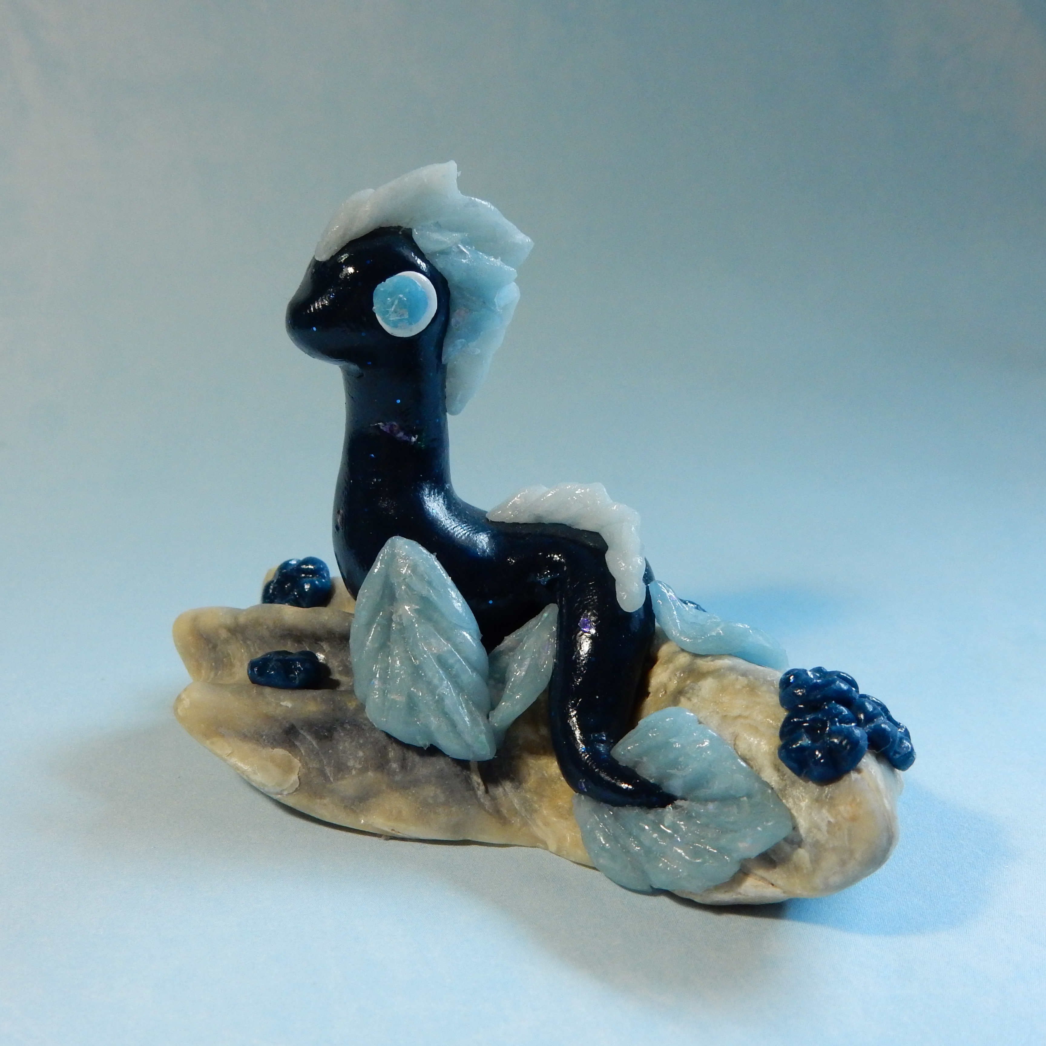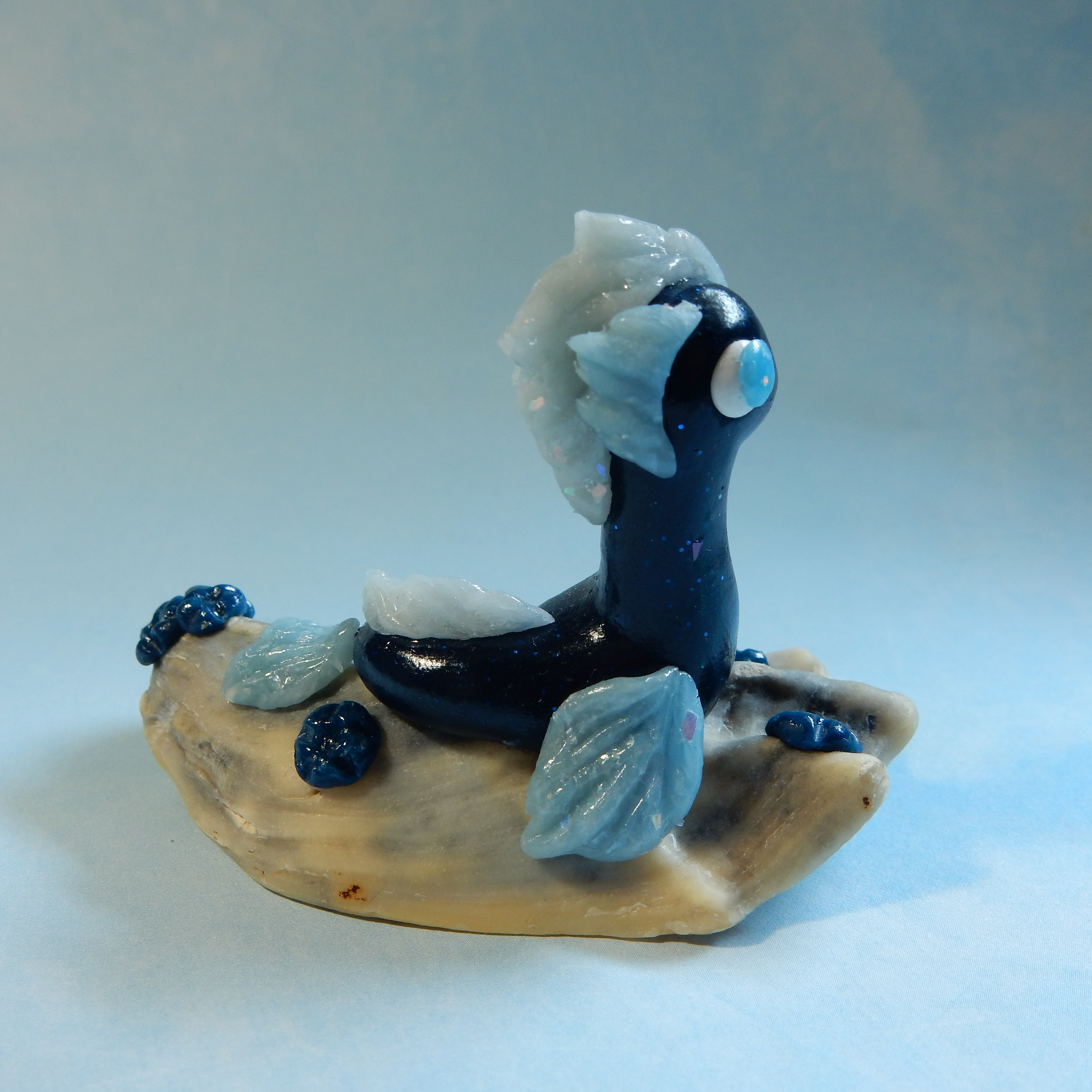 A mermaid dragon that is handmade from polymer clay. This one is dark blue and has glitter accents.