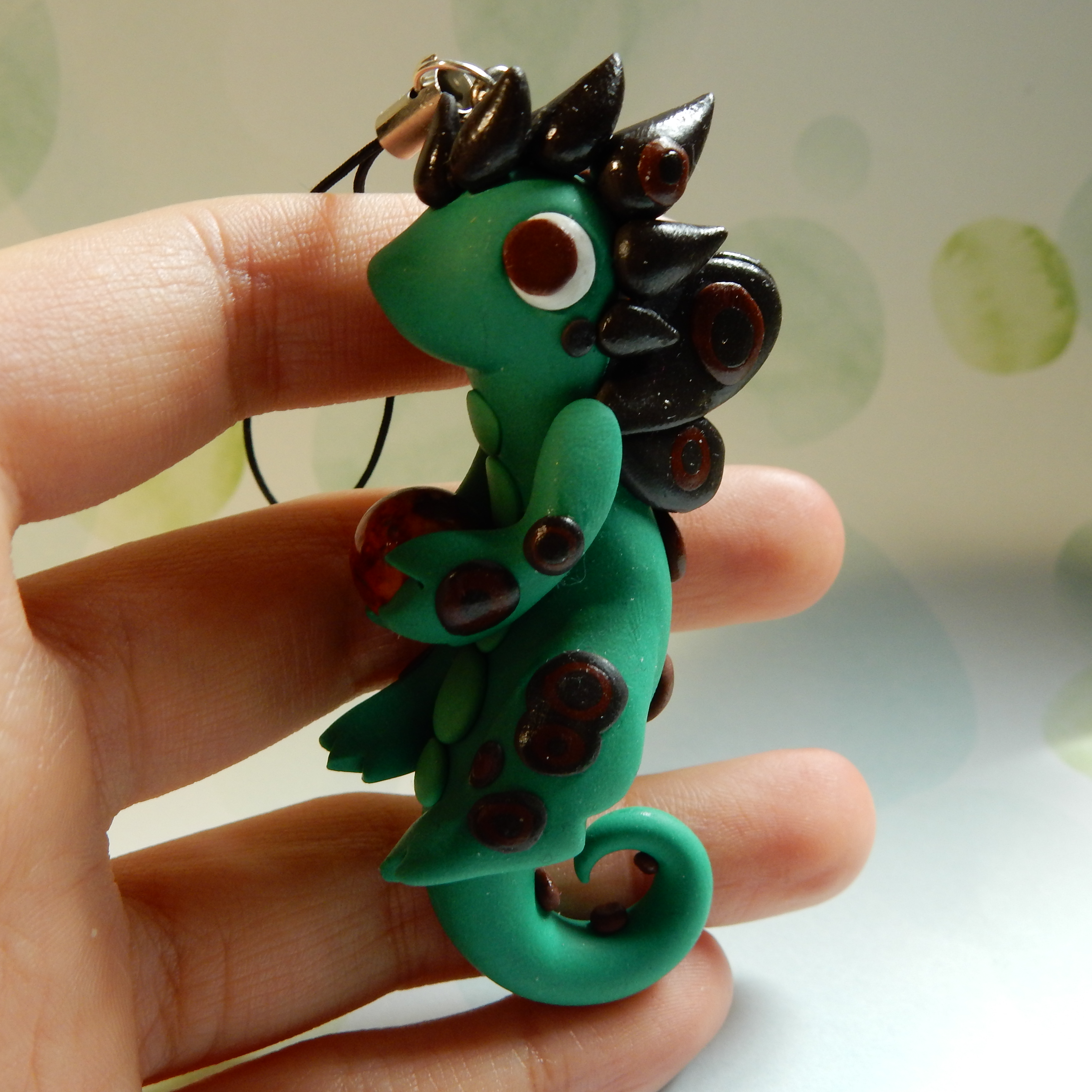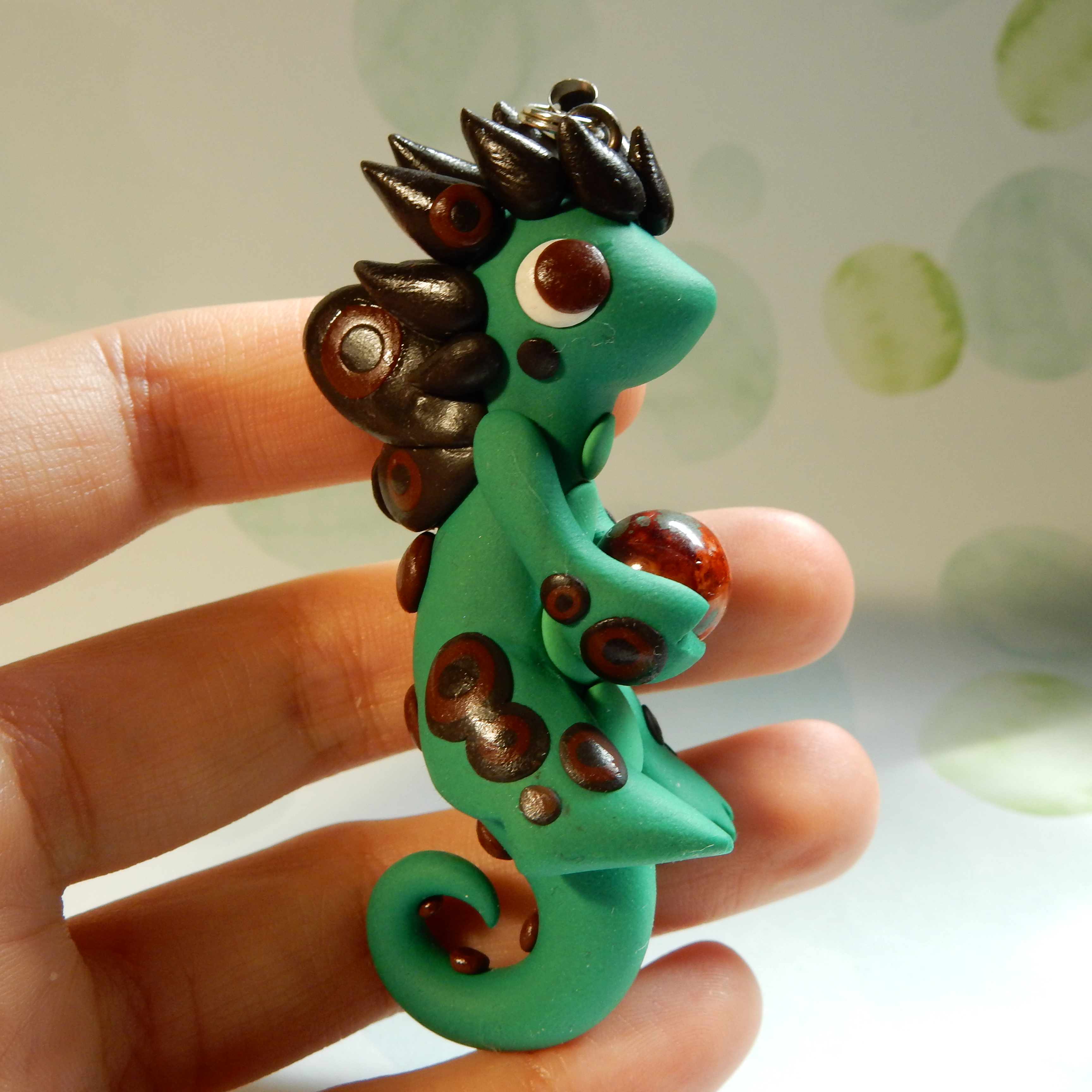A dragon charm that is handmade from polymer clay. This one is green with brown ringed spots.