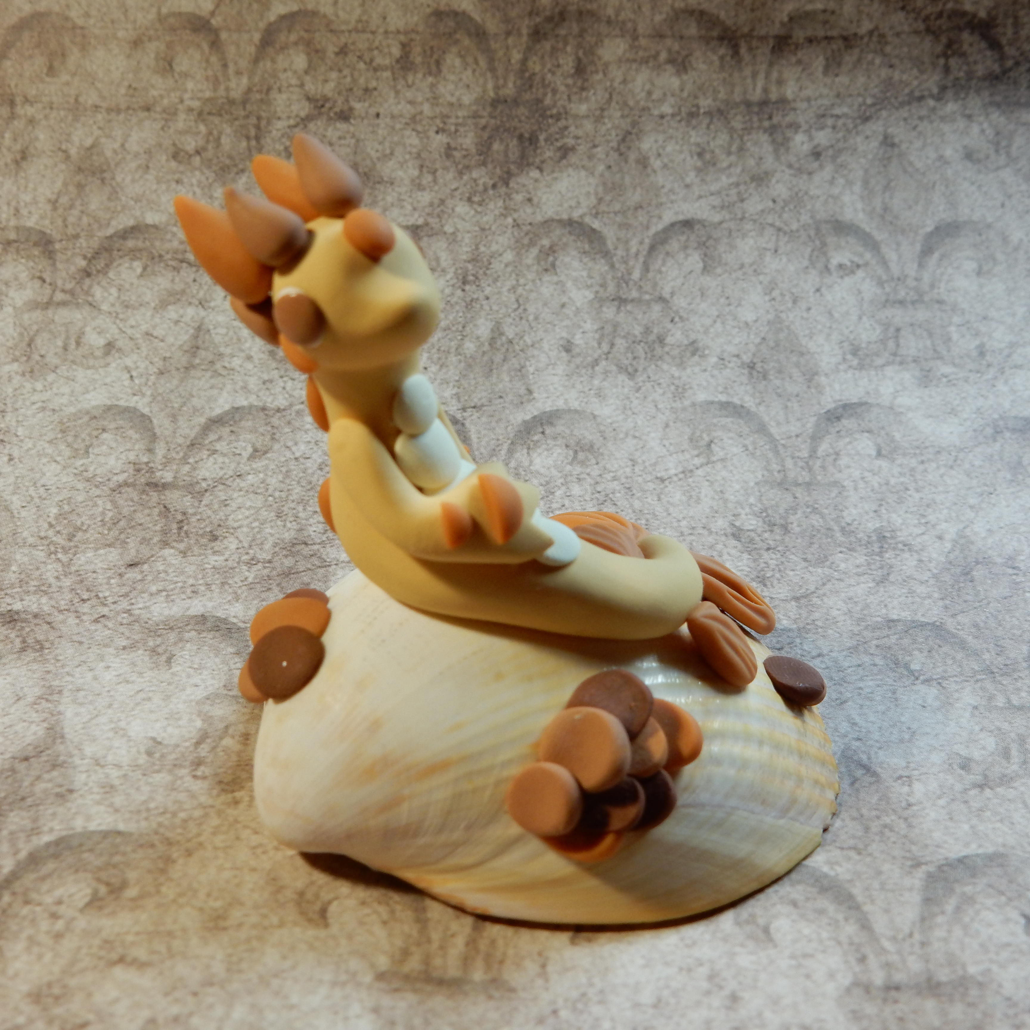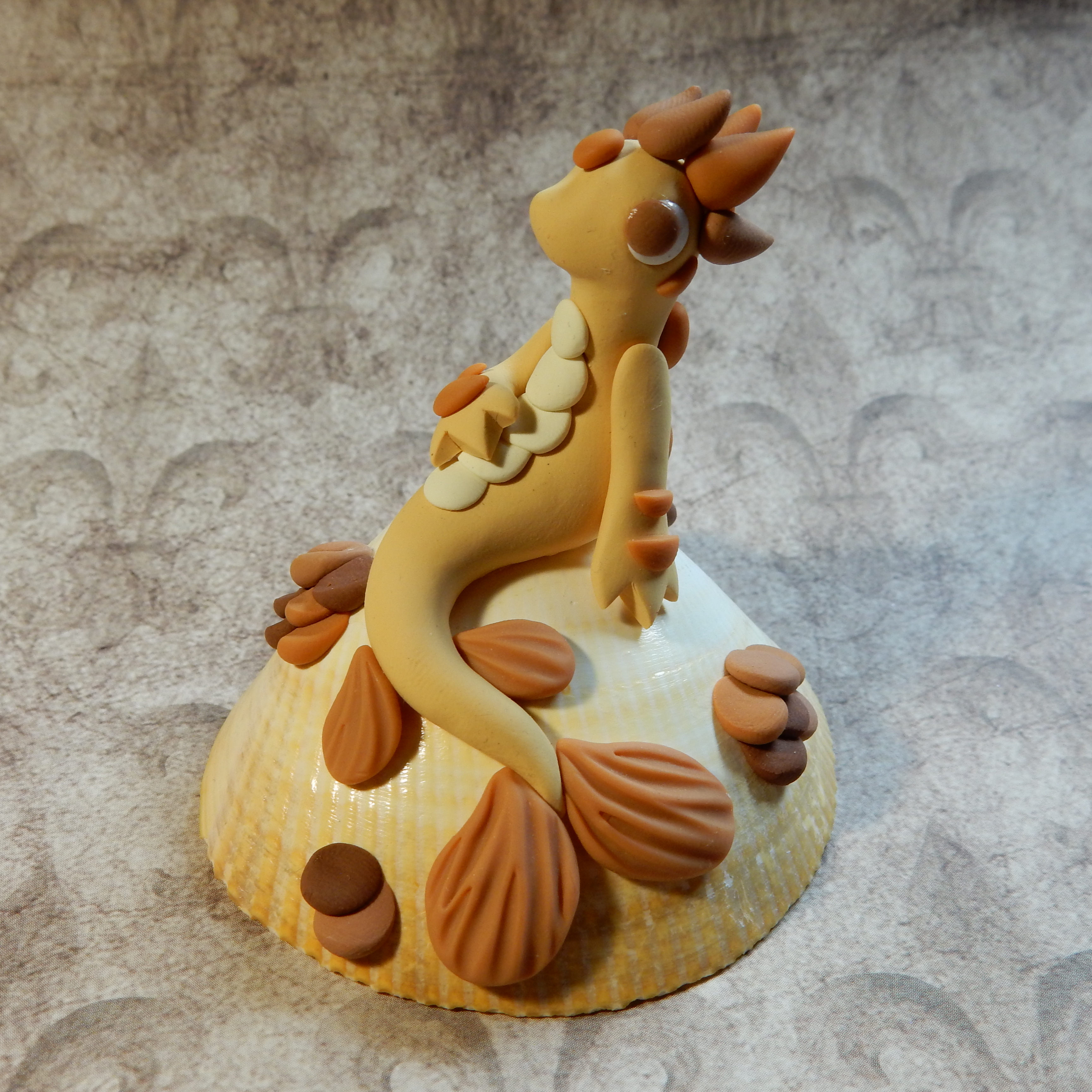 A mermaid dragon that is handmade from polymer clay. This one sits on a yellow shell that is decorated with coral..