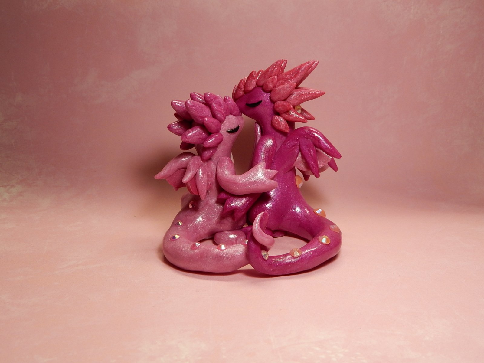 A pair of dragons handmade from polymer clay.