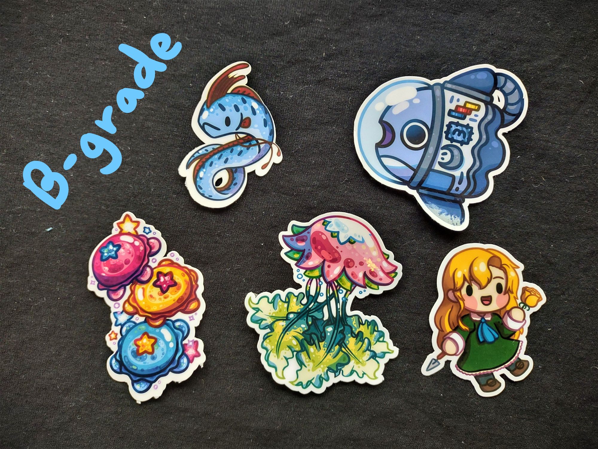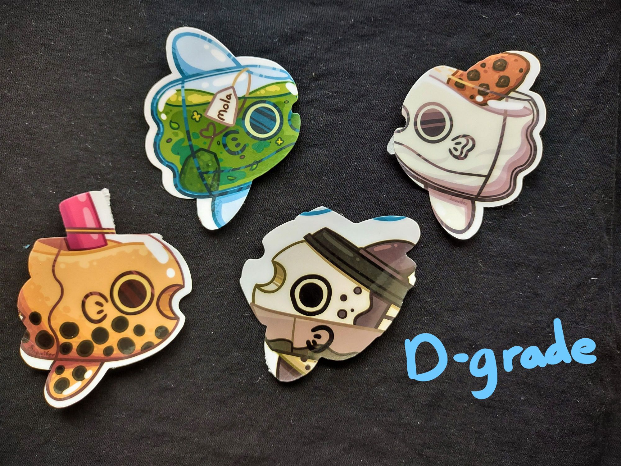 B-grade stickers are stickers with minor imperfections such as trapped dust, offset cut, etc., but are still generally fine!
