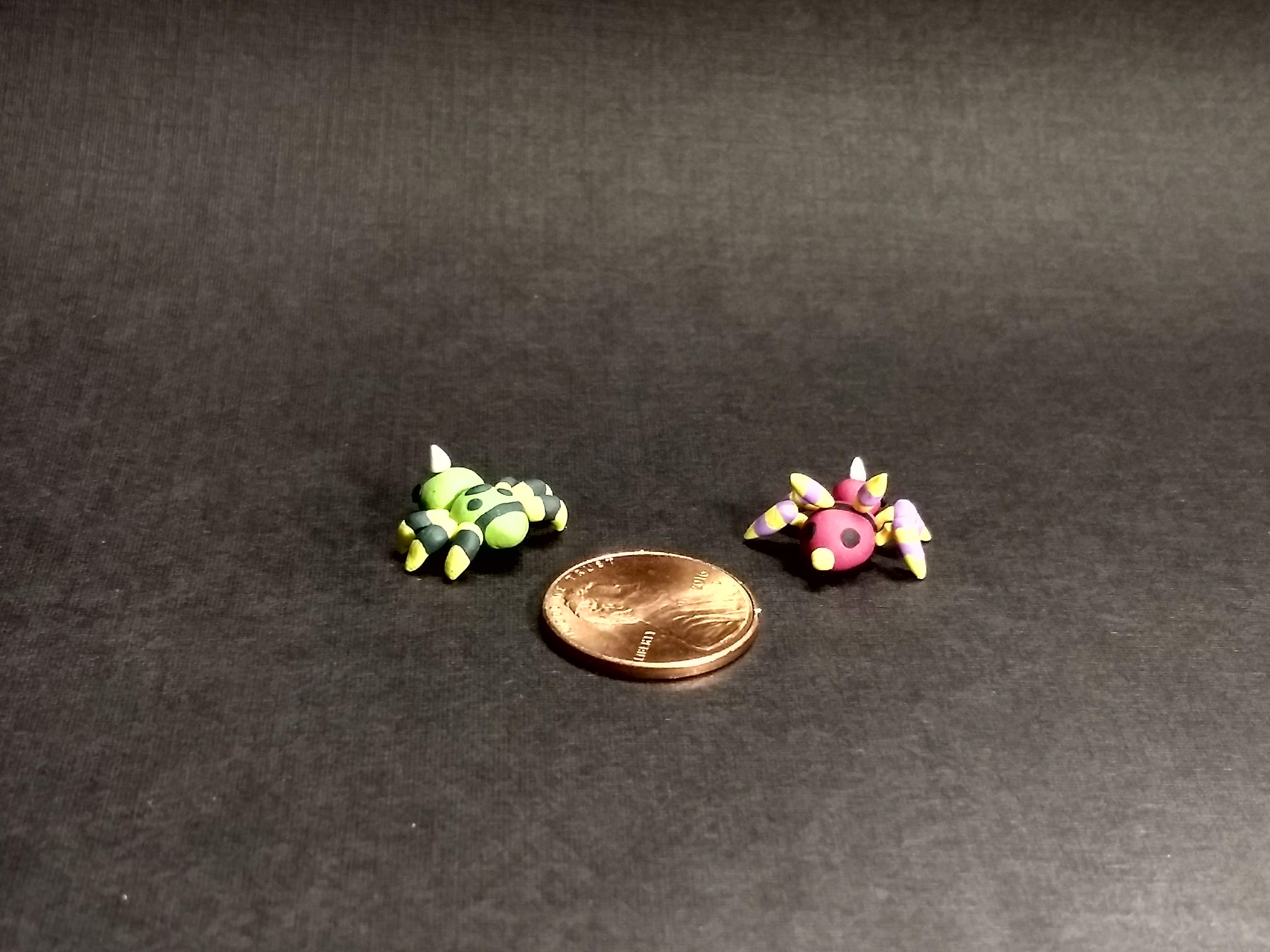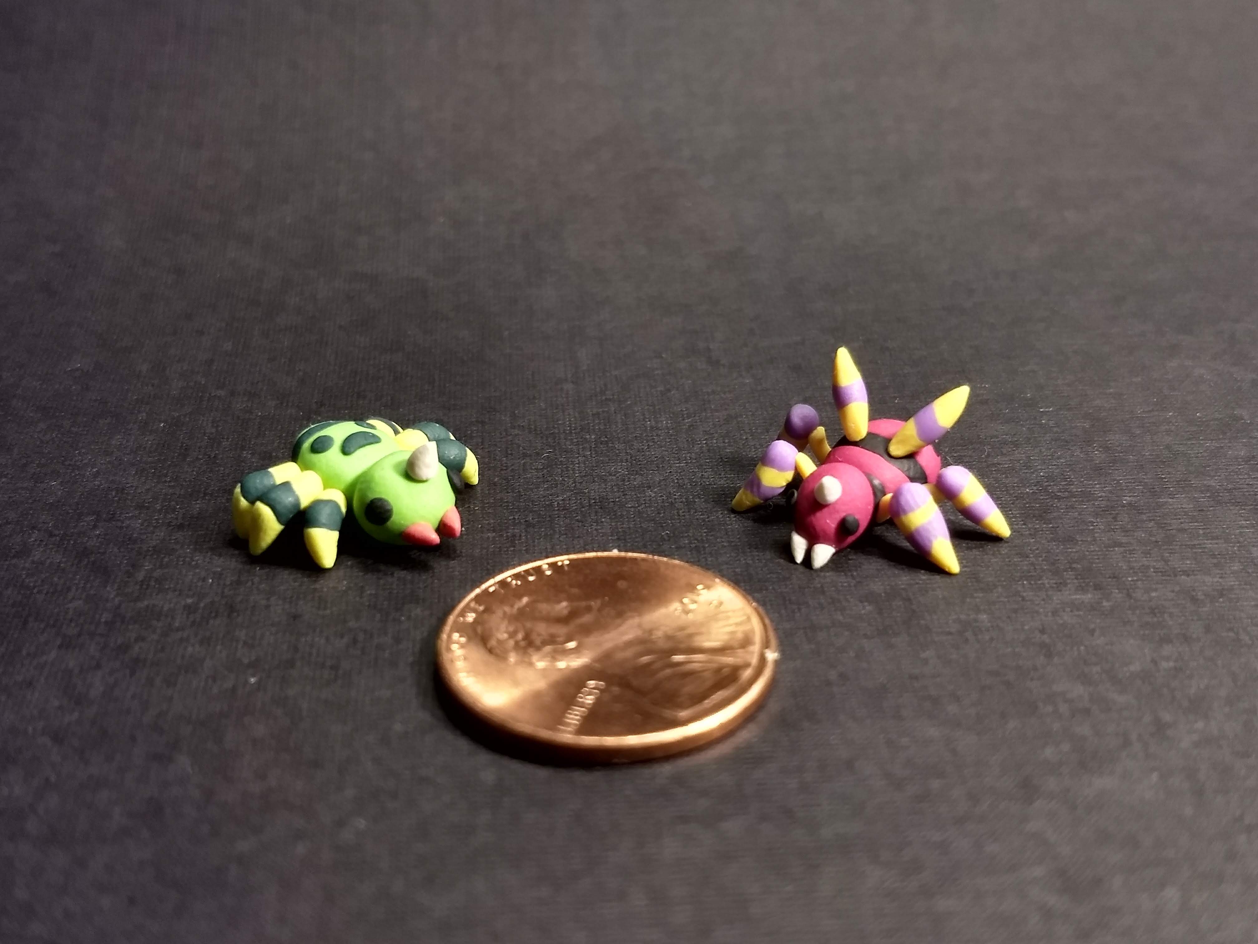 Tiny Pokemon handmade from polymer clay. Spinarak and Ariados.
