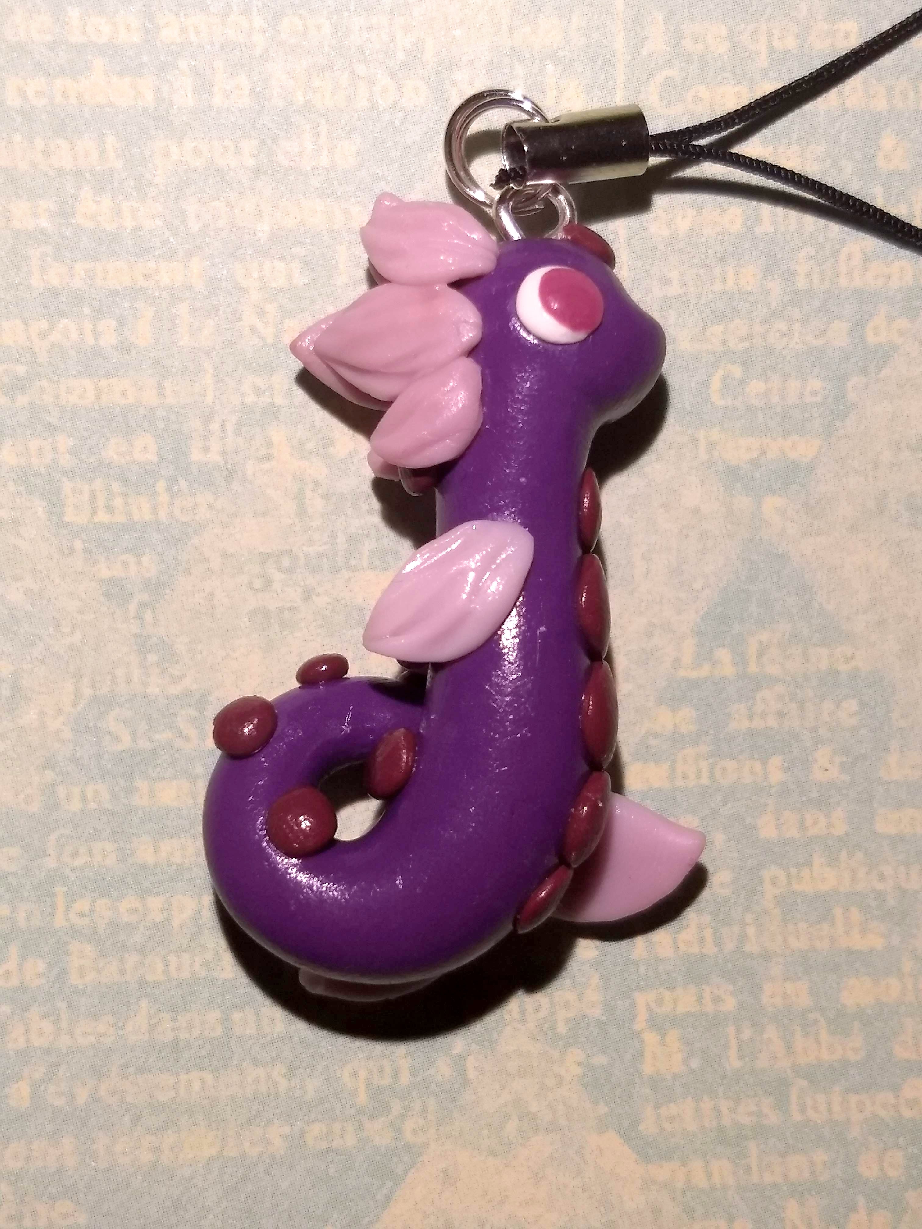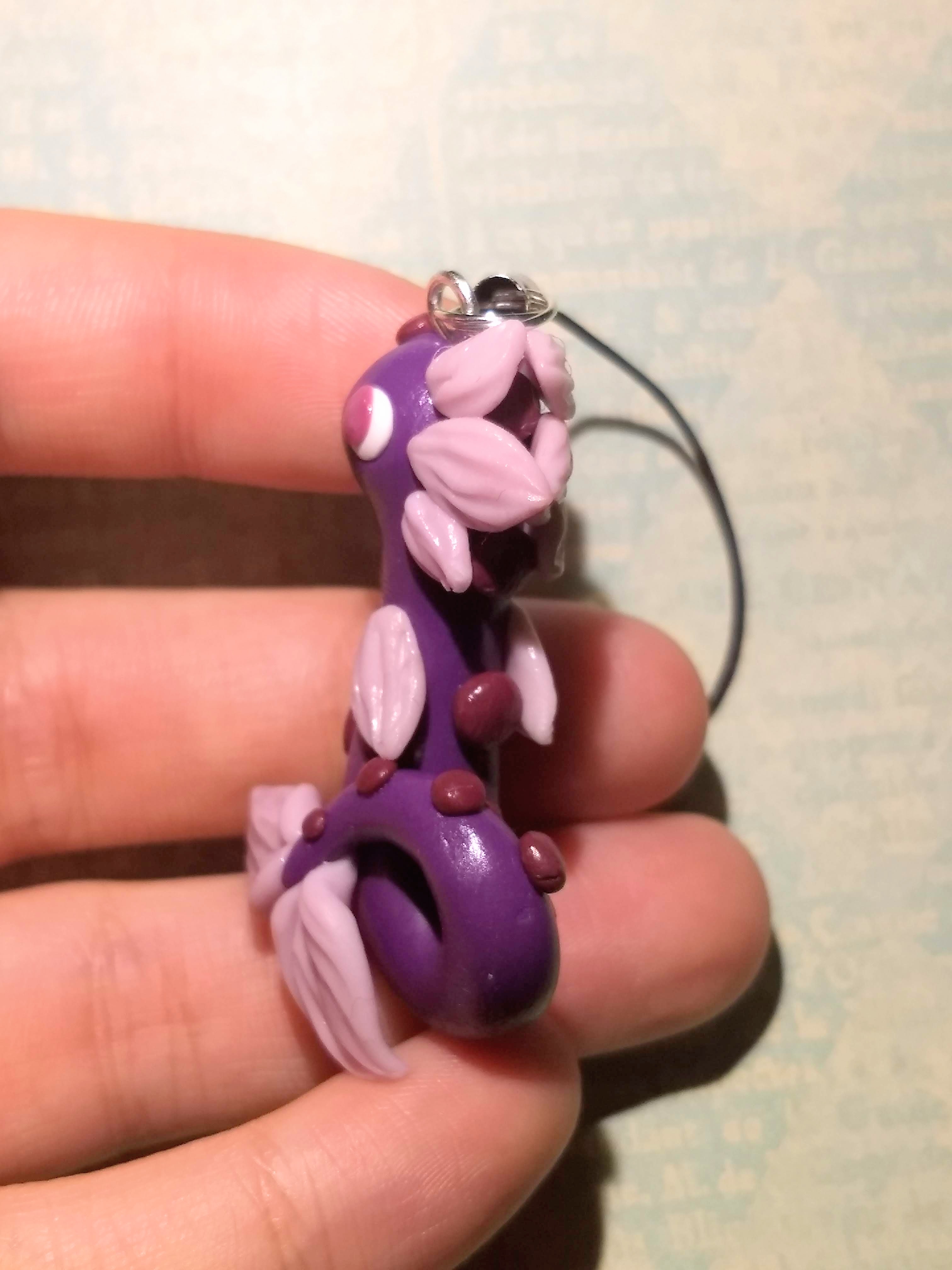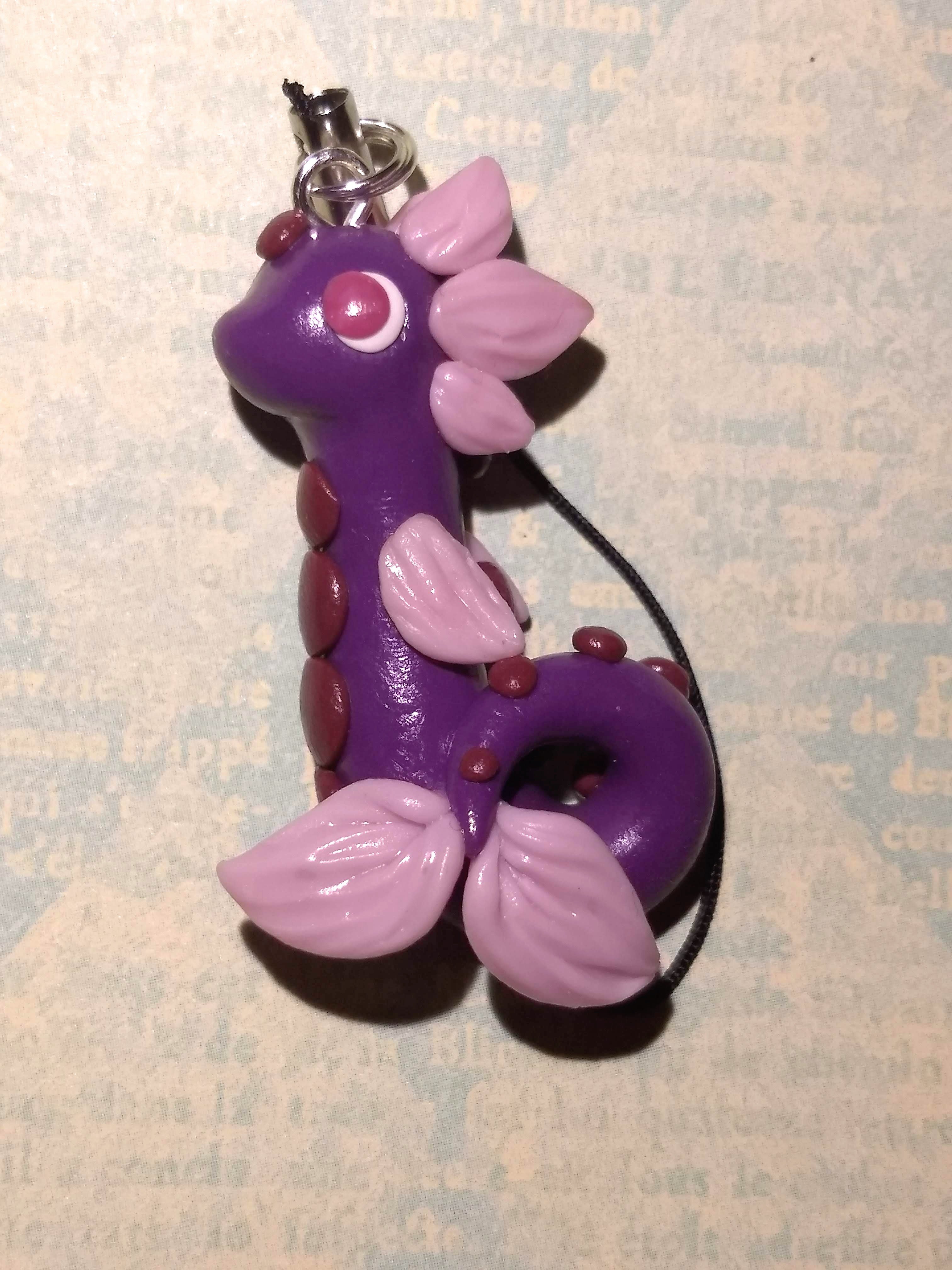 A dragon charm handmade from polymer clay. This dragon features wavy, light purple fins on a darker body.