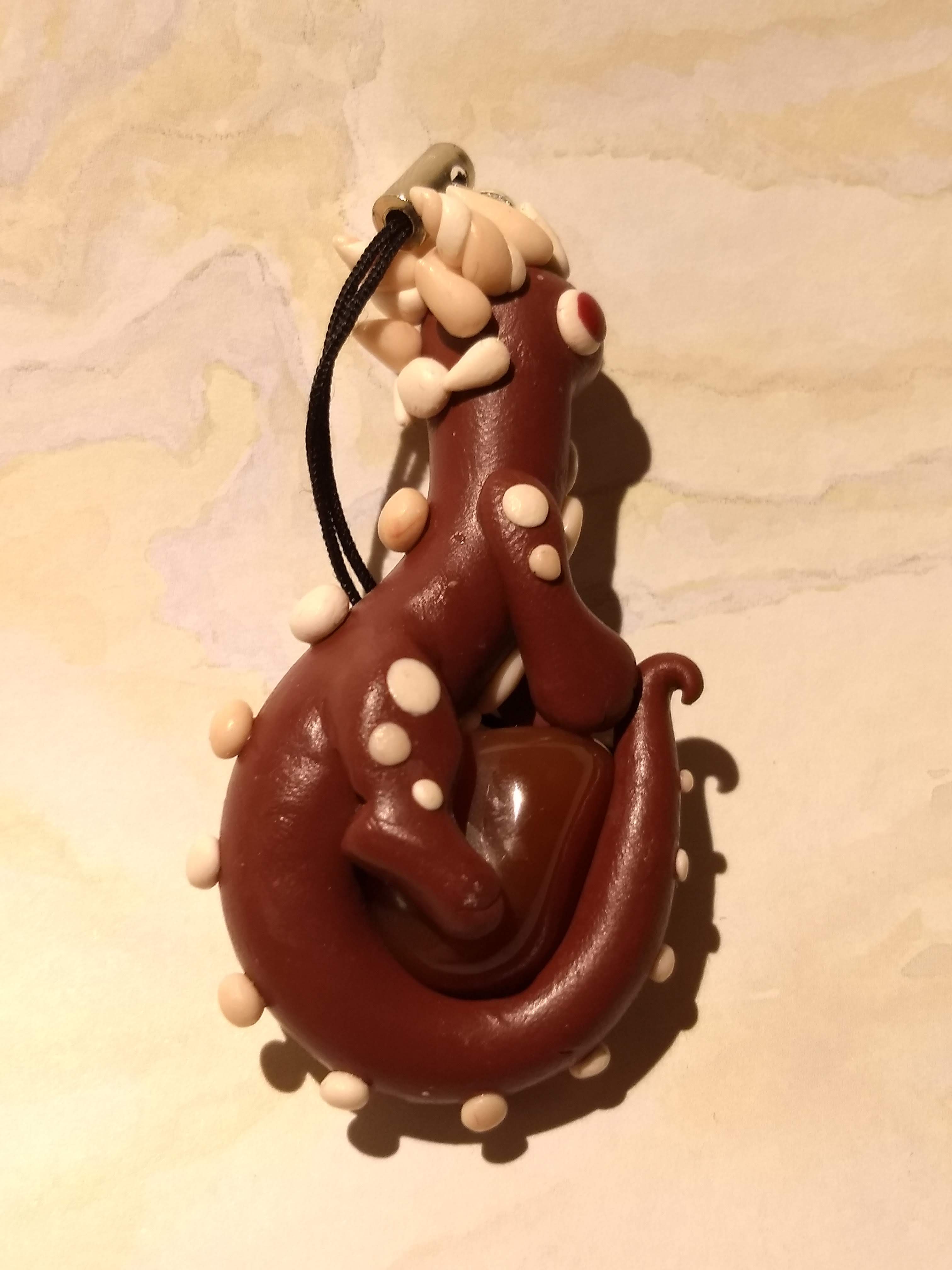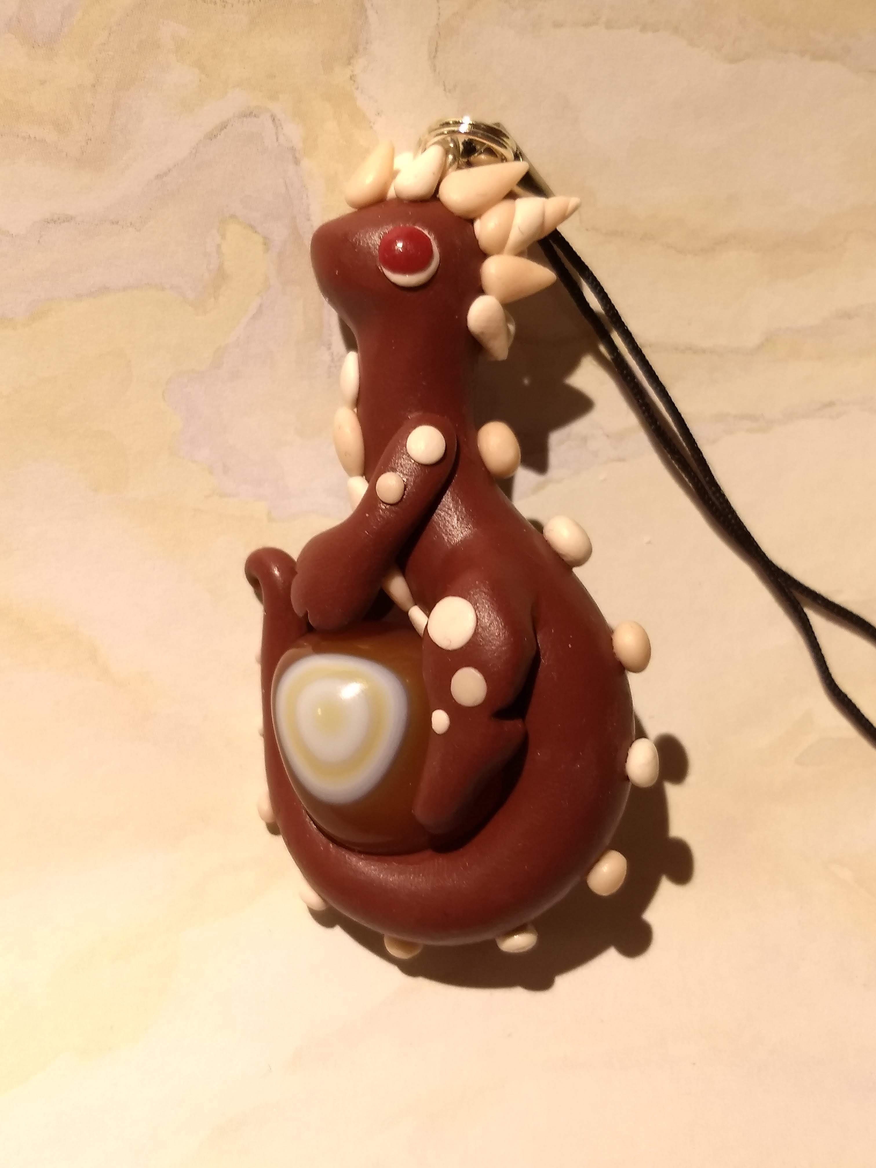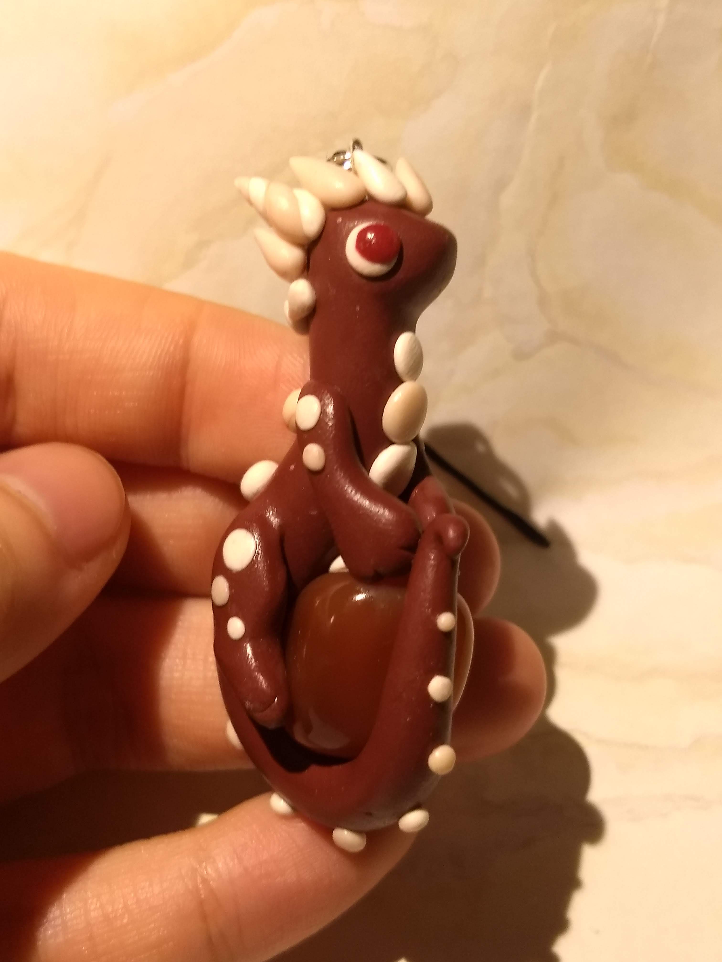 A dragon charm handmade from polymer clay. This dragon has a set of tiny horns around its head.