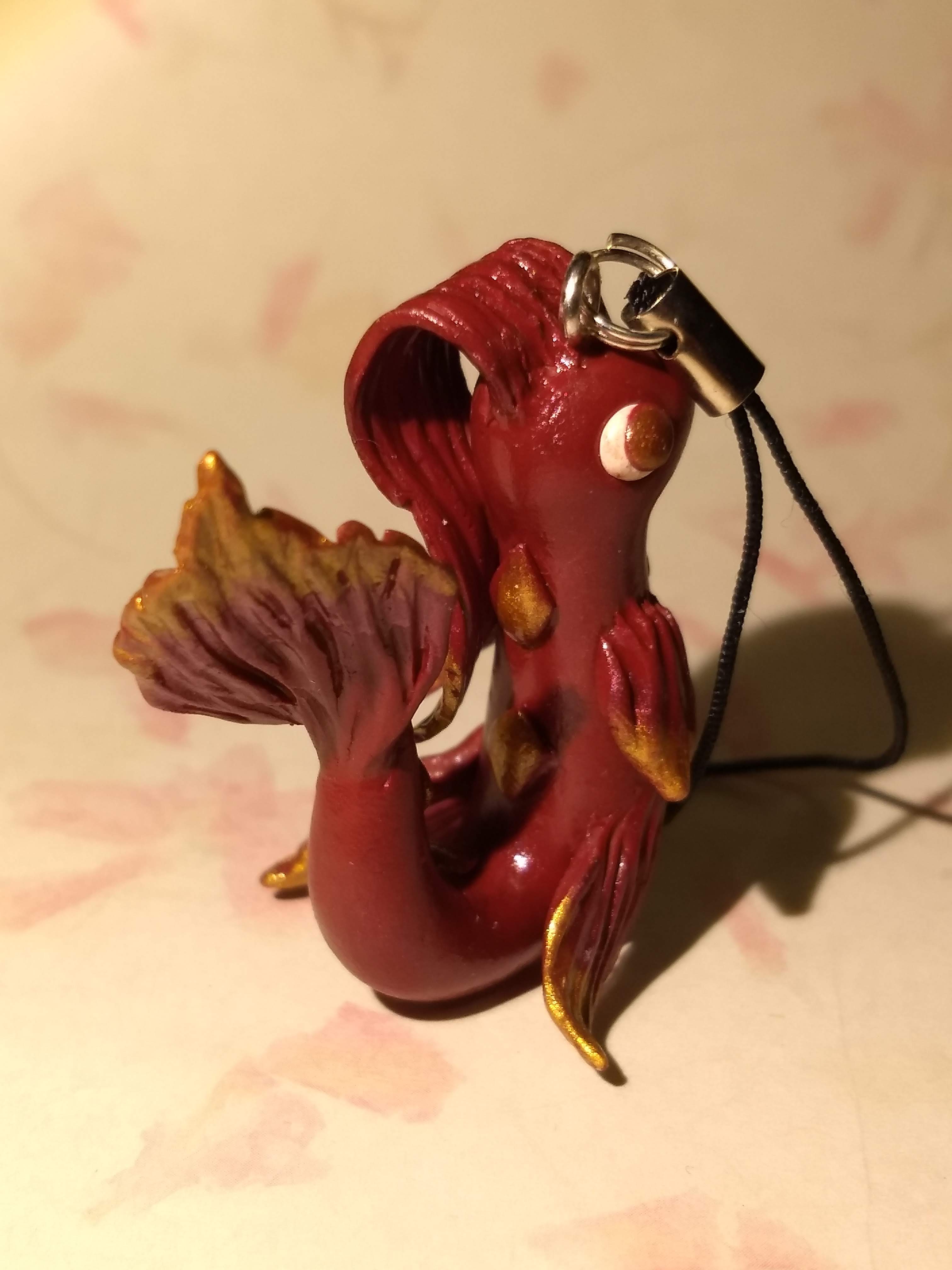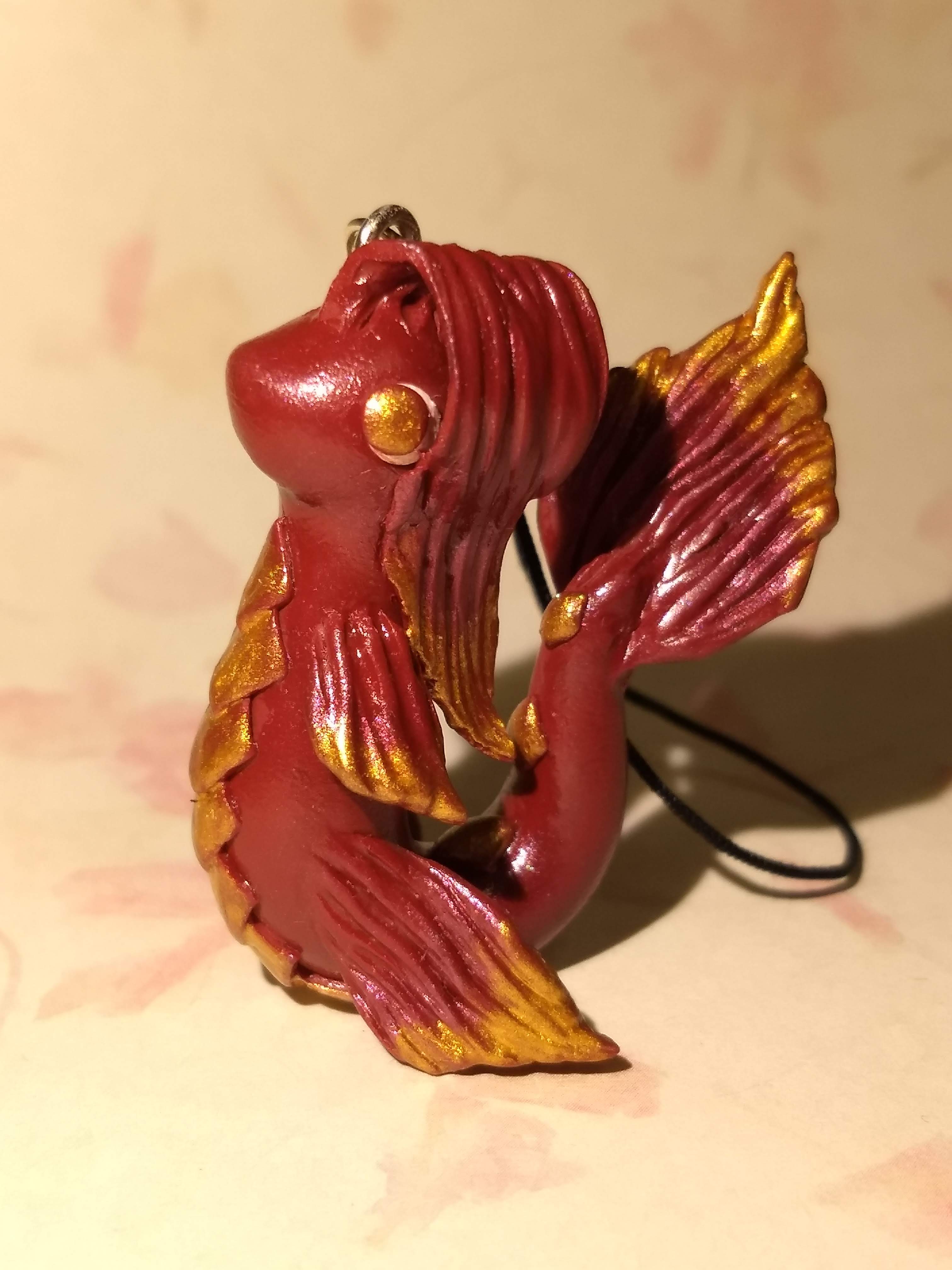 A dragon charm handmade from polymer clay. This dragon has delicate fins and a slight shimmer.