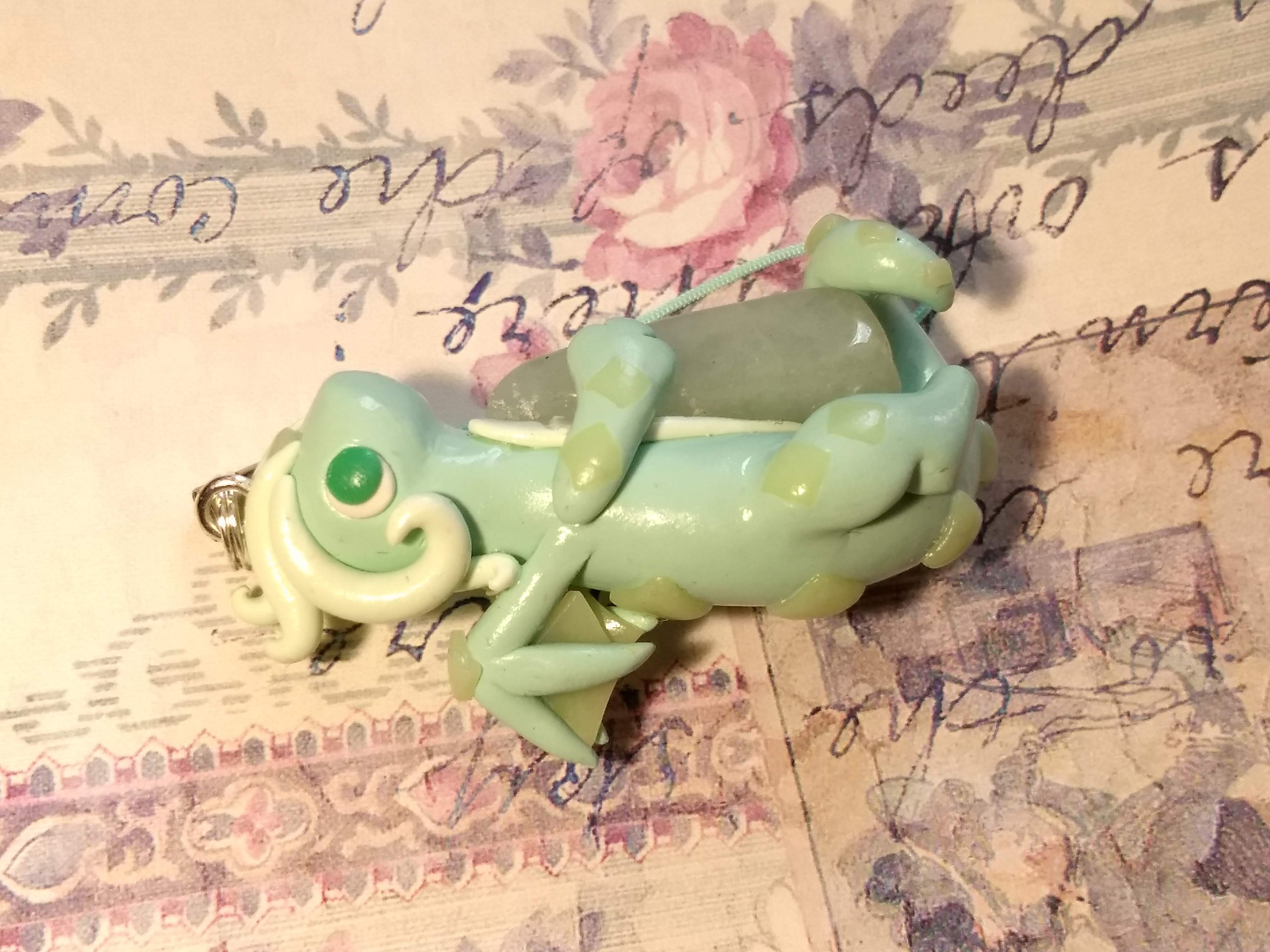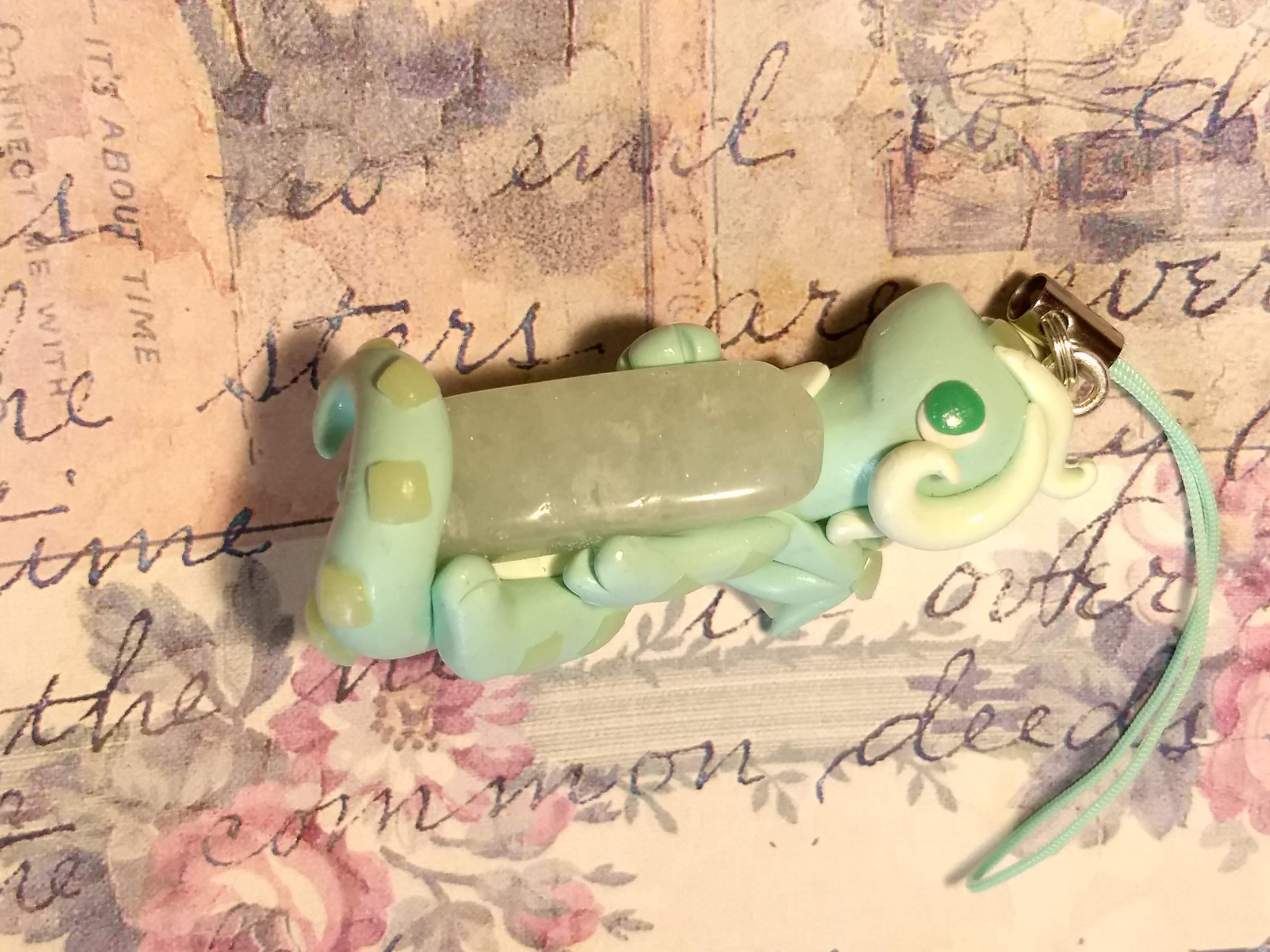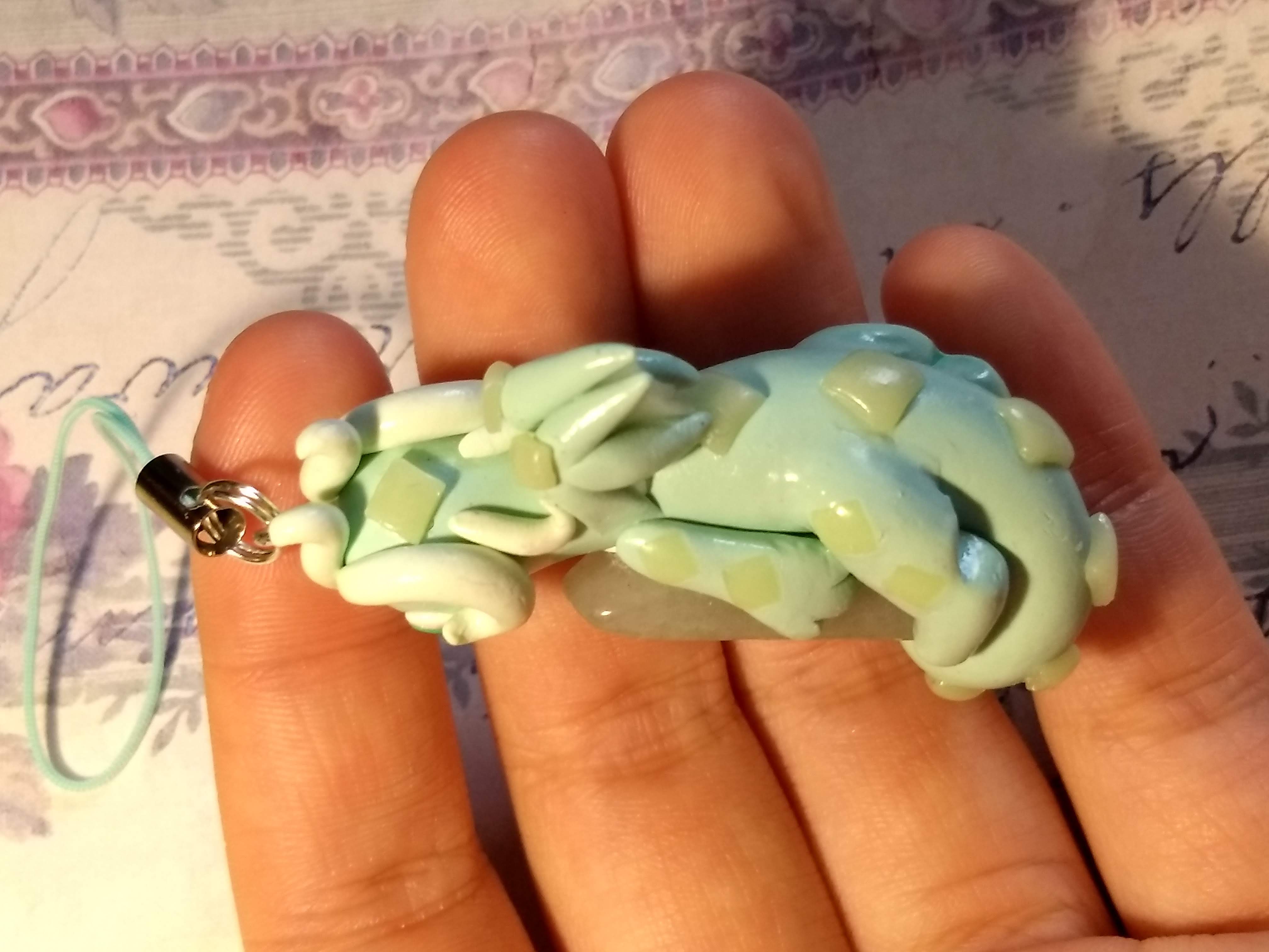 A handmade dragon charm that's made of polymer clay. This one hugs a green stone and has a square pattern.