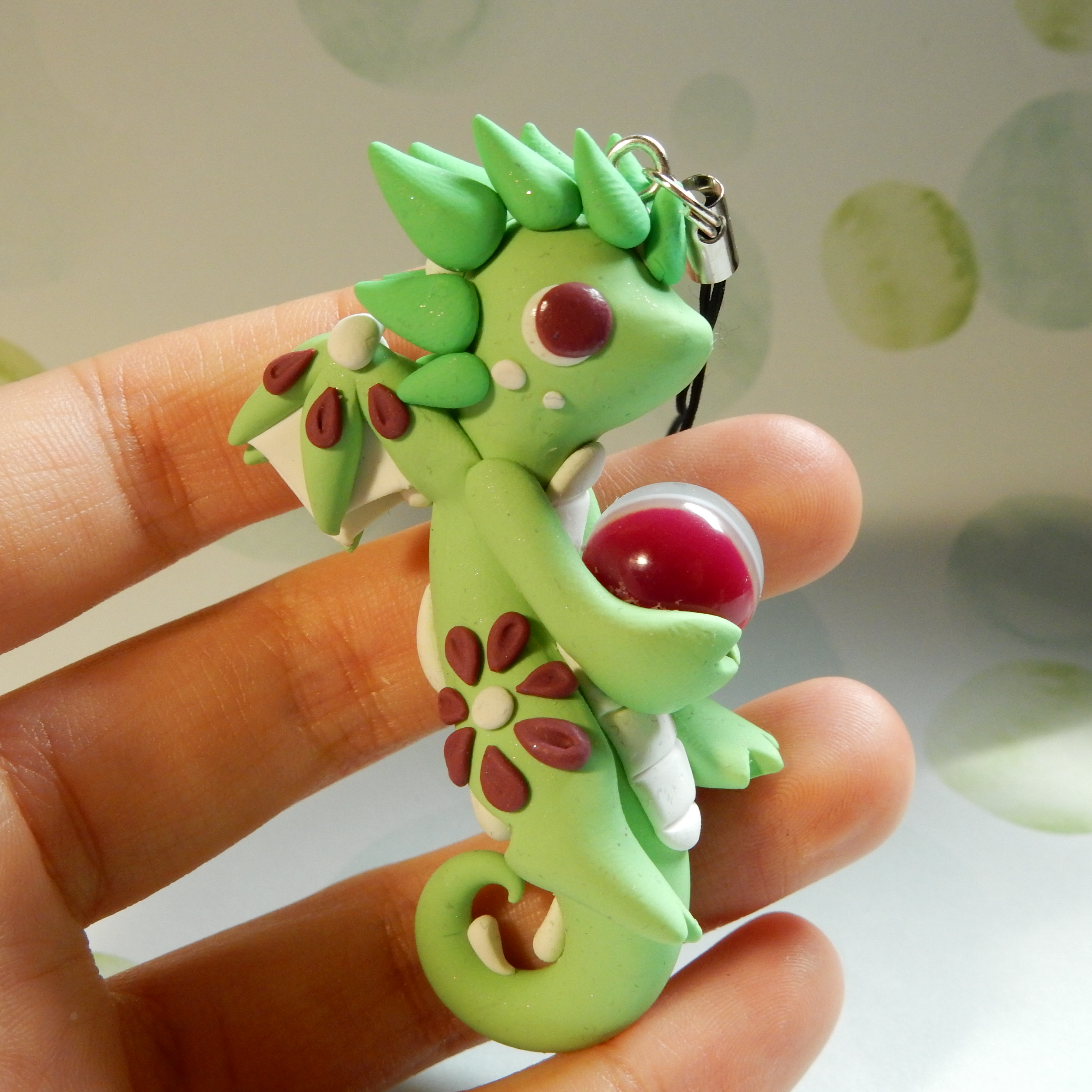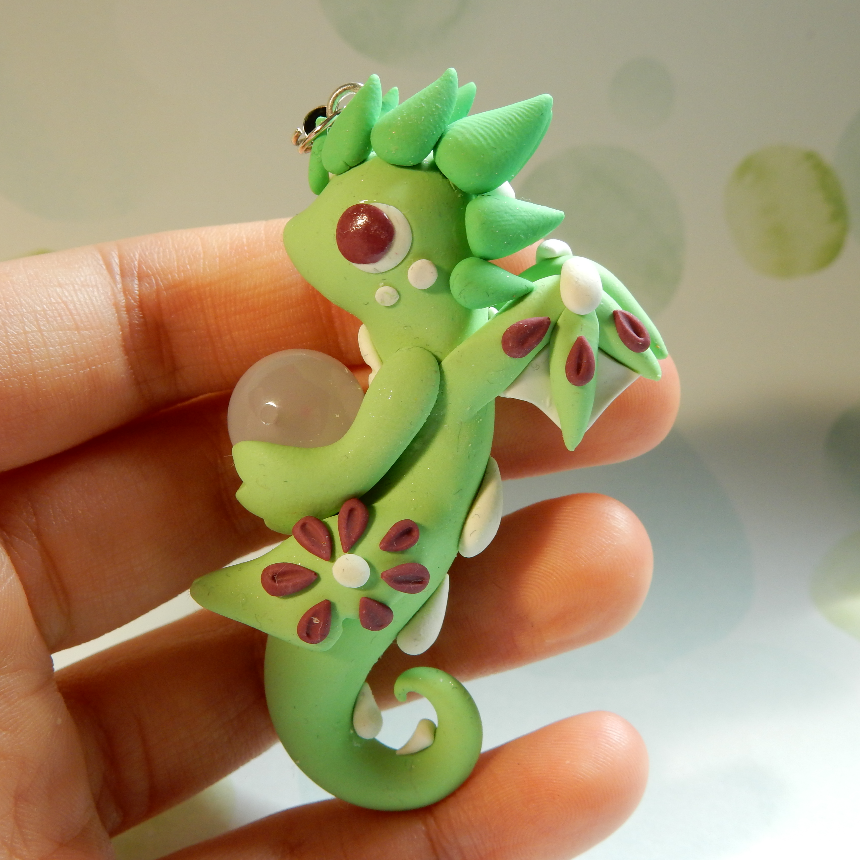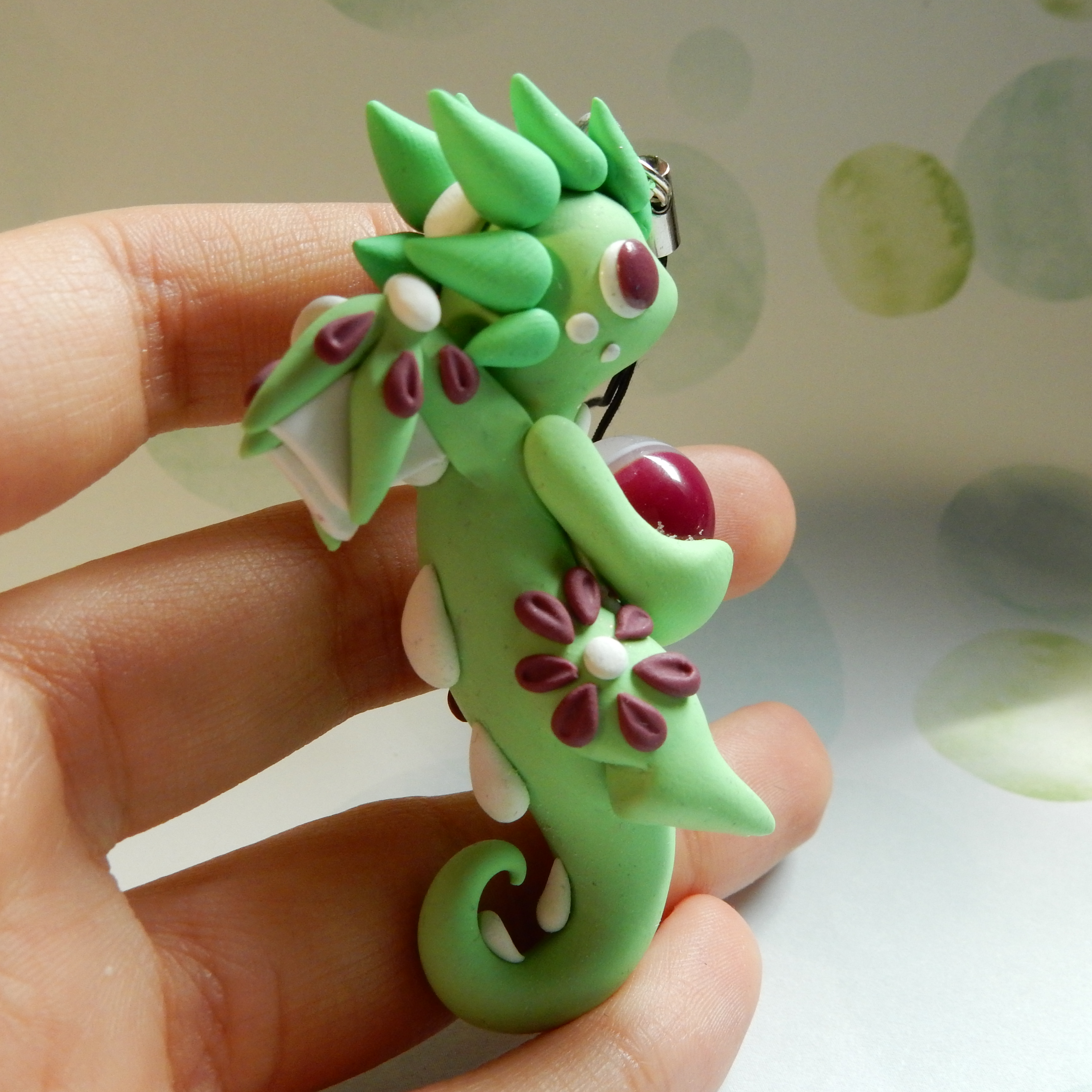 A dragon charm that is handmade from polymer clay. This one light green with maroon flowers on its body.