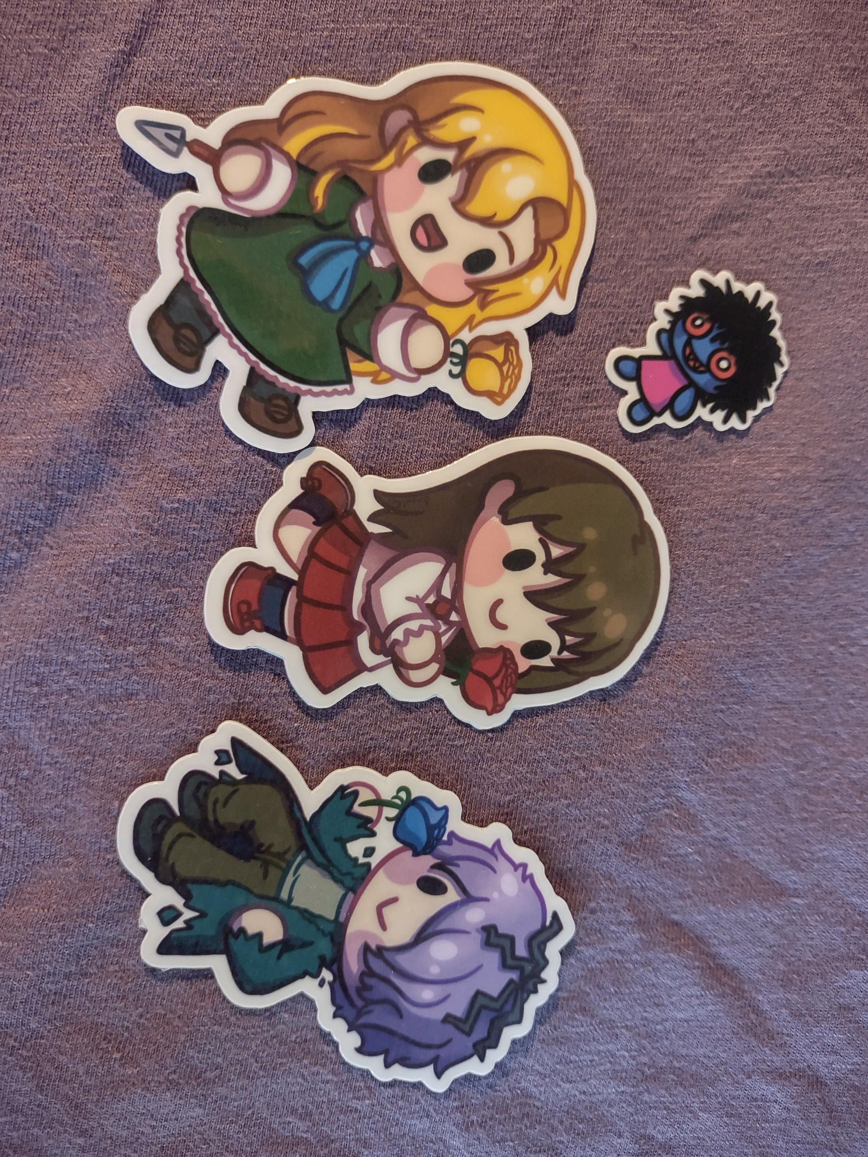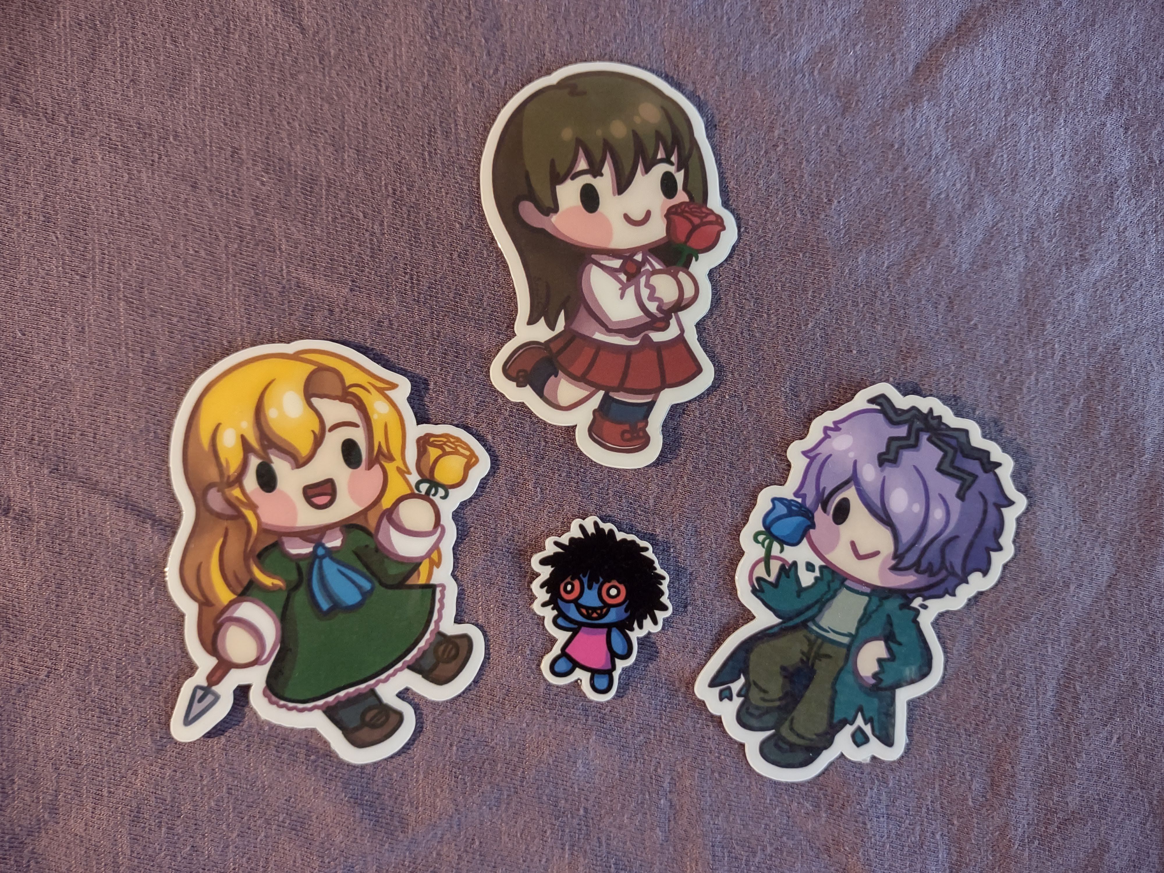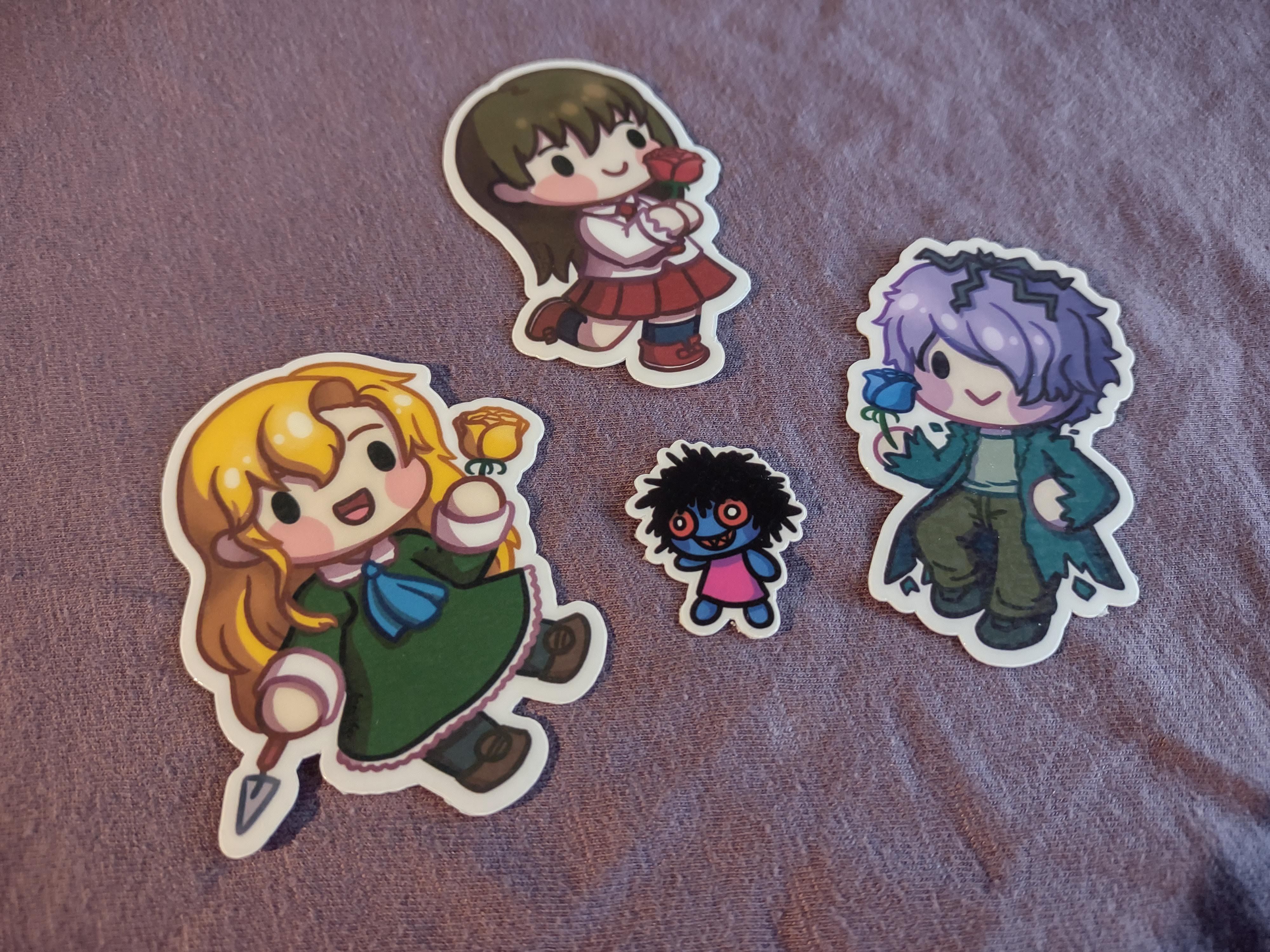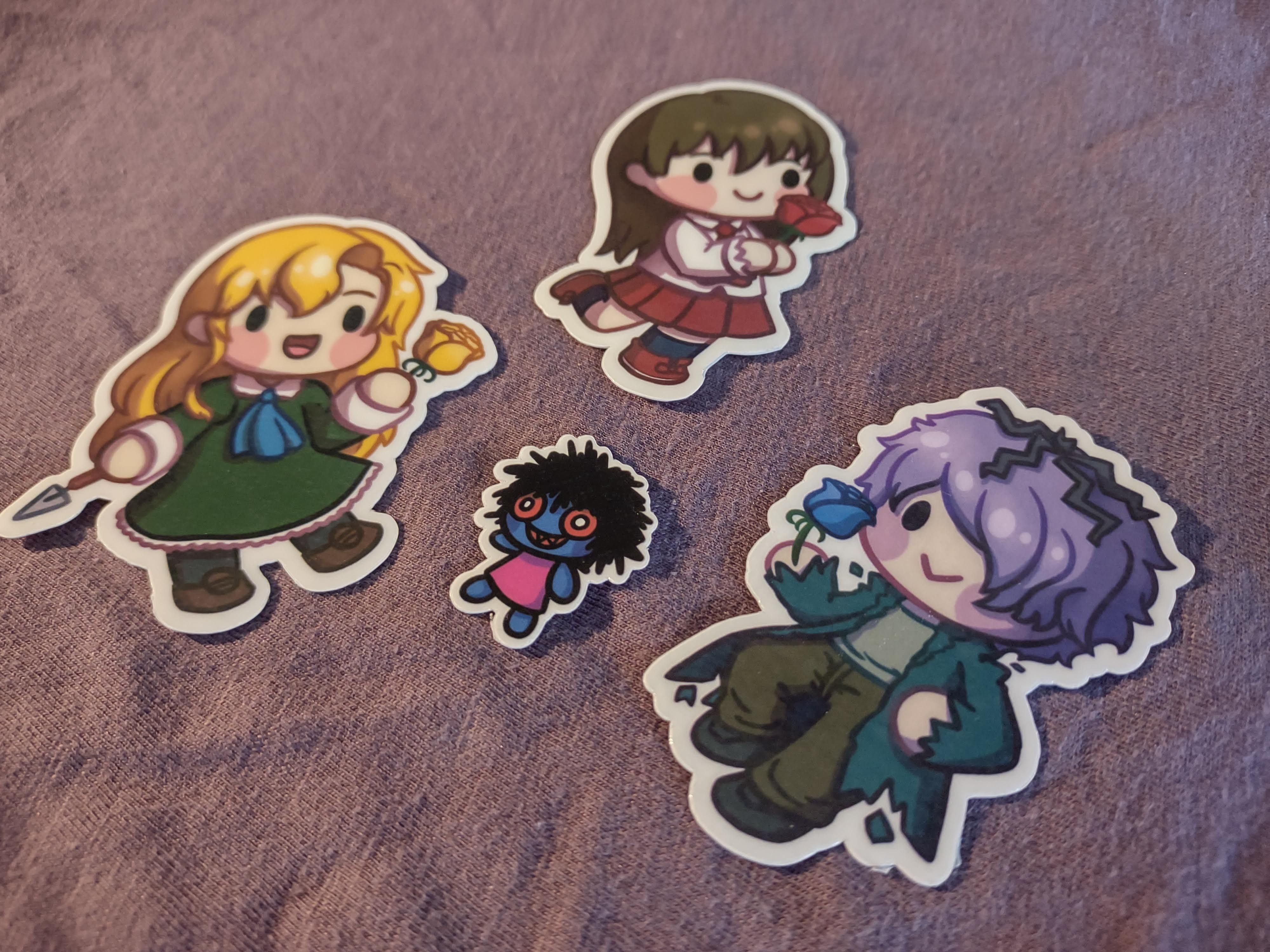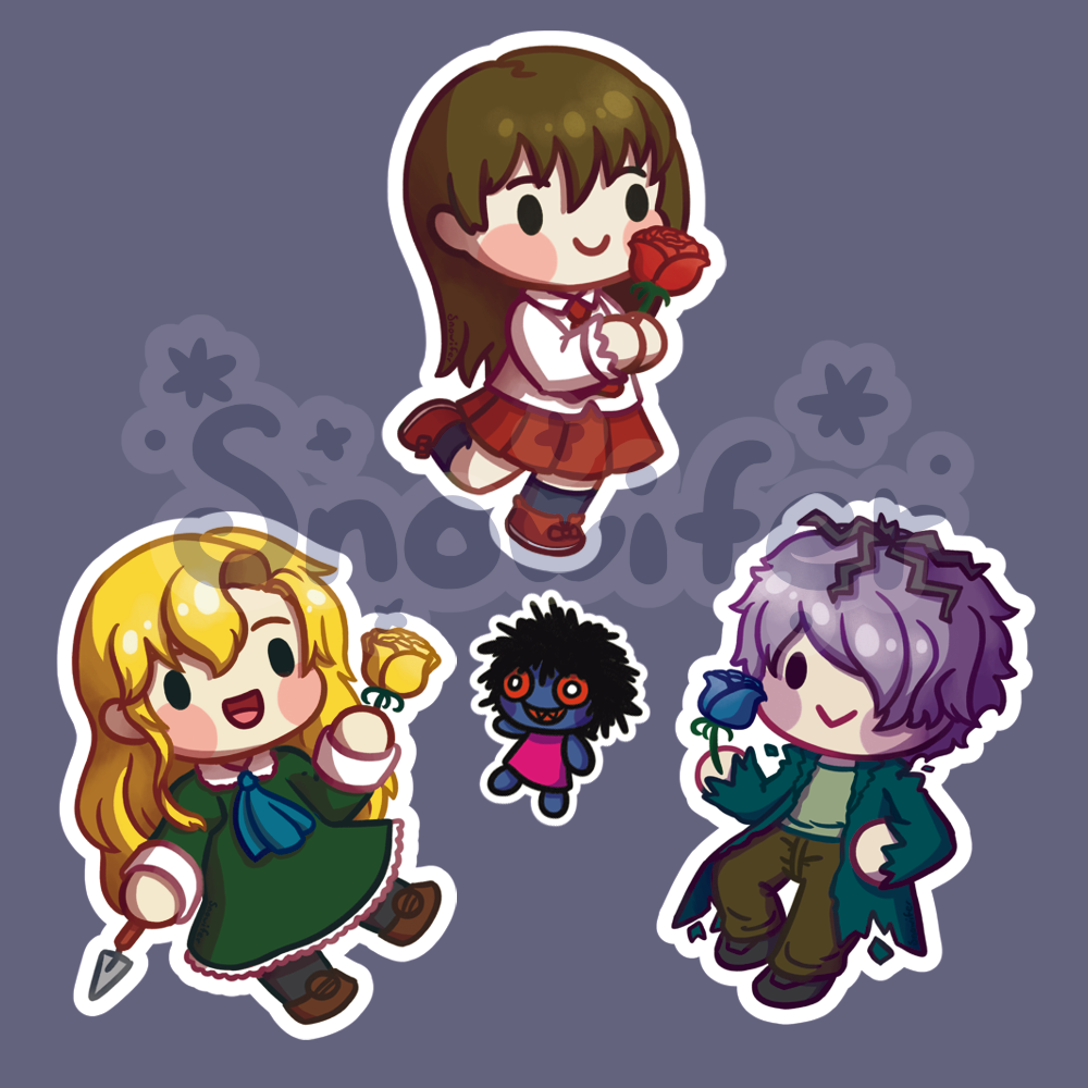 Chibi stickers of the characters from Ib. Orders of all 3 stickers receive a creepy doll sticker! Make sure you select the character(s) you want with the dropdown. Colors may vary slightly from the photos.