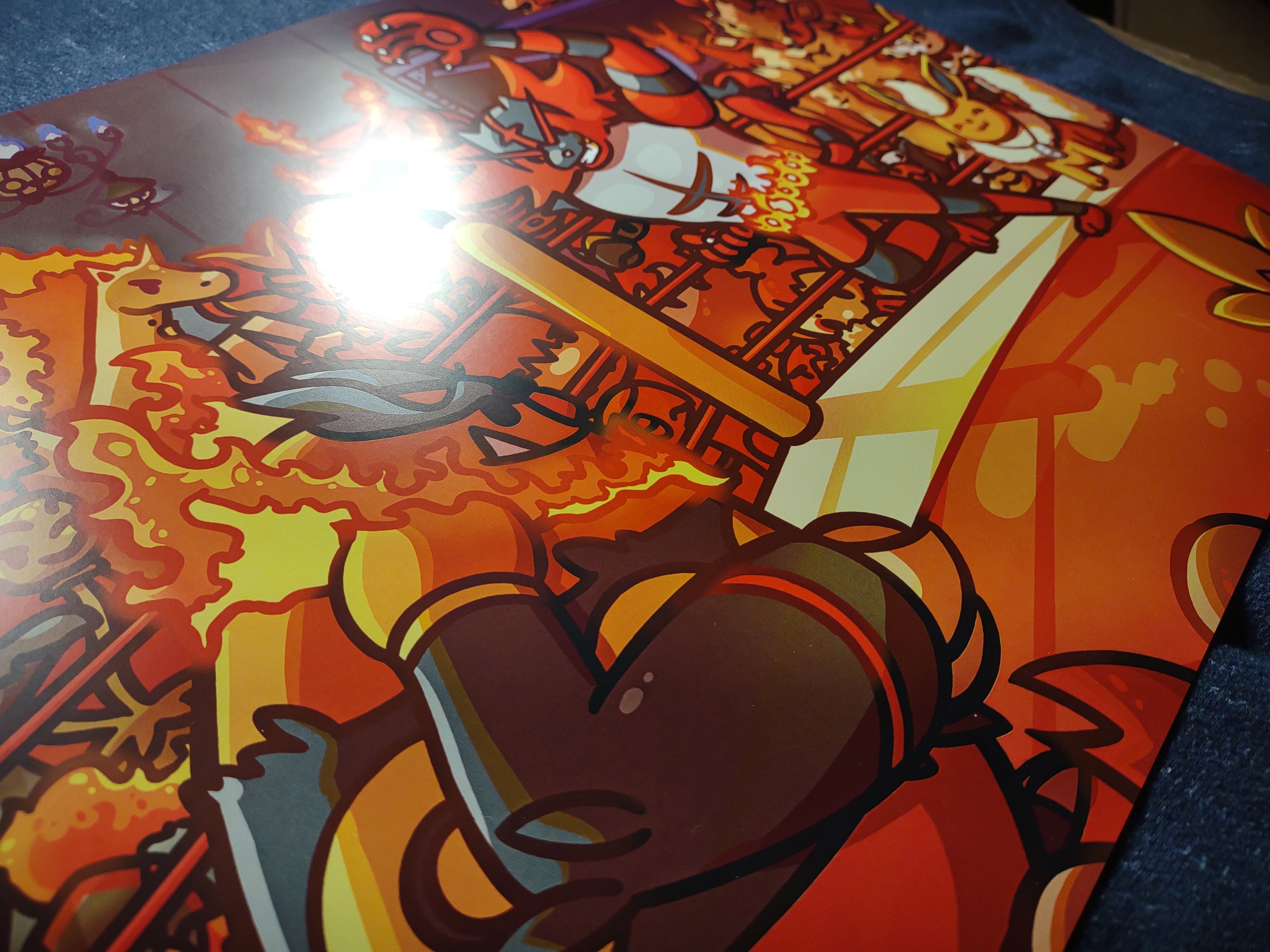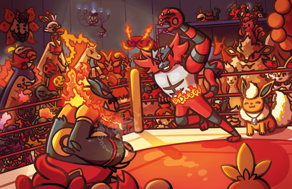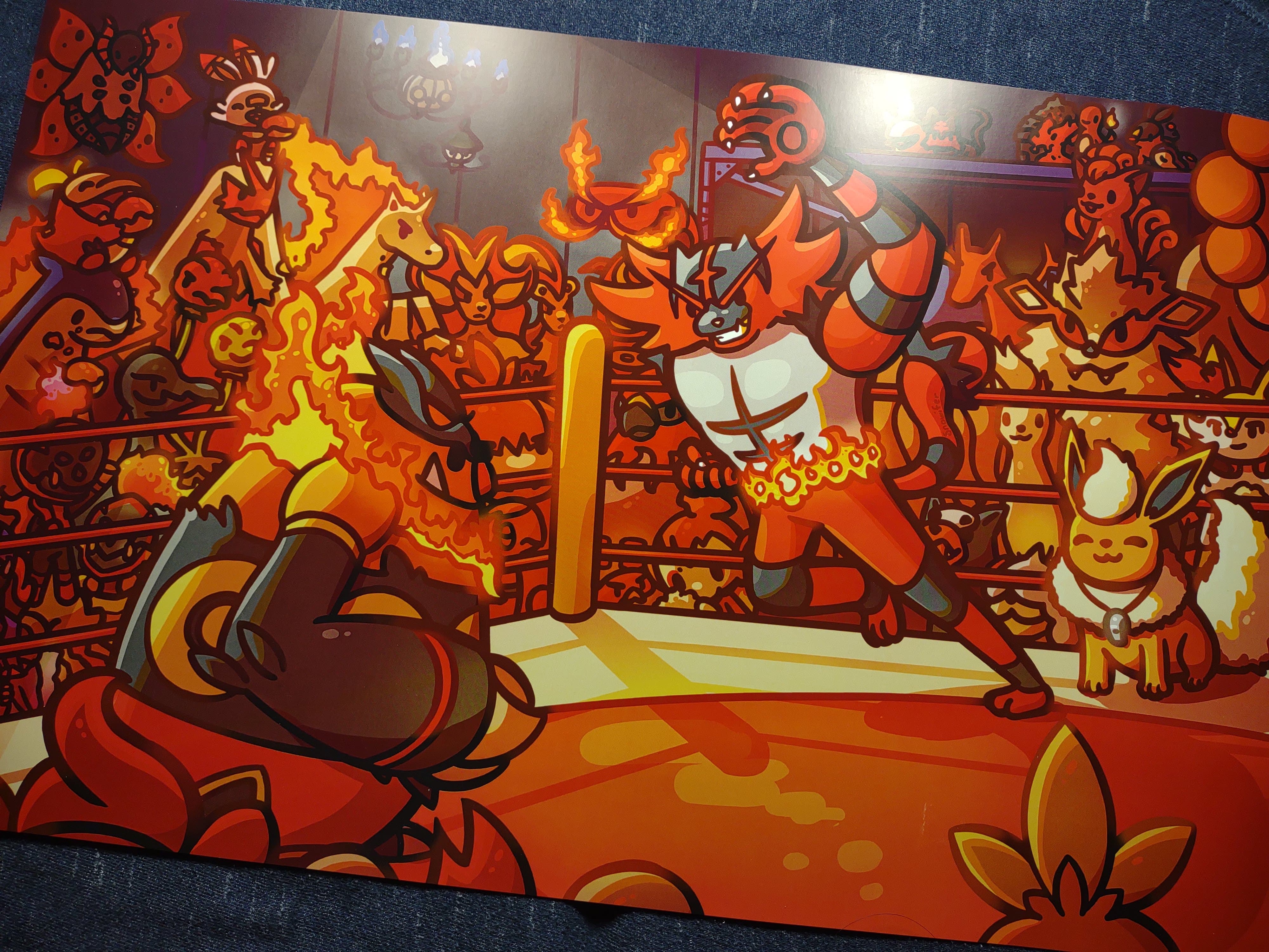 A print of many fire type pokes cheering at a wrestling match