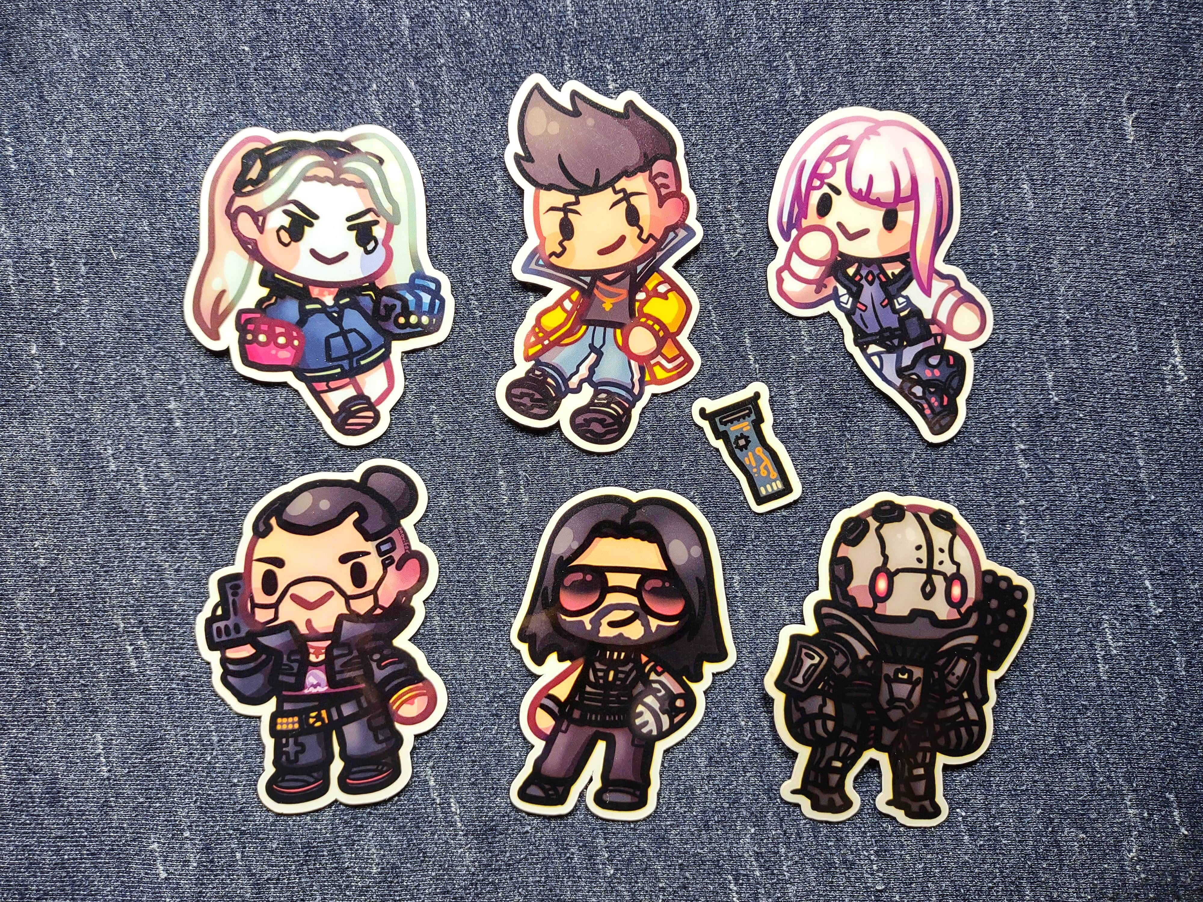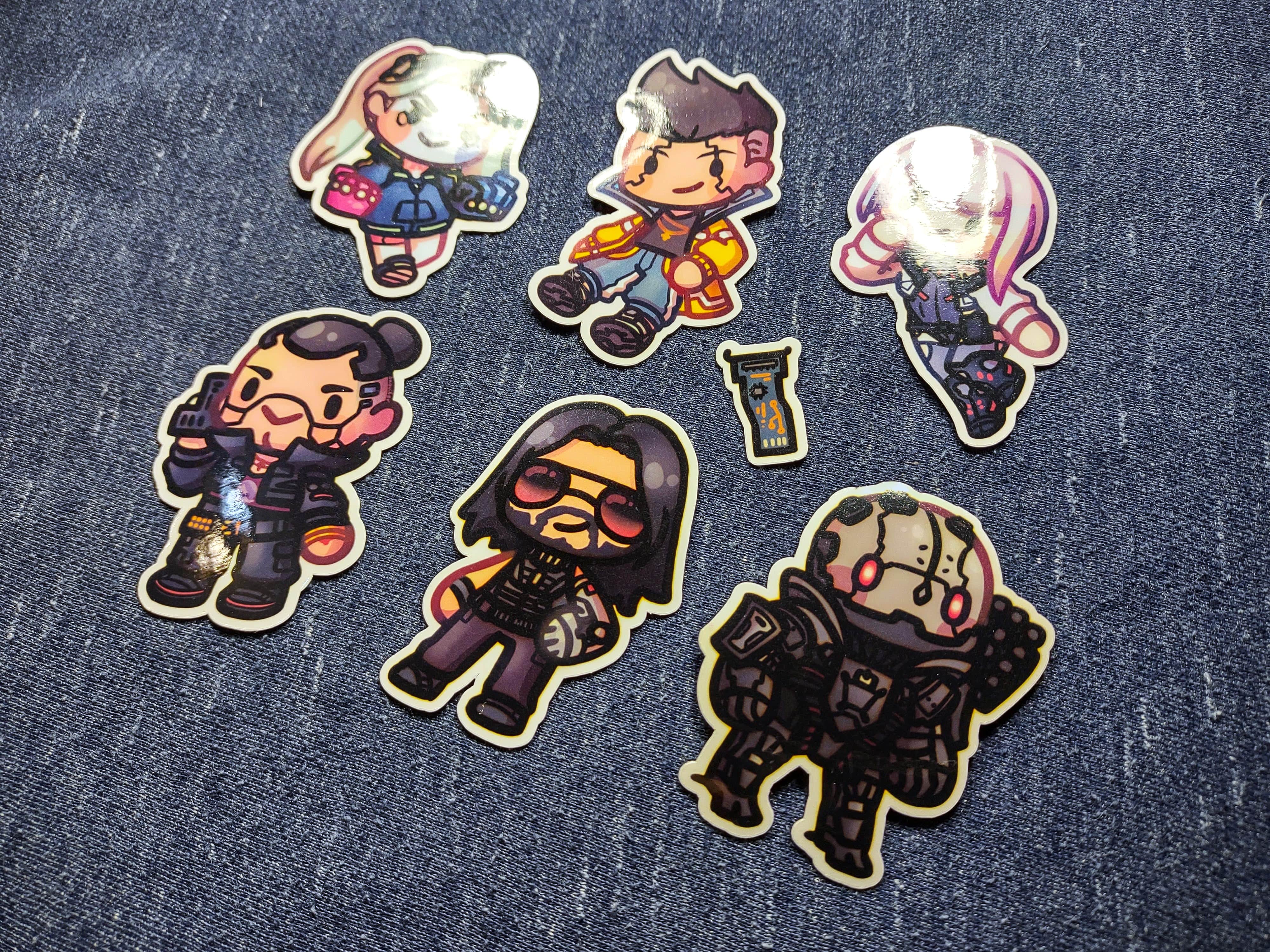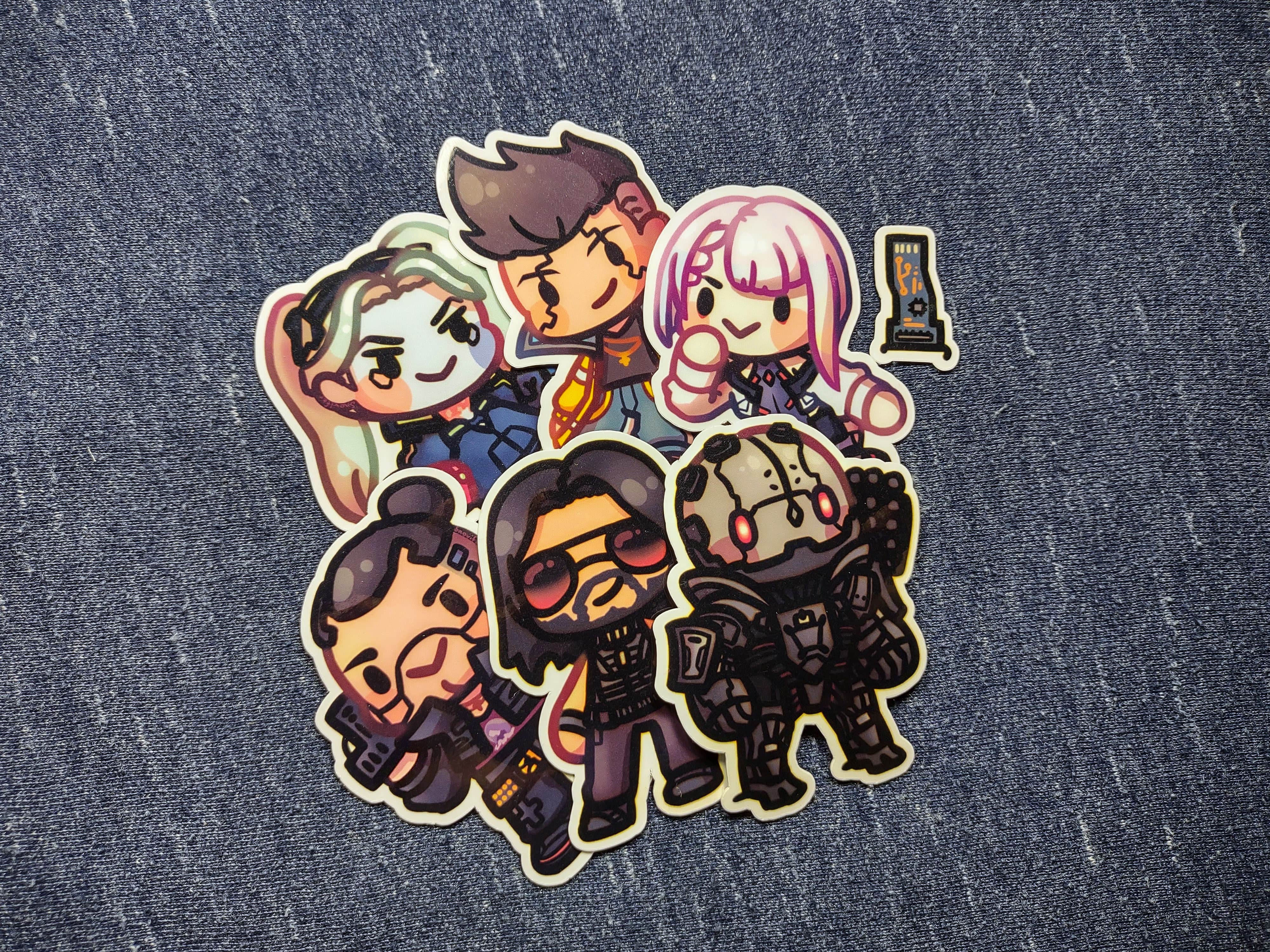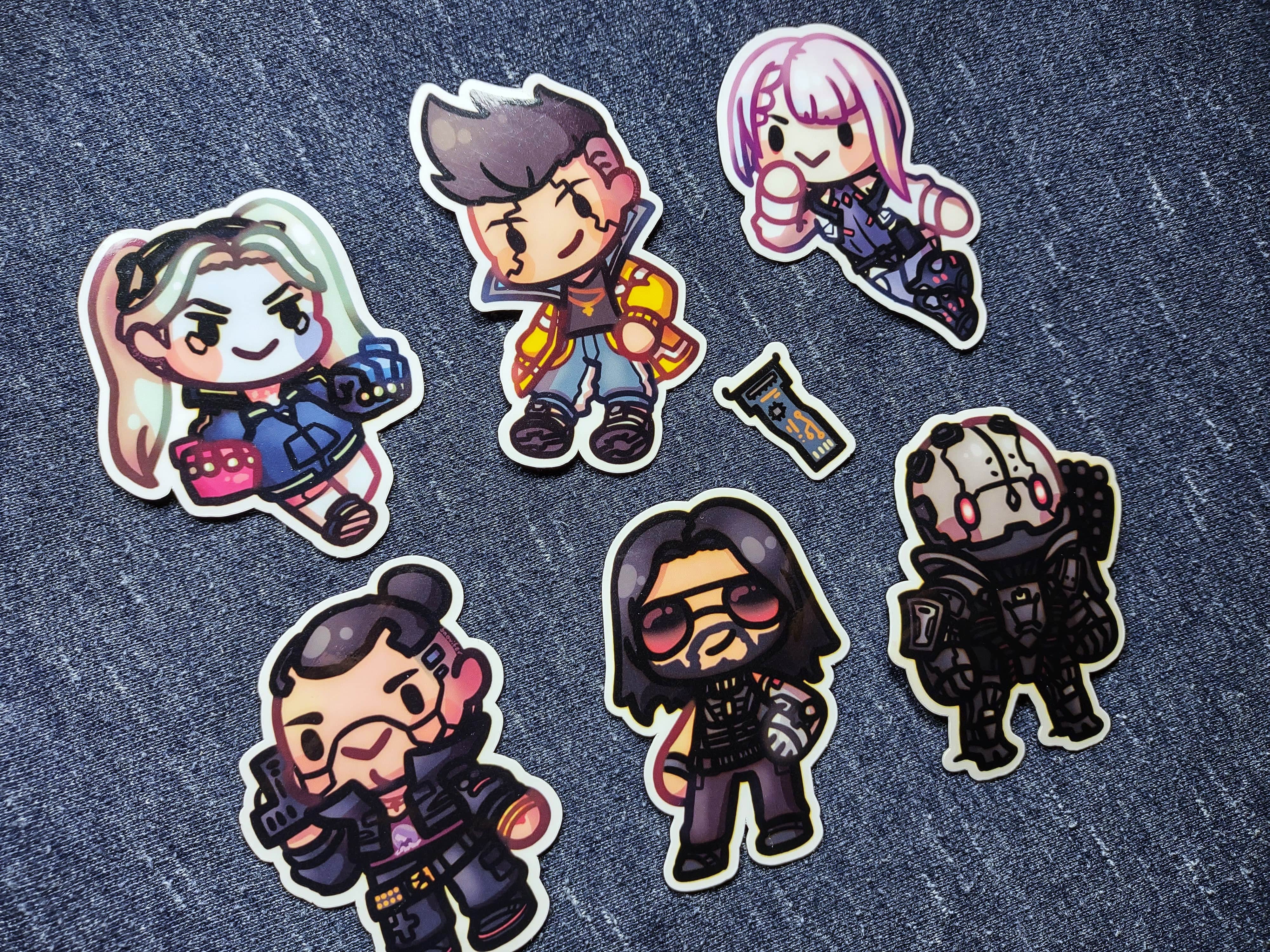 Chibi stickers of characters from Cyberpunk 2077 and Edgerunners. Characters include David Martinez, Lucy, Rebecca, Jackie, Adam Smasher, and Johnny Silverhand. Orders of all characters will include a mini data shard sticker.