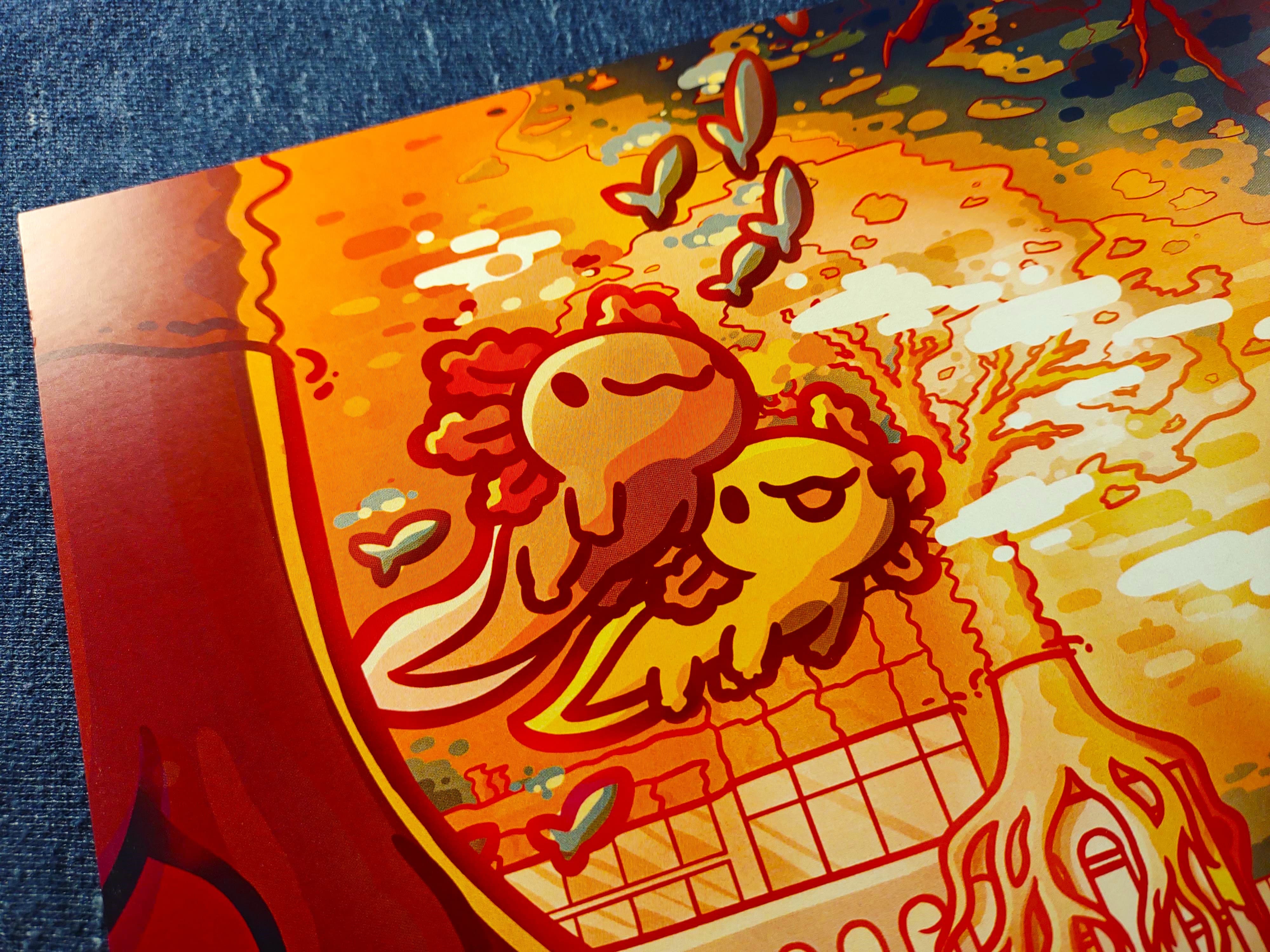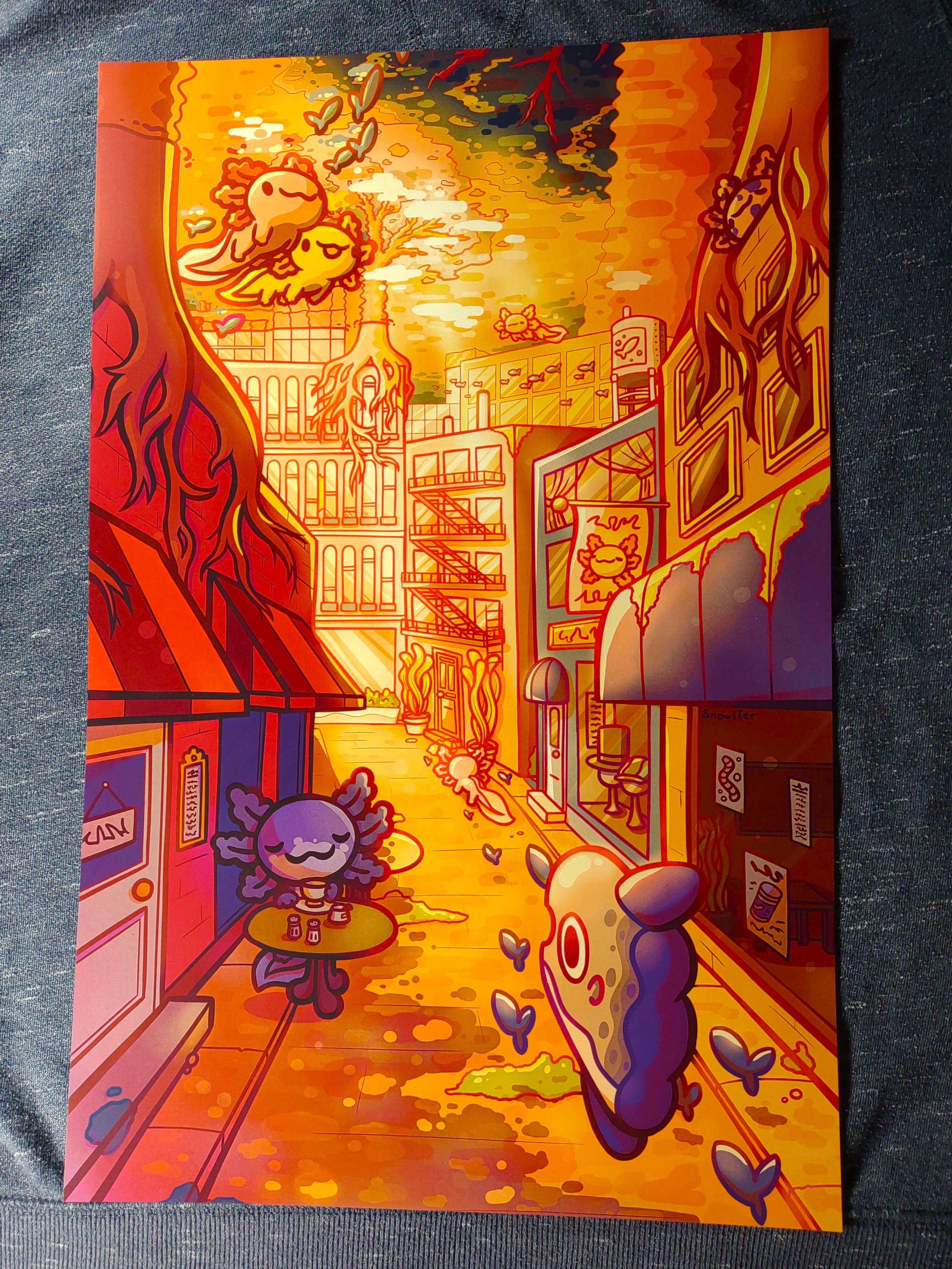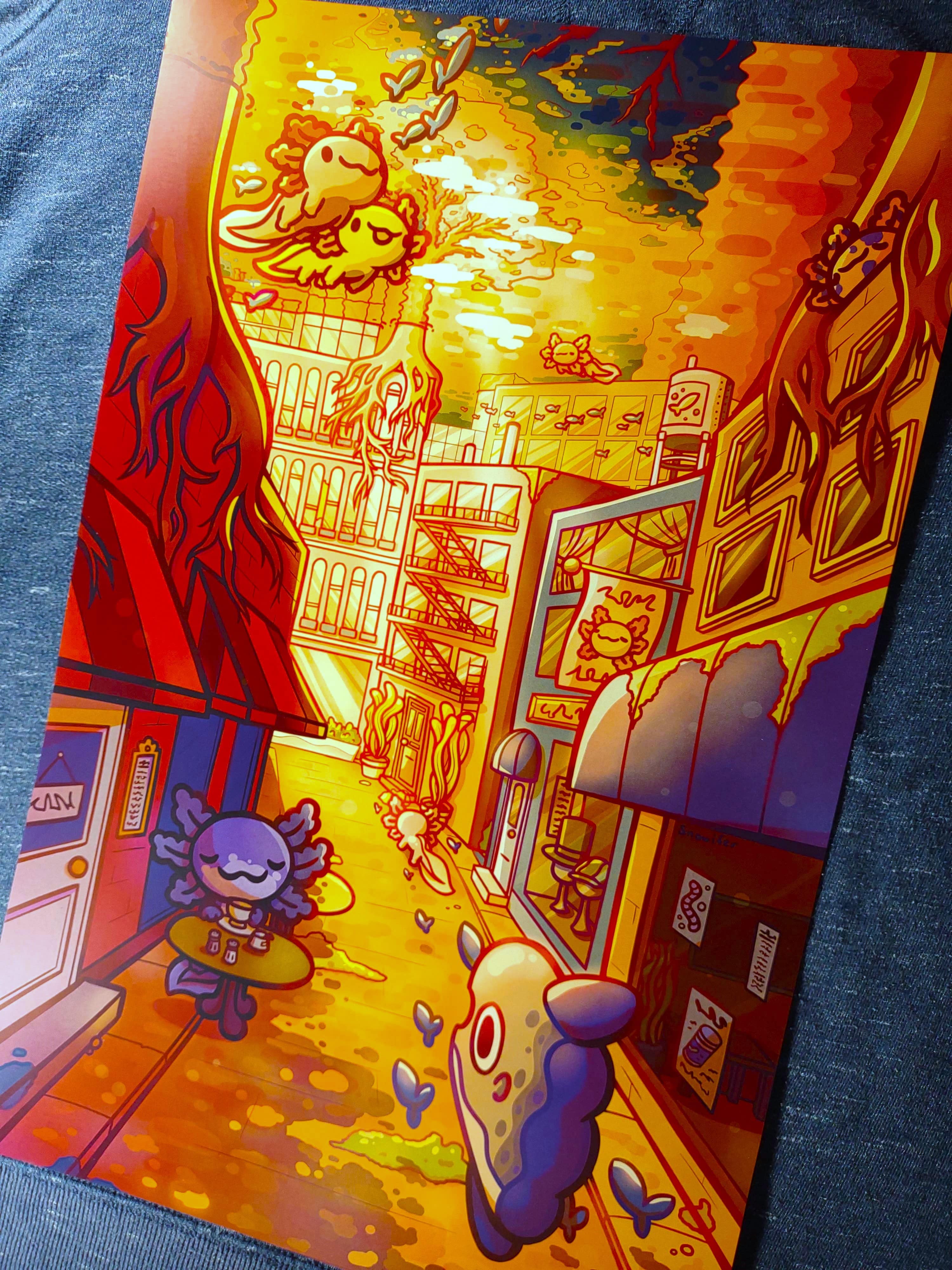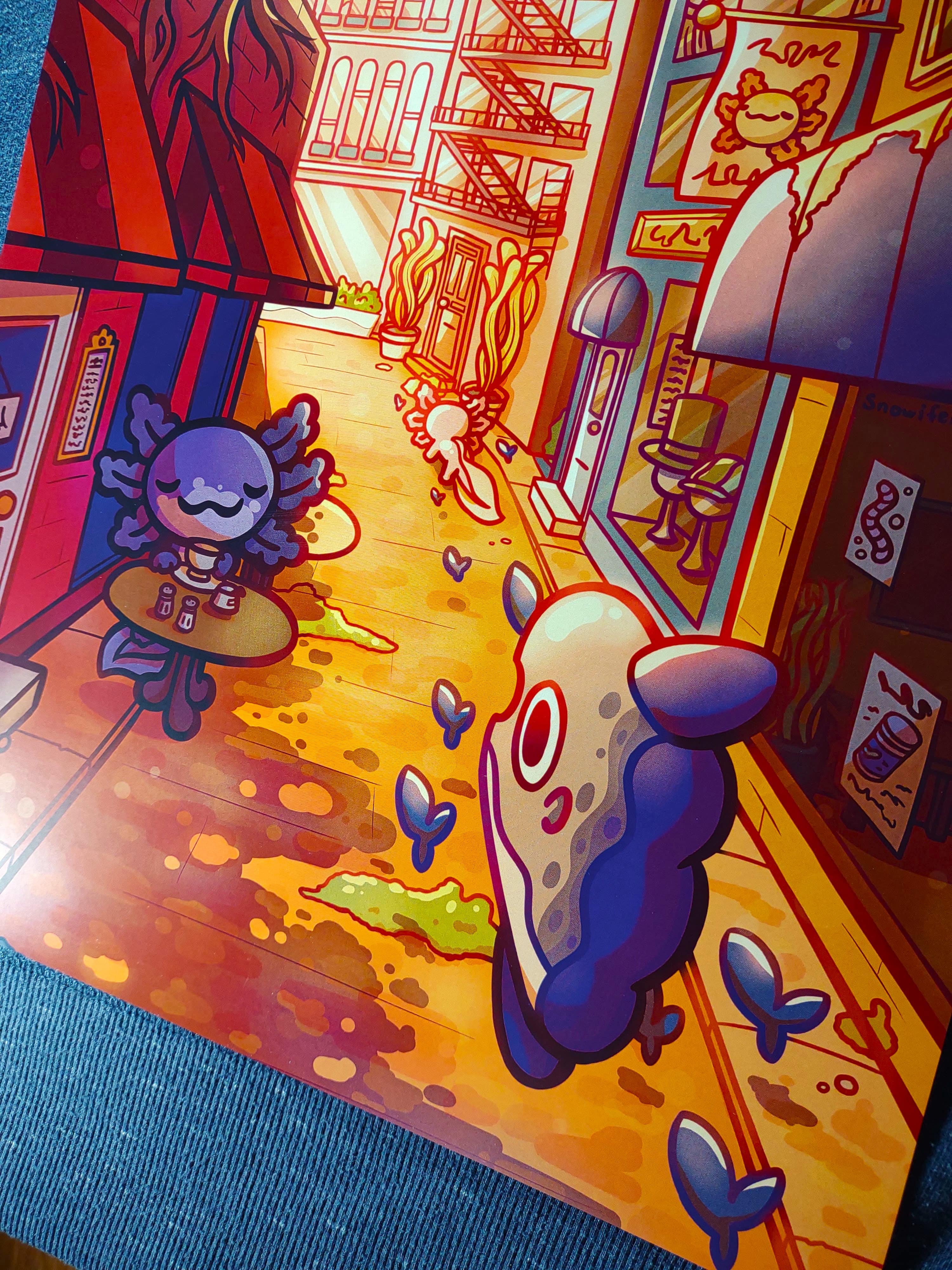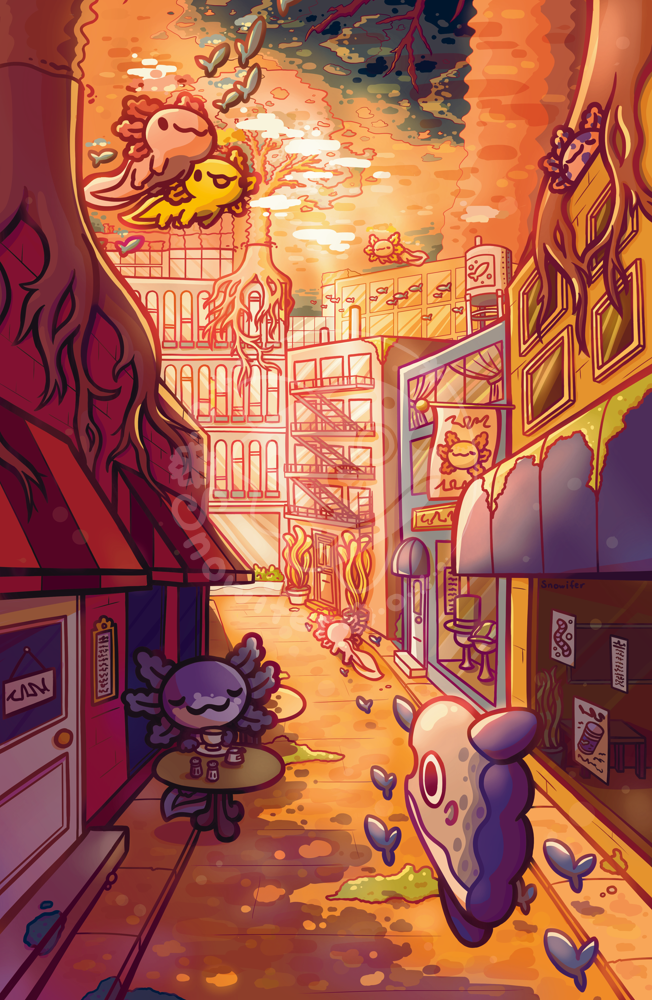 A warm print of a mola swimming down an underwater street willed with happy axolotls.