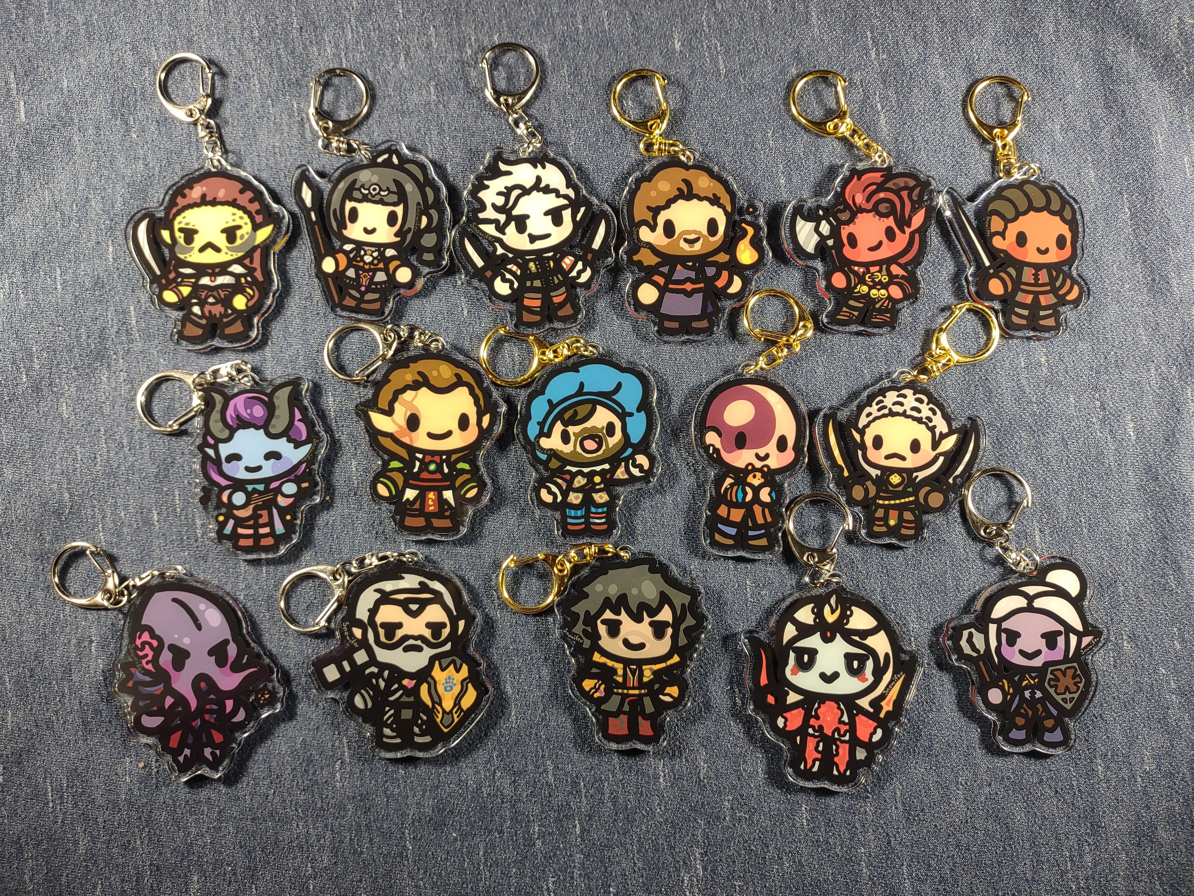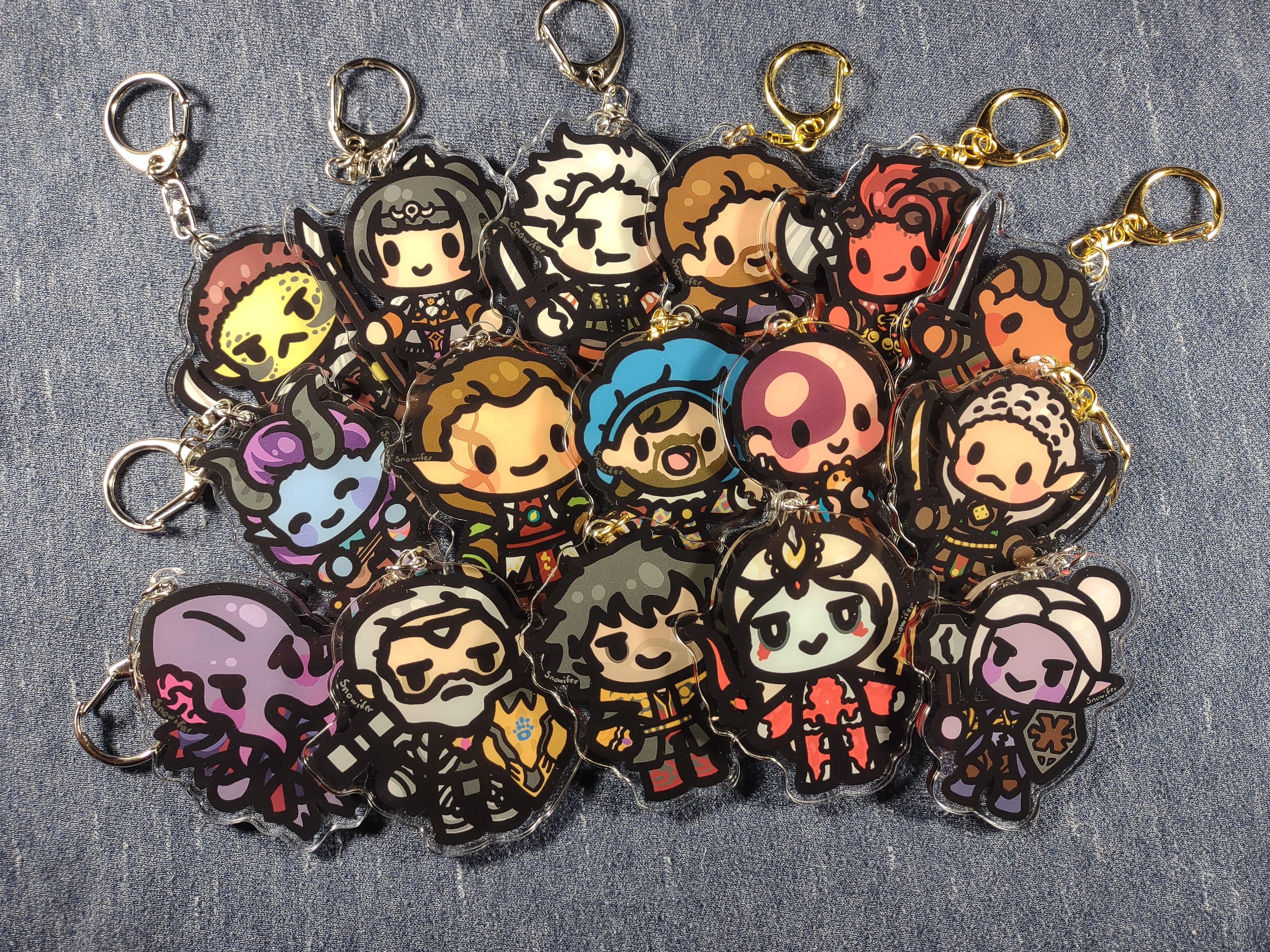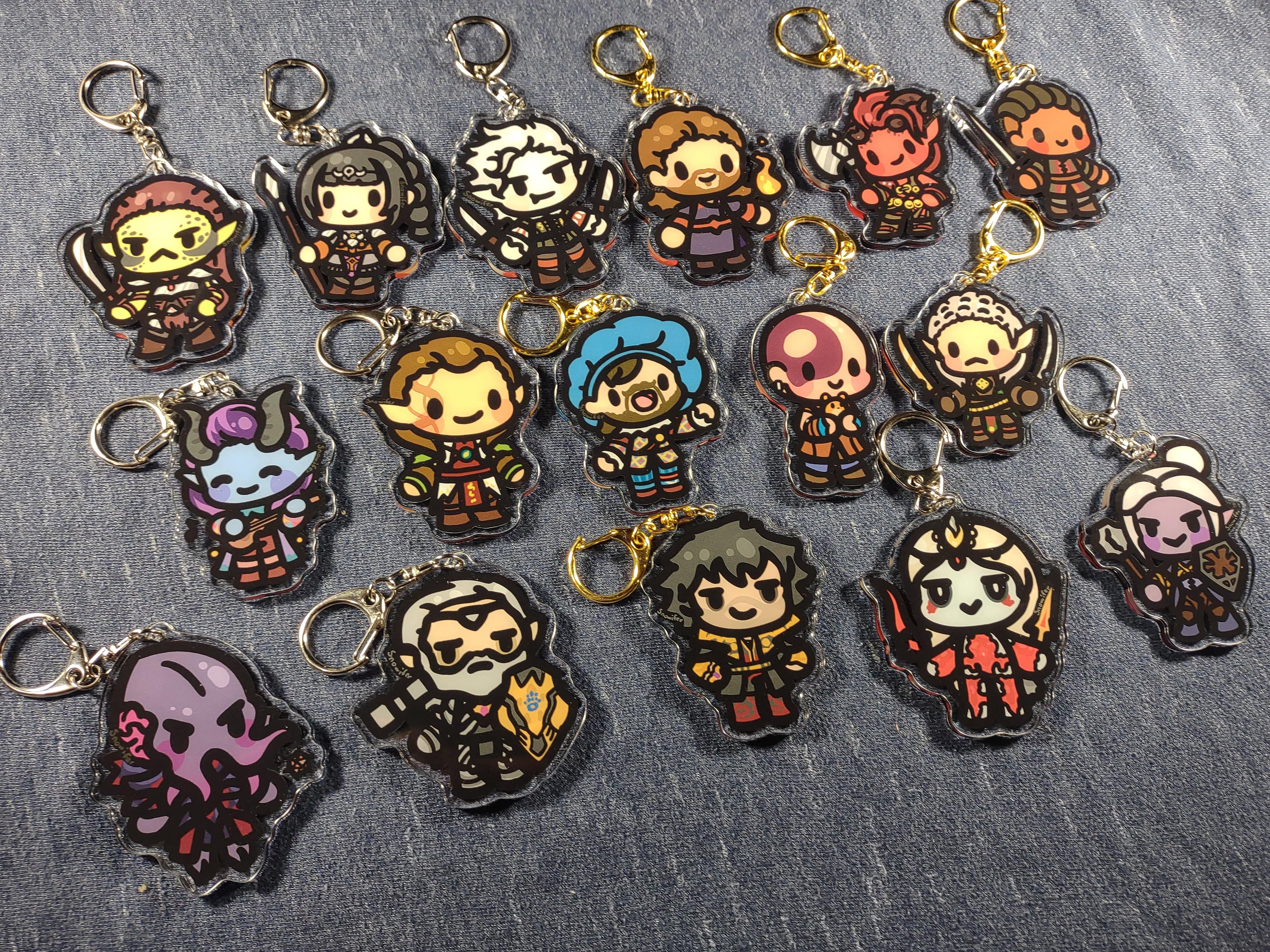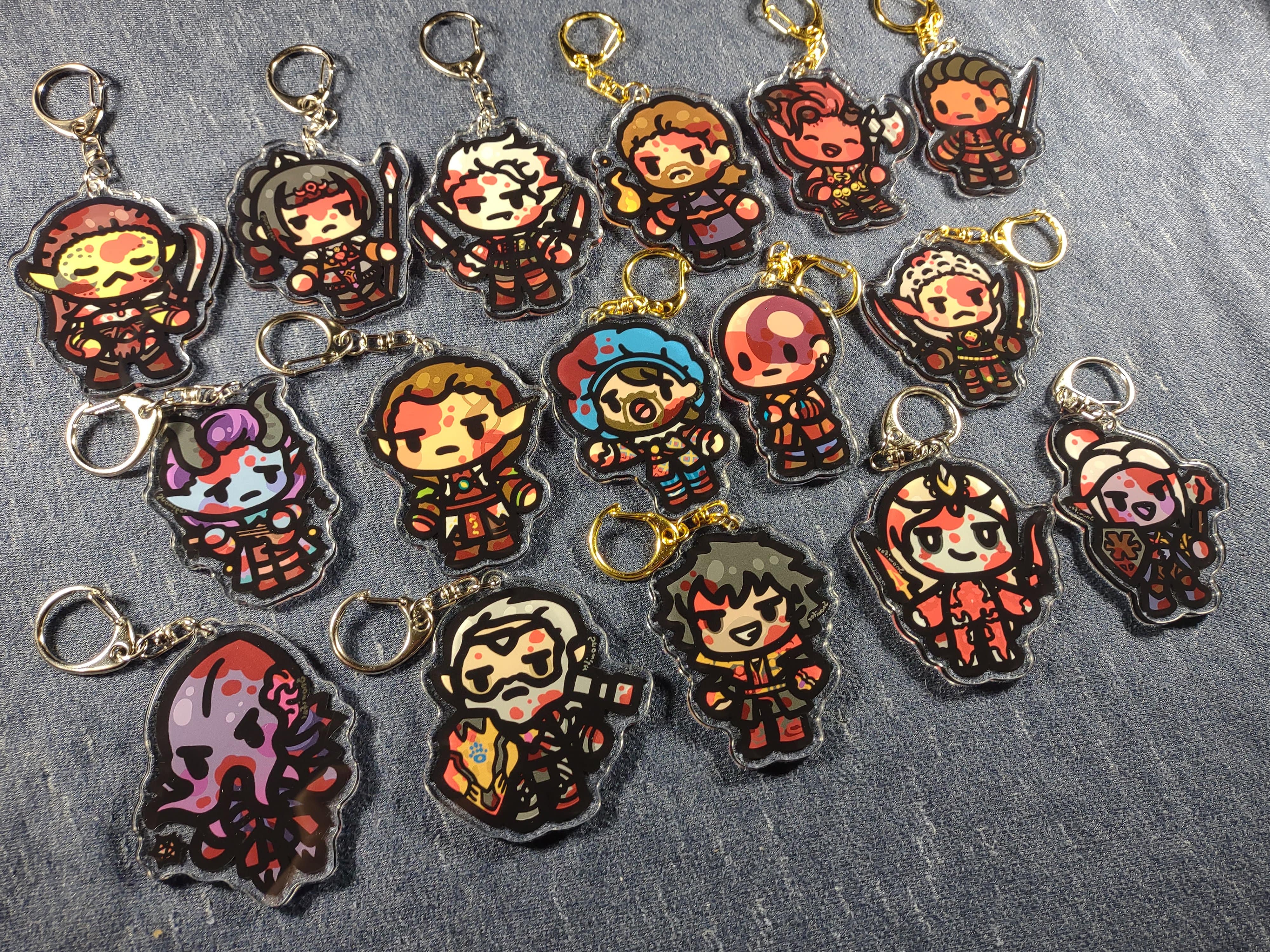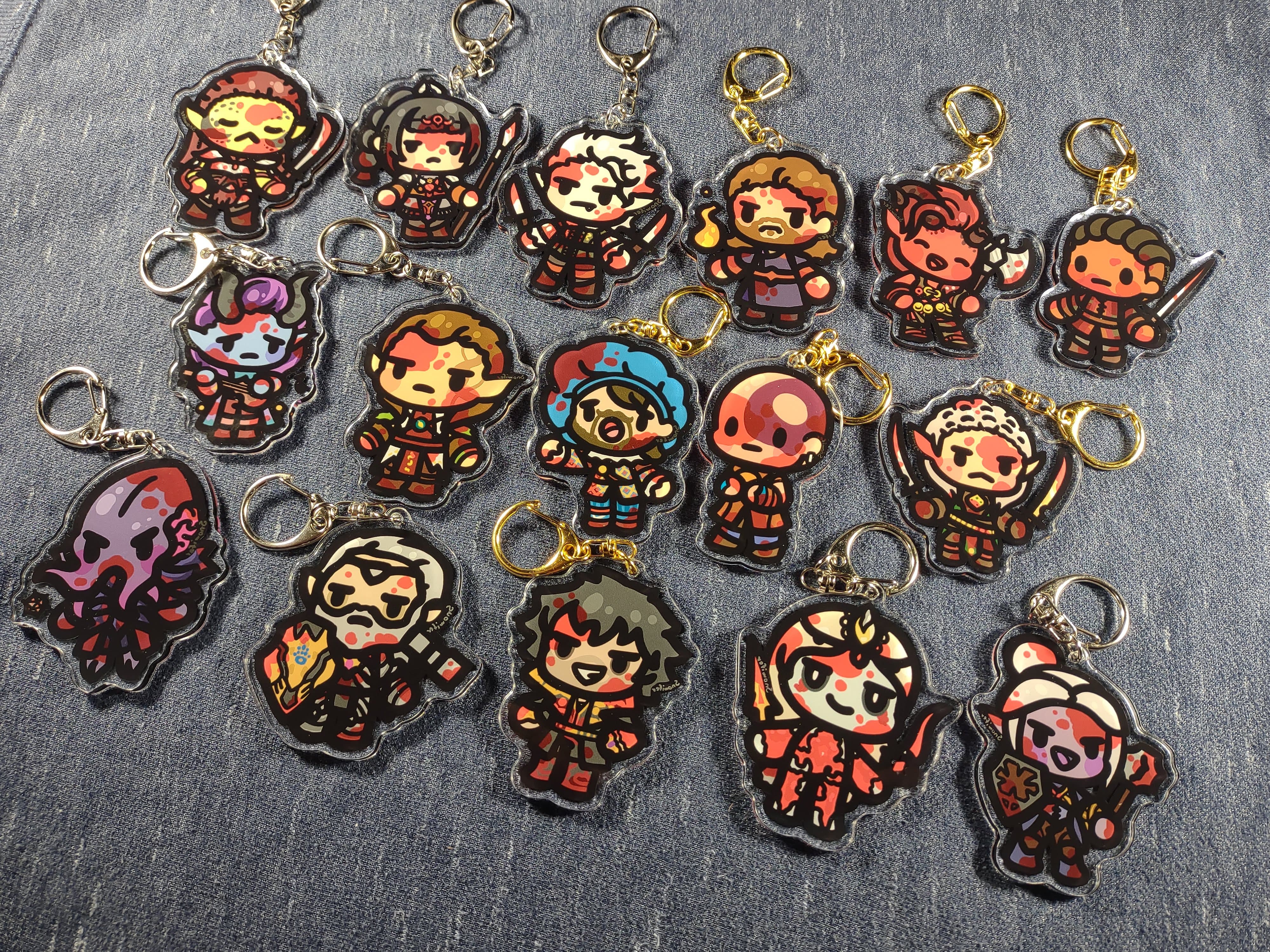 Chibi keychains of the cast from BG3! The backside features the cast covered in blood.