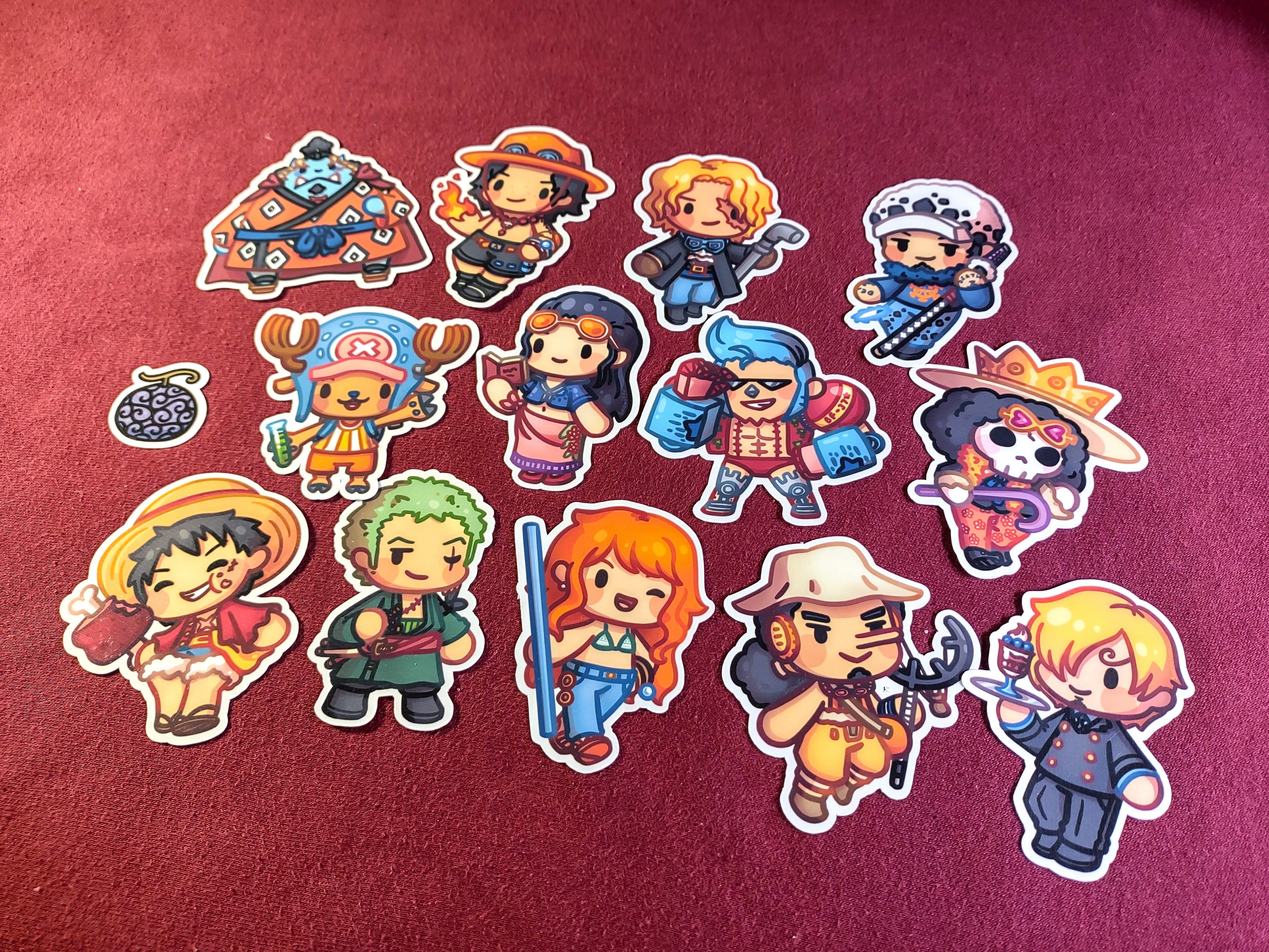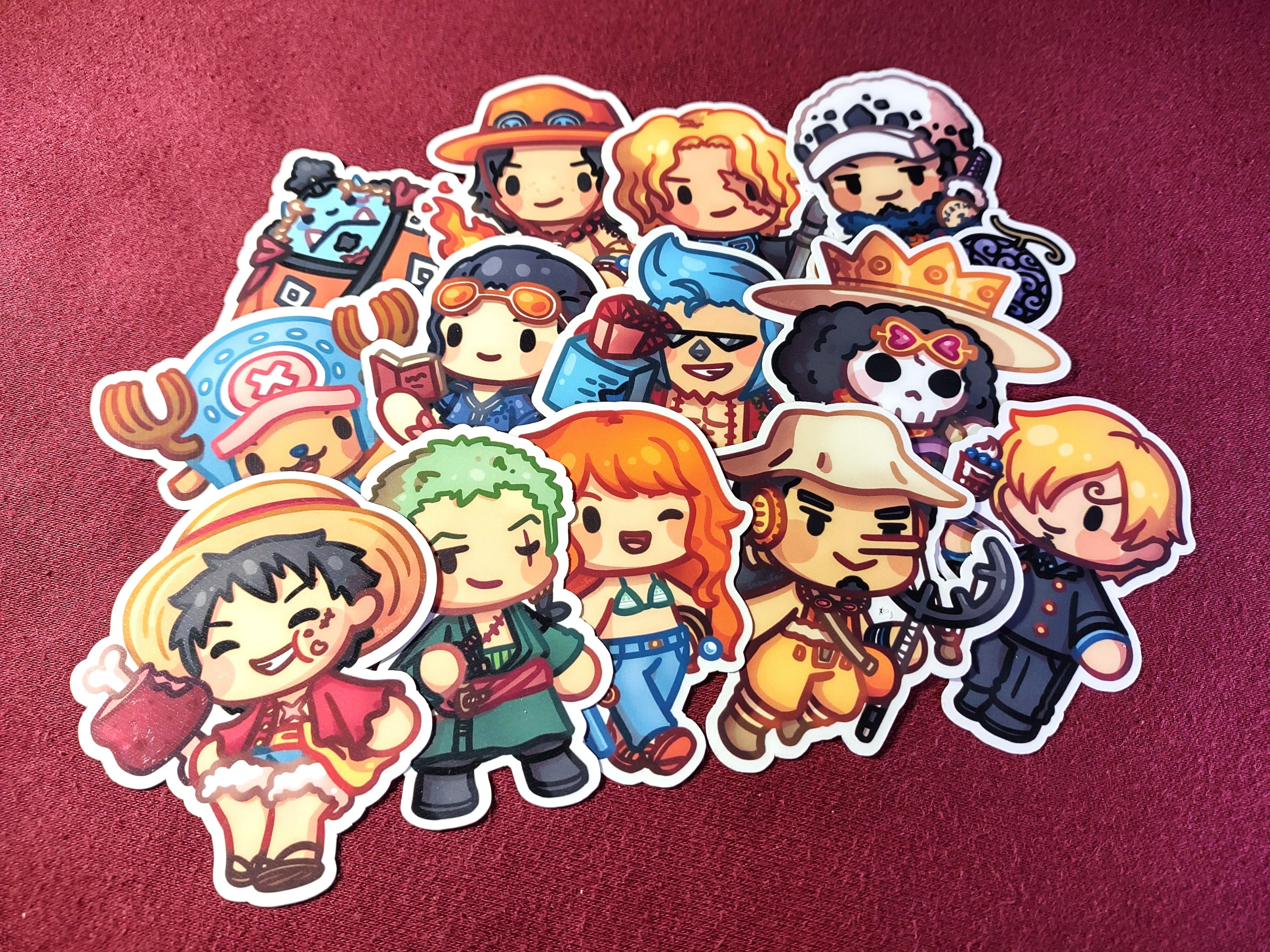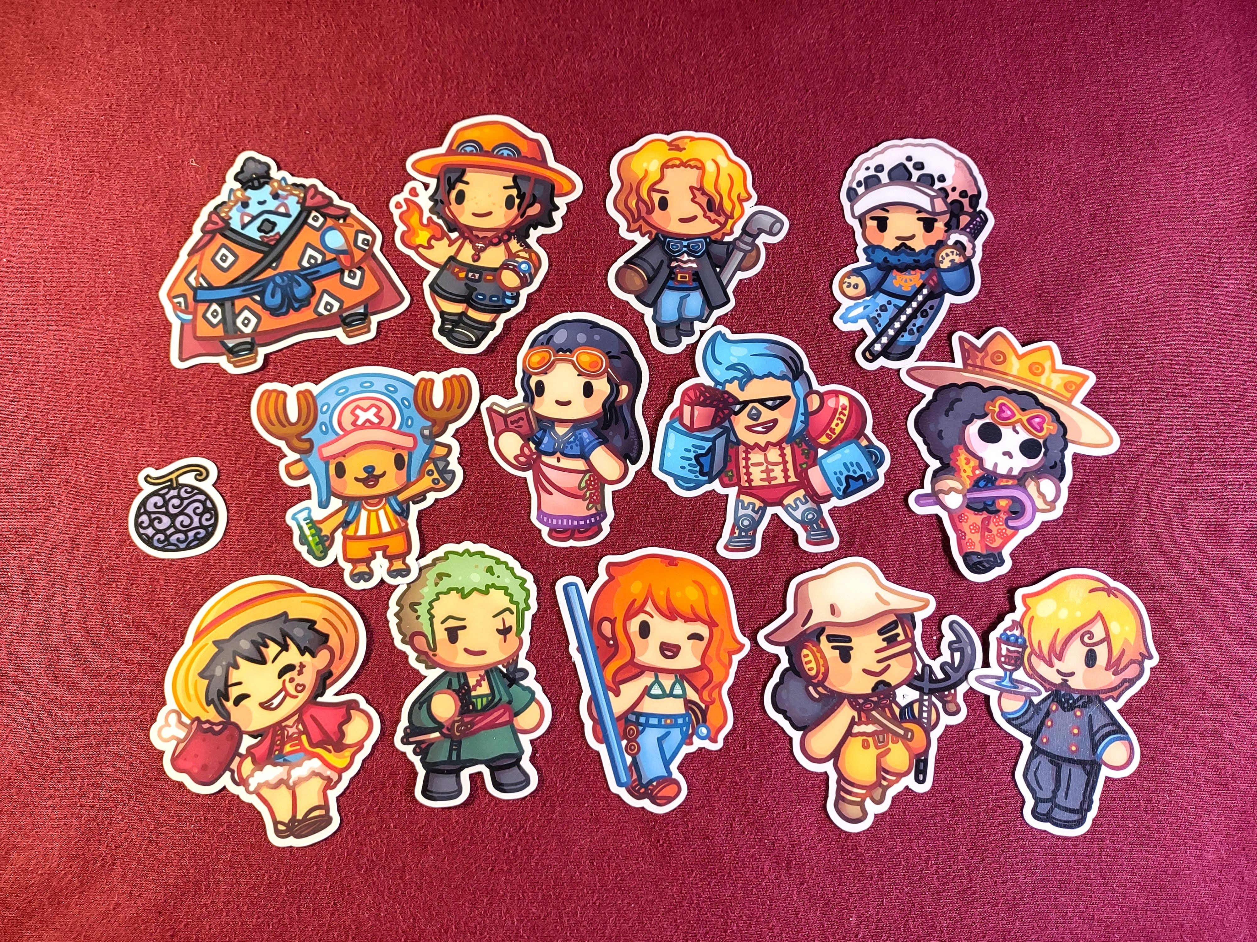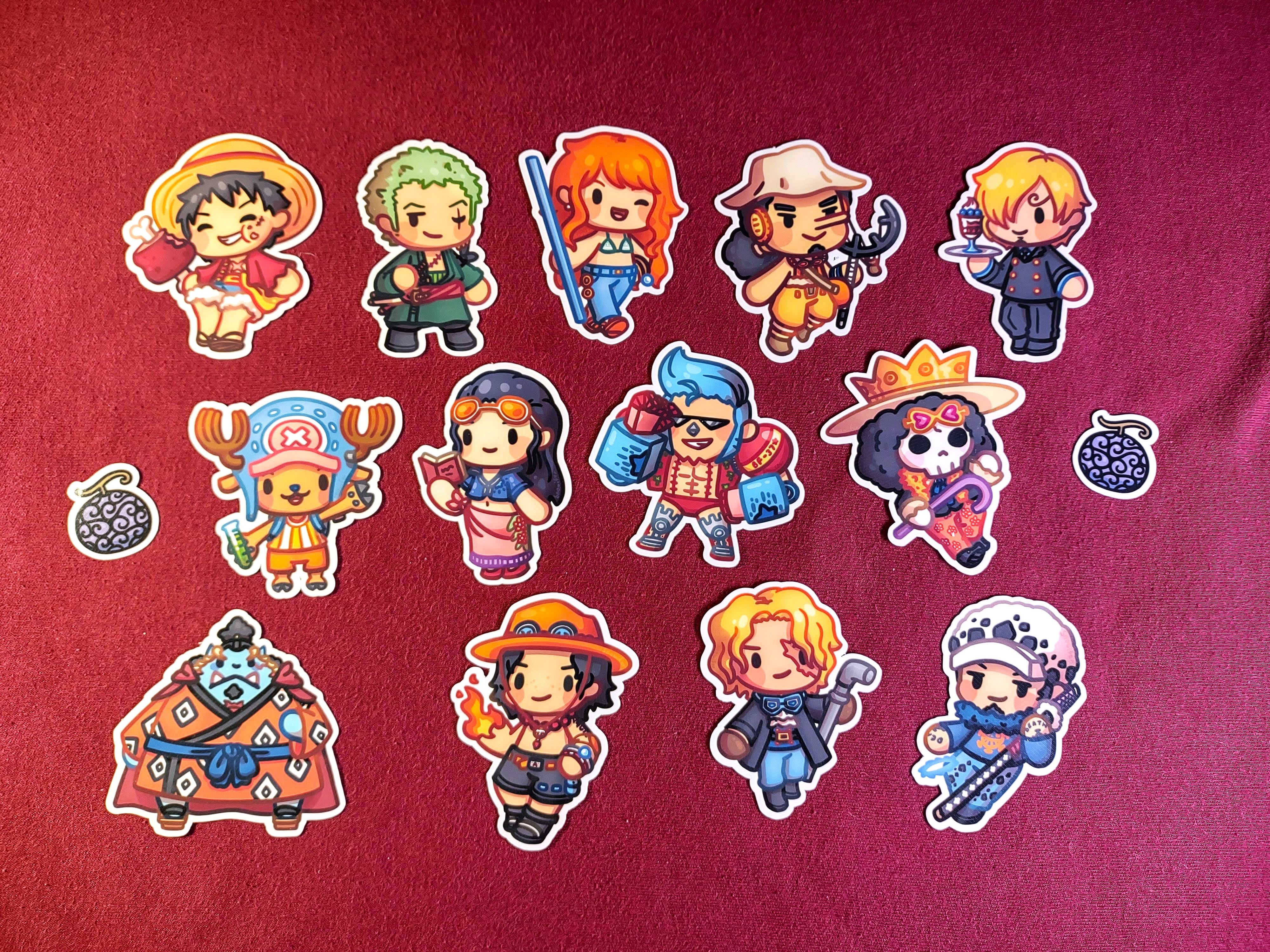 Chibi stickers of the characters from One Piece. Characters include Luffy, Zoro, Nami, Usopp, Sanji, Chopper, Robin, Franky, Brook. Jinbe, Ace, Sabo, and Law.