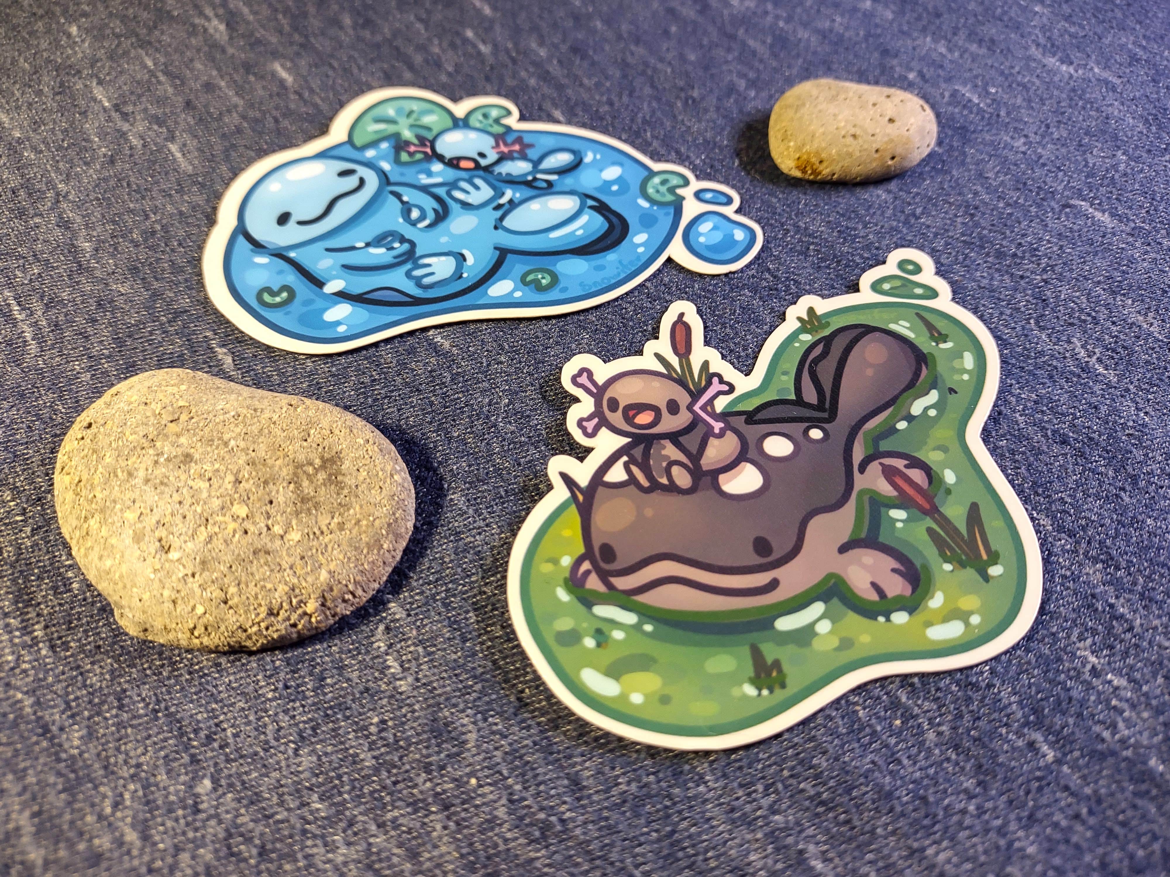 Stickers of the different woopers and their respective evolutions chilling in a pond.