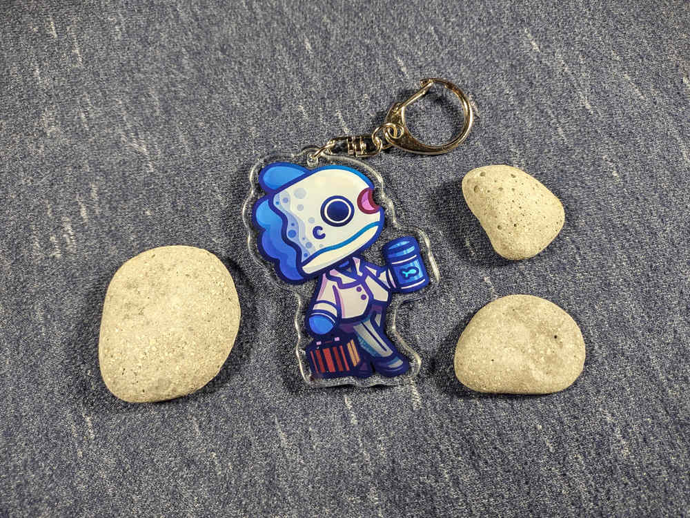 A 2.5 inch acrylic keychain of a business mola doing business things.